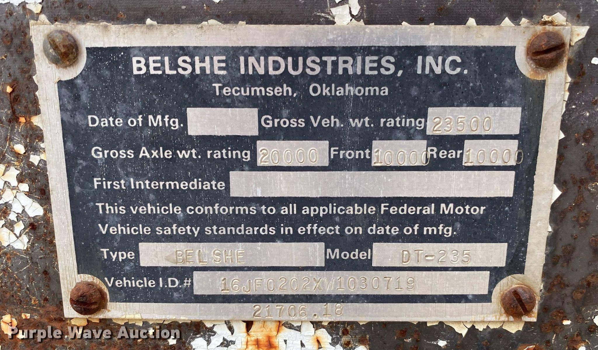 Purple Wave is selling a used Equip. Trailer in Oklahoma. This item is a 1998 Belshe DT-235 equipment trailer with the following: VIN: 16JF0202XW1030719, Unit #: 102