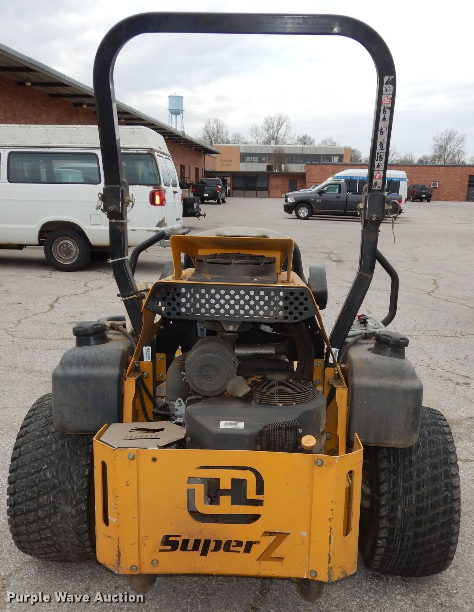 Hustler Super Z ZTR lawn mower. Hours: 918 on meter, Cutting width: 72", Serial: 12051136. Engine Kawasaki , Displacement: 999 cc, Fuel type: Gas. Transmission Hydrostatic. Tires Front: 13x6.50-6, Rear: 26x12.00-12, Brand: Grassmaster. Notes Engine issues, backfires, Seat safety switch issues. Osawatomie, KS 66064
