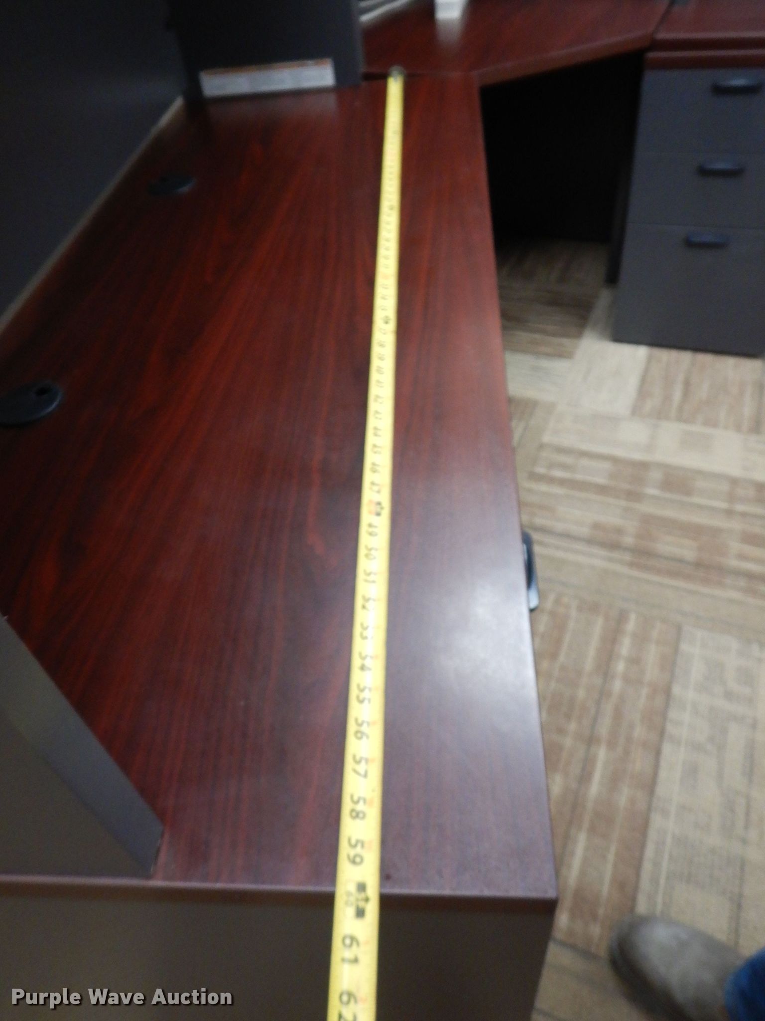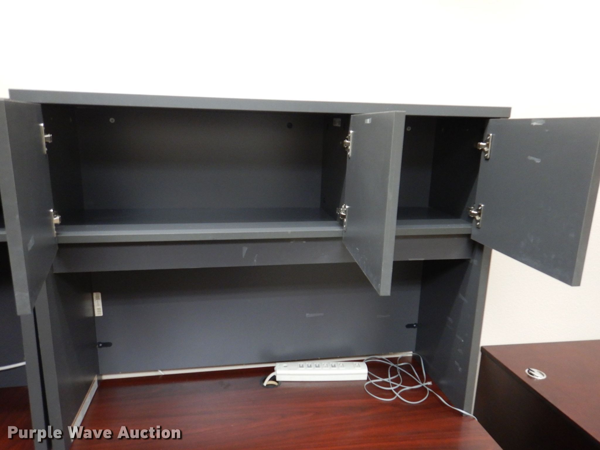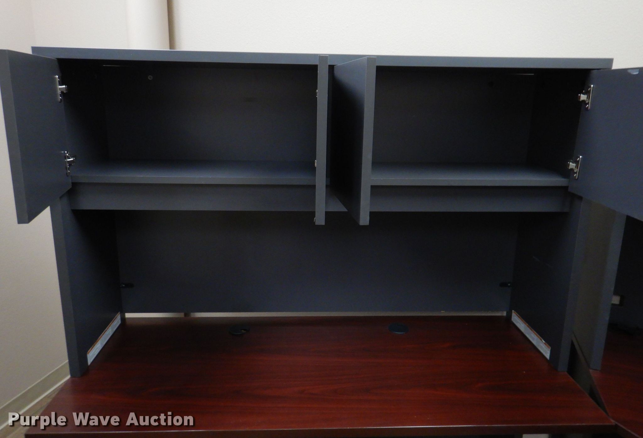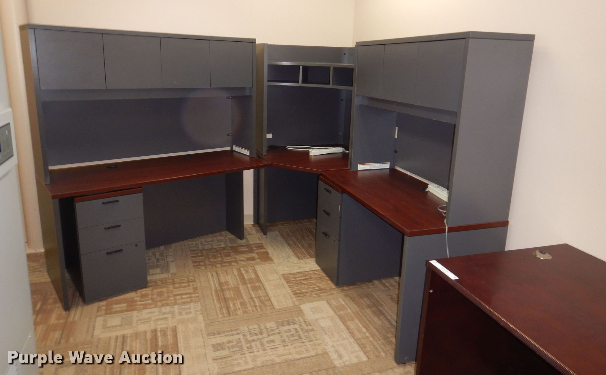 Purple Wave is selling a used Furniture in Iowa. This item is a Office furniture with the following: (3) desks, 2' x 4', 3' x 3', 2' x 5', (3) hutches, (2) cabinets, 30" x 65"