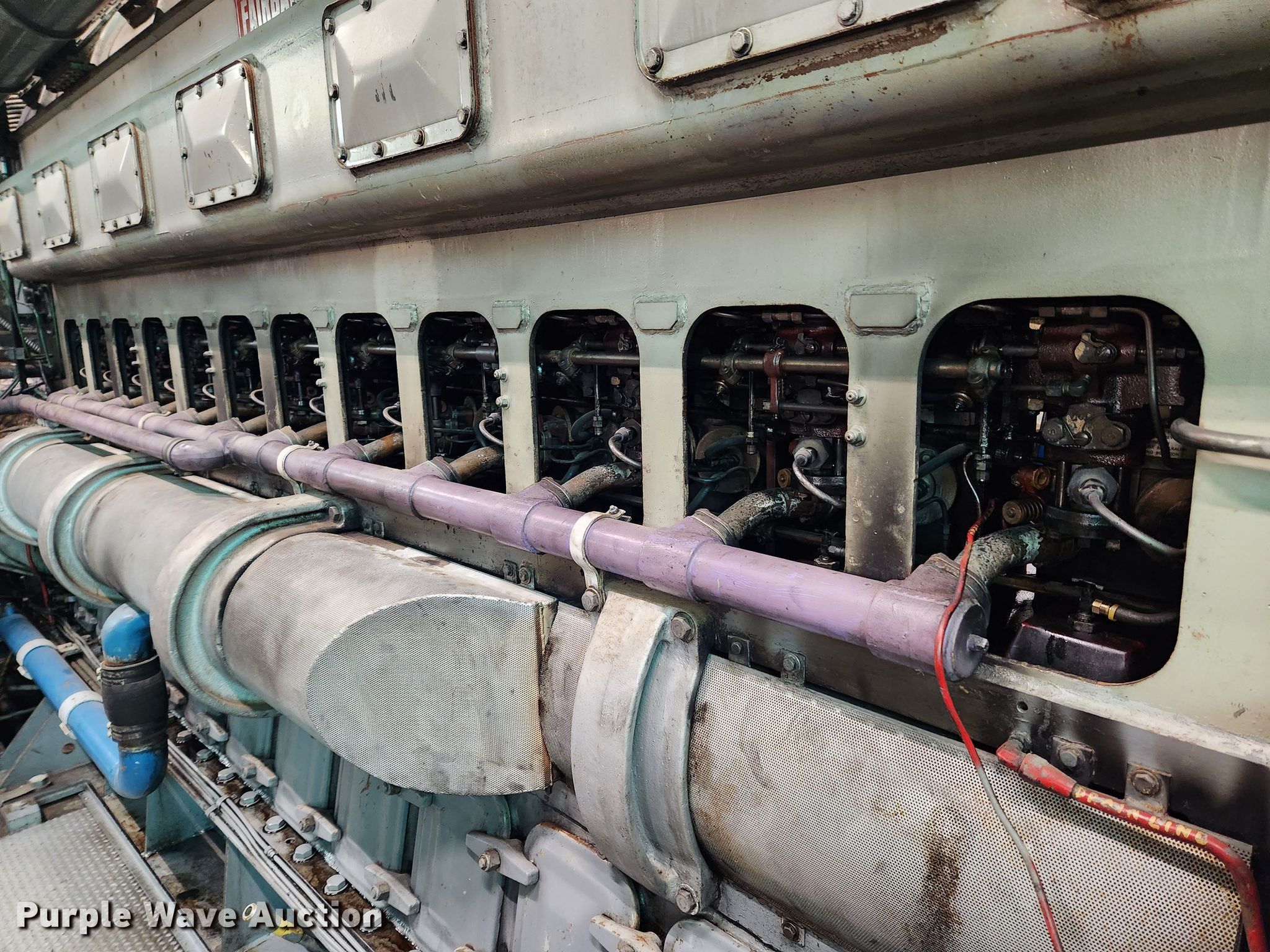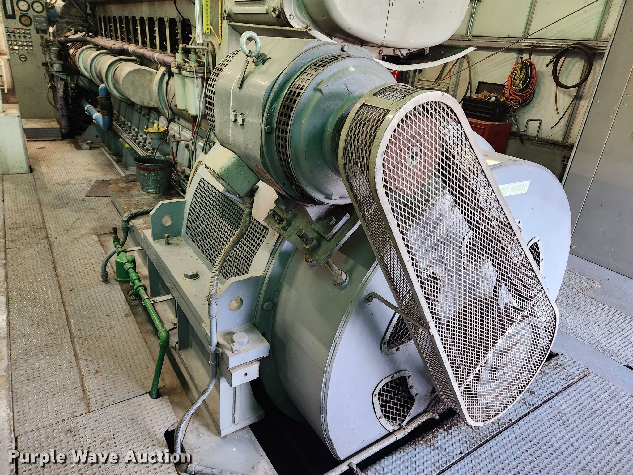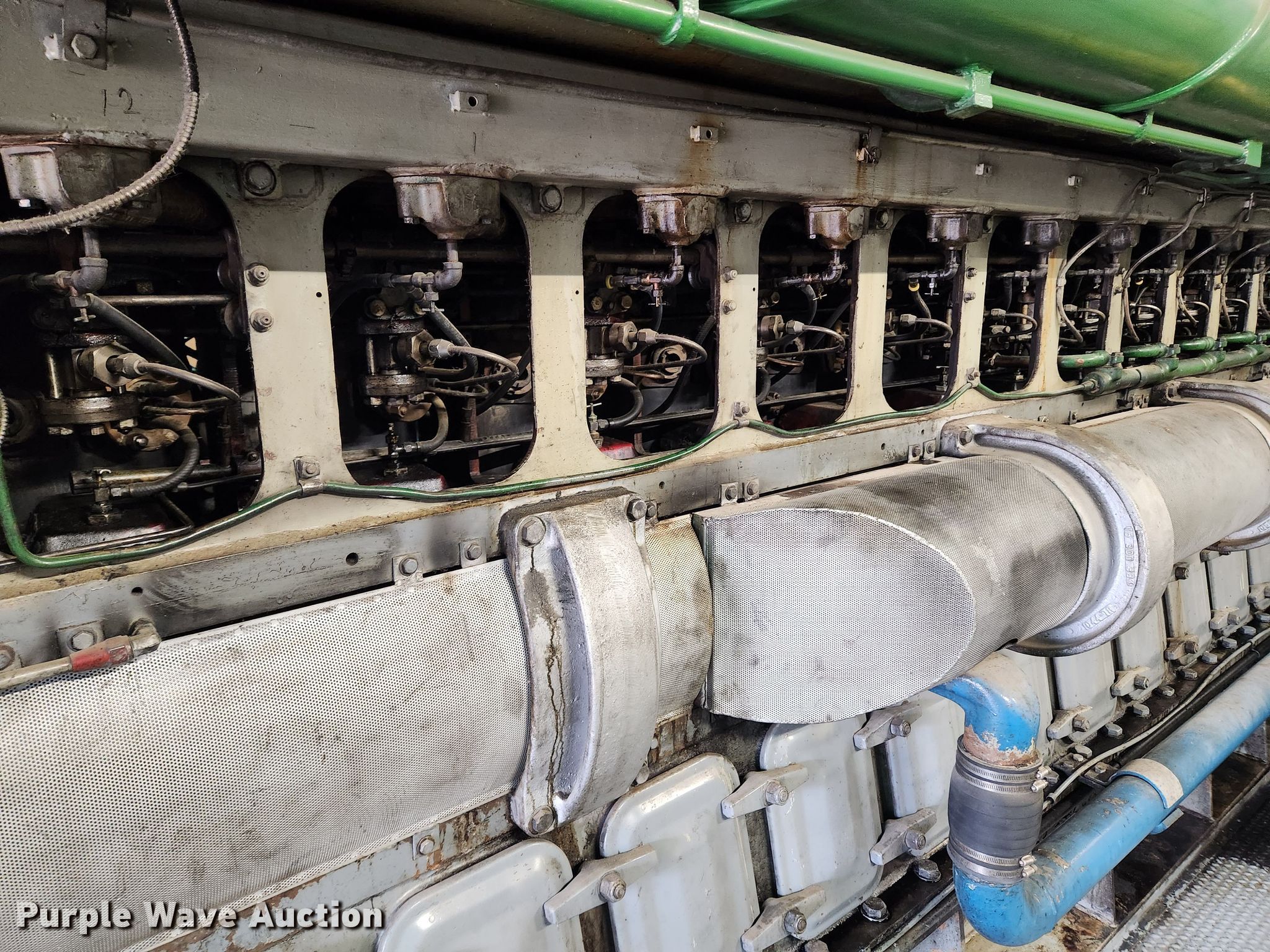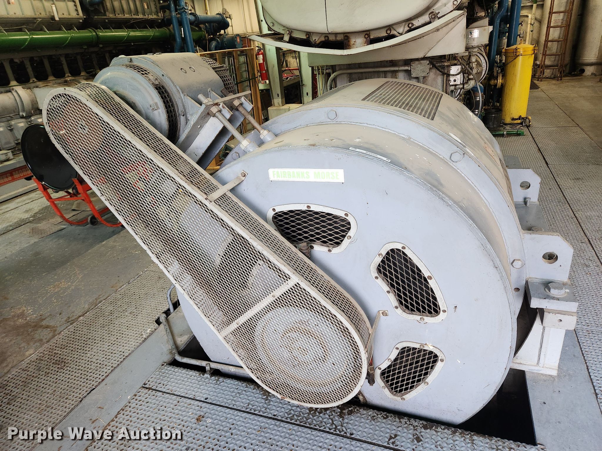 Fairbanks Morse 38TDD8 1/8 generator. Approximately 32' L 9'6" x 9' , Hours: 30,639 on meter, Serial: 970858, Unit #: 5. Engine Fairbanks Morse, Cylinders: 12, Fuel type: Diesel, HP: 2,880. Features Generator Fairbanks Morse, kVA: 2,563, kW: 2,050, Phase: Three, Skid mounted, Exterior exhaust system, Auxiliary cooling system, Auxiliary diesel fuel system, Cycoil oil bath air cleaner 54P03V Serial: C66786, 8' 3" x 12', Switch gear Control box, Marley cooling tower Serial: 002733-NC-421-91, 19' x 106" W x 142", Fan 96", Serial: 06H385734, Siemens Induction Motor Three phase, Volts: 2400/4160. City of Highland, IL. Highland, IL 62249