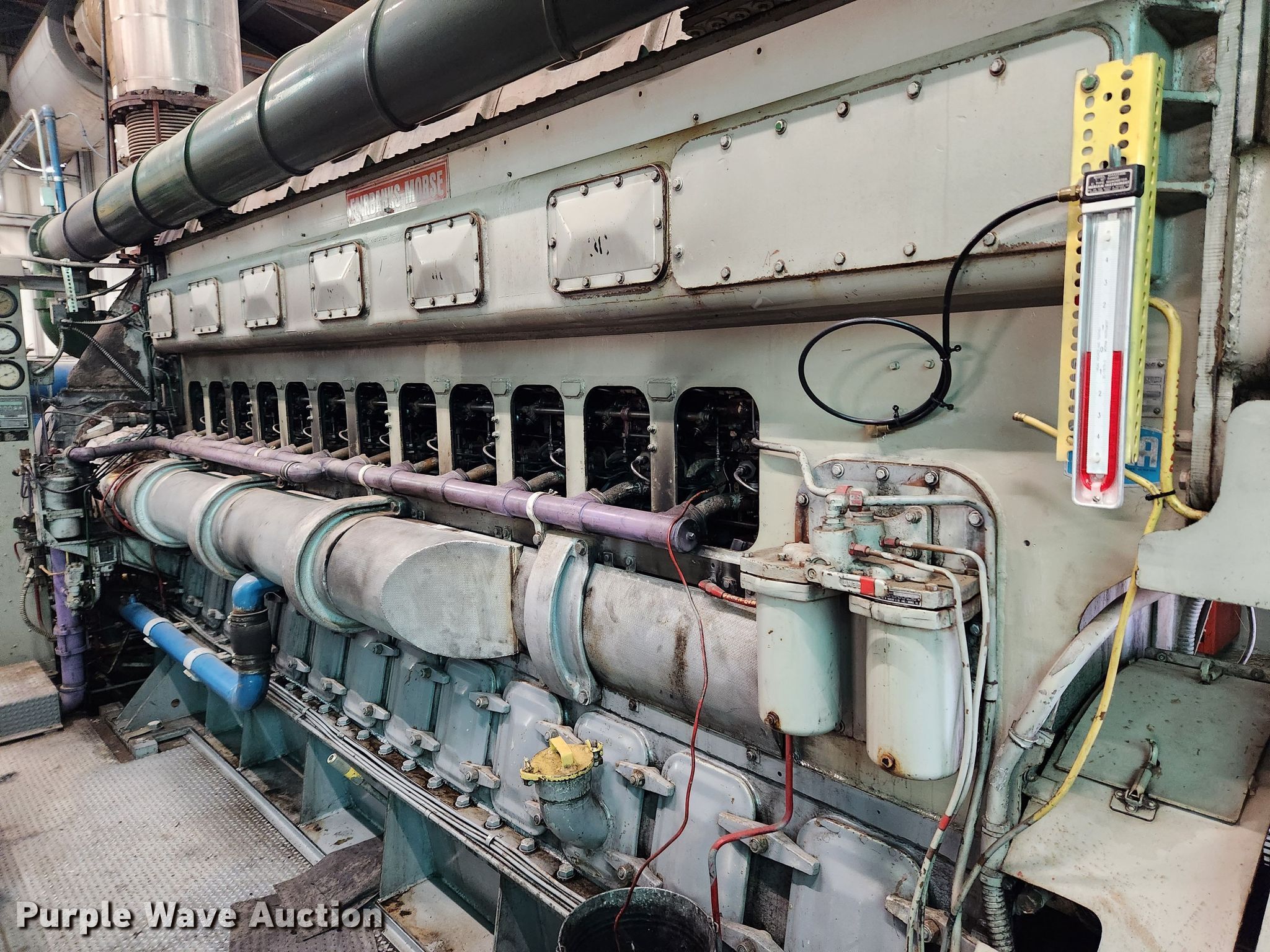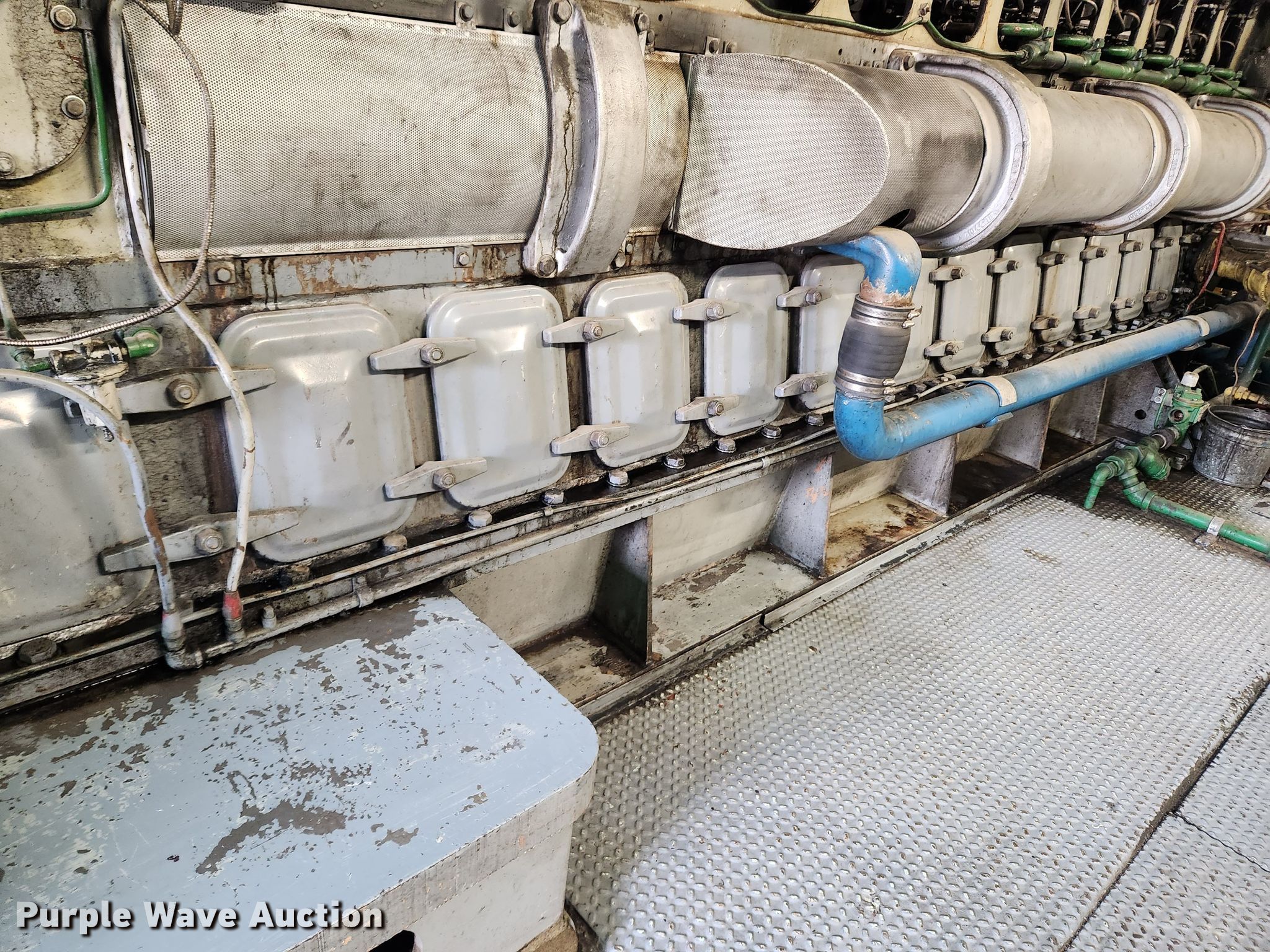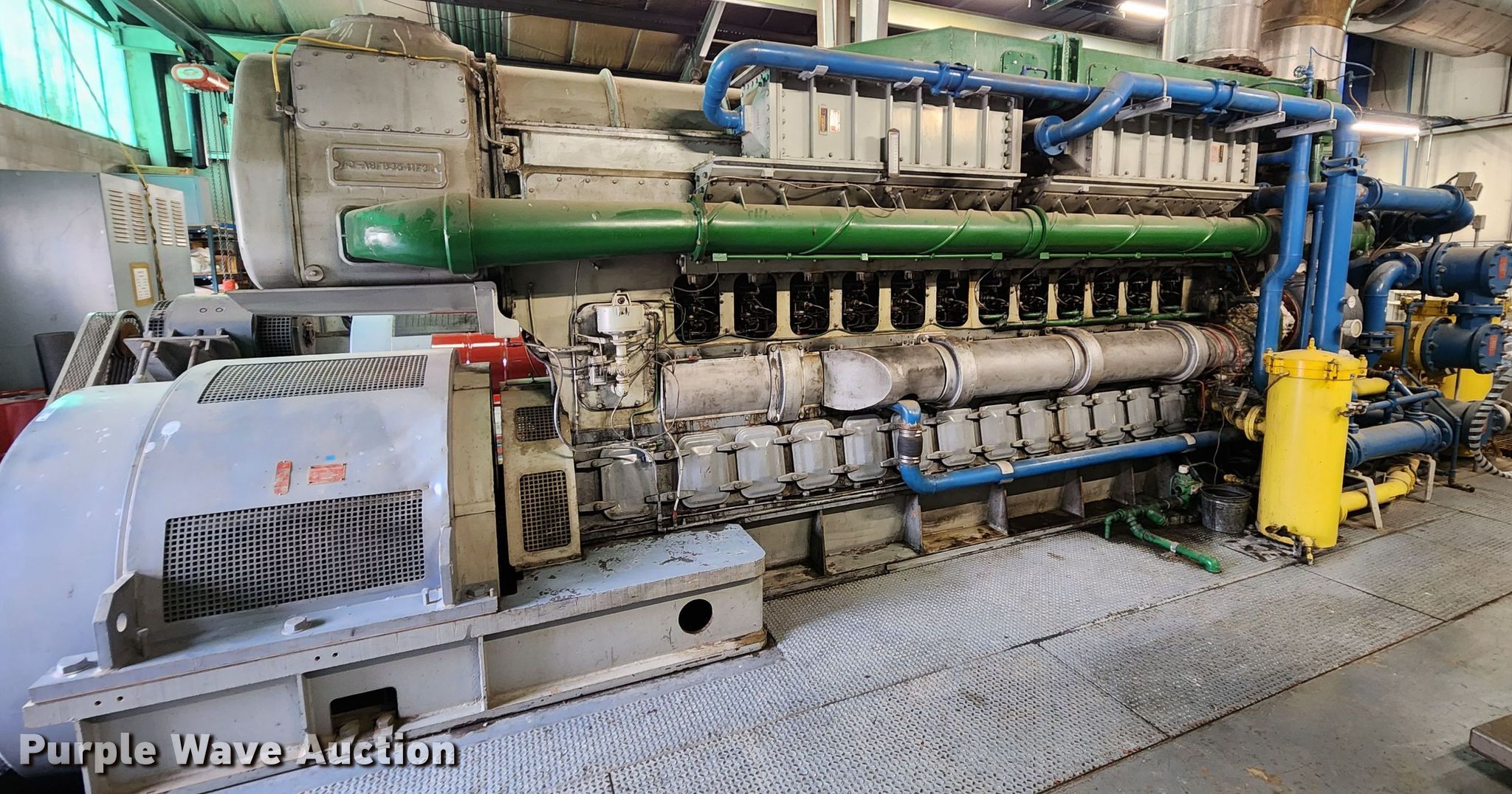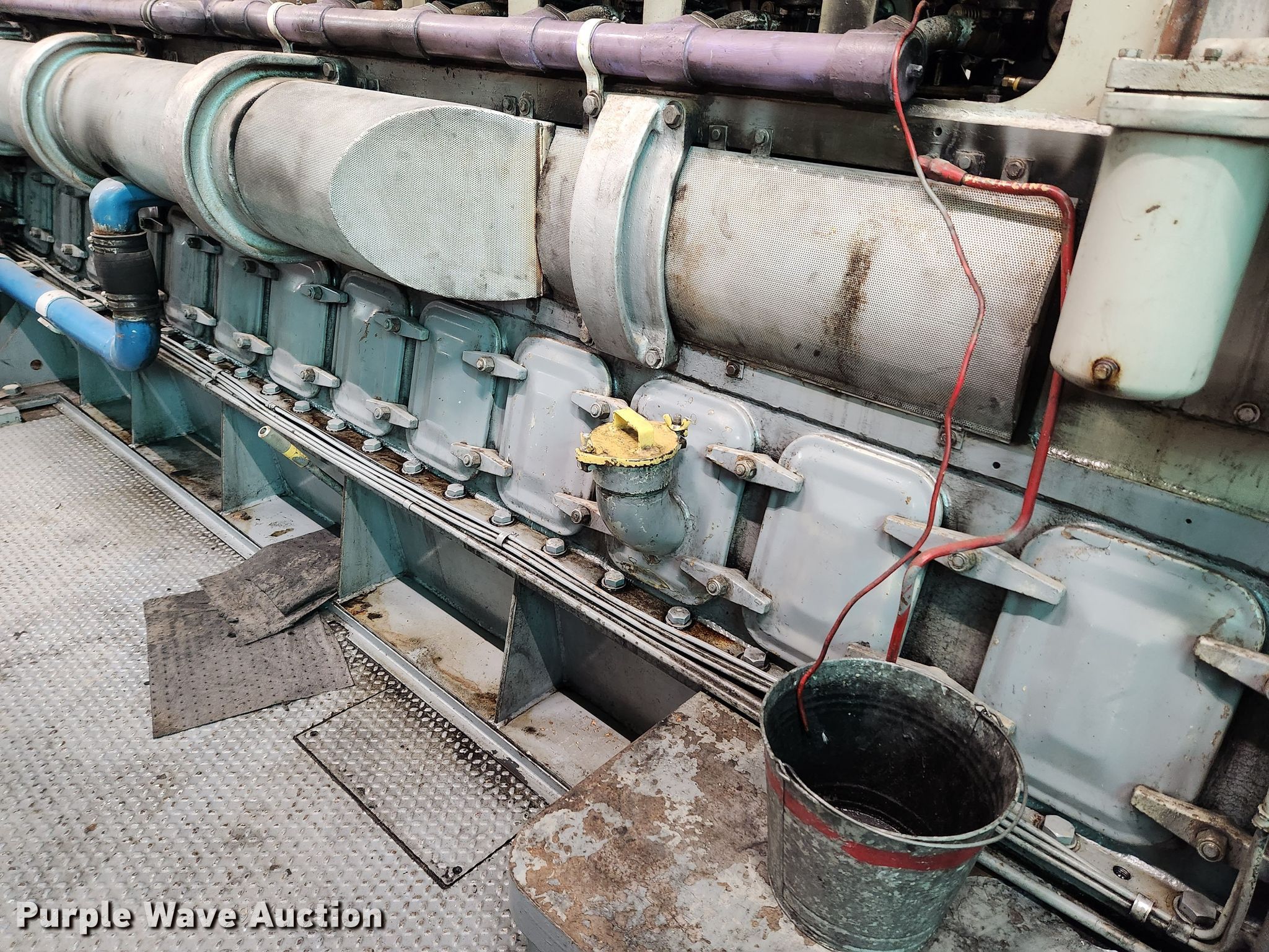 Fairbanks Morse 38TDD8 1/8 generator. Approximately 32' L 9'6" x 9' , Hours: 30,639 on meter, Serial: 970858, Unit #: 5. Engine Fairbanks Morse, Cylinders: 12, Fuel type: Diesel, HP: 2,880. Features Generator Fairbanks Morse, kVA: 2,563, kW: 2,050, Phase: Three, Skid mounted, Exterior exhaust system, Auxiliary cooling system, Auxiliary diesel fuel system, Cycoil oil bath air cleaner 54P03V Serial: C66786, 8' 3" x 12', Switch gear Control box, Marley cooling tower Serial: 002733-NC-421-91, 19' x 106" W x 142", Fan 96", Serial: 06H385734, Siemens Induction Motor Three phase, Volts: 2400/4160. City of Highland, IL. Highland, IL 62249
