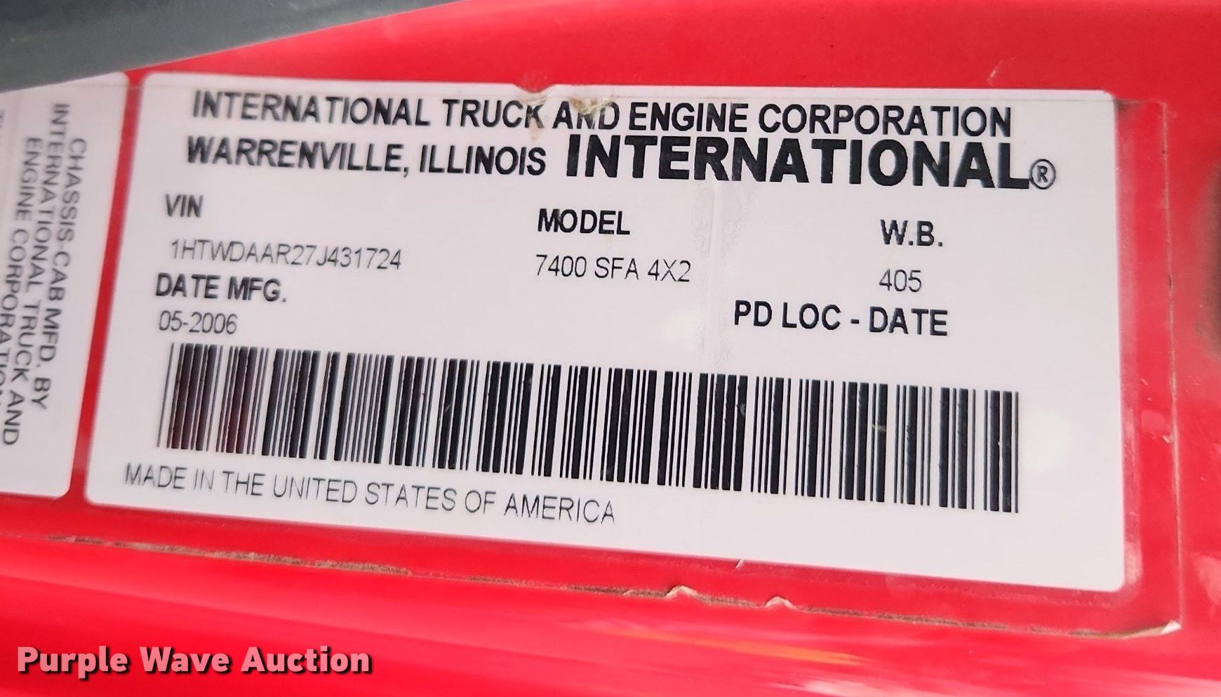 Purple Wave is selling a used Construction Dump Truck in Missouri. This item is a 2007 International 7400 dump truck with the following: Miles: 35,587 on odometer, Hours: 3,768 on meter, VIN: 1HTWDAAR27J431724