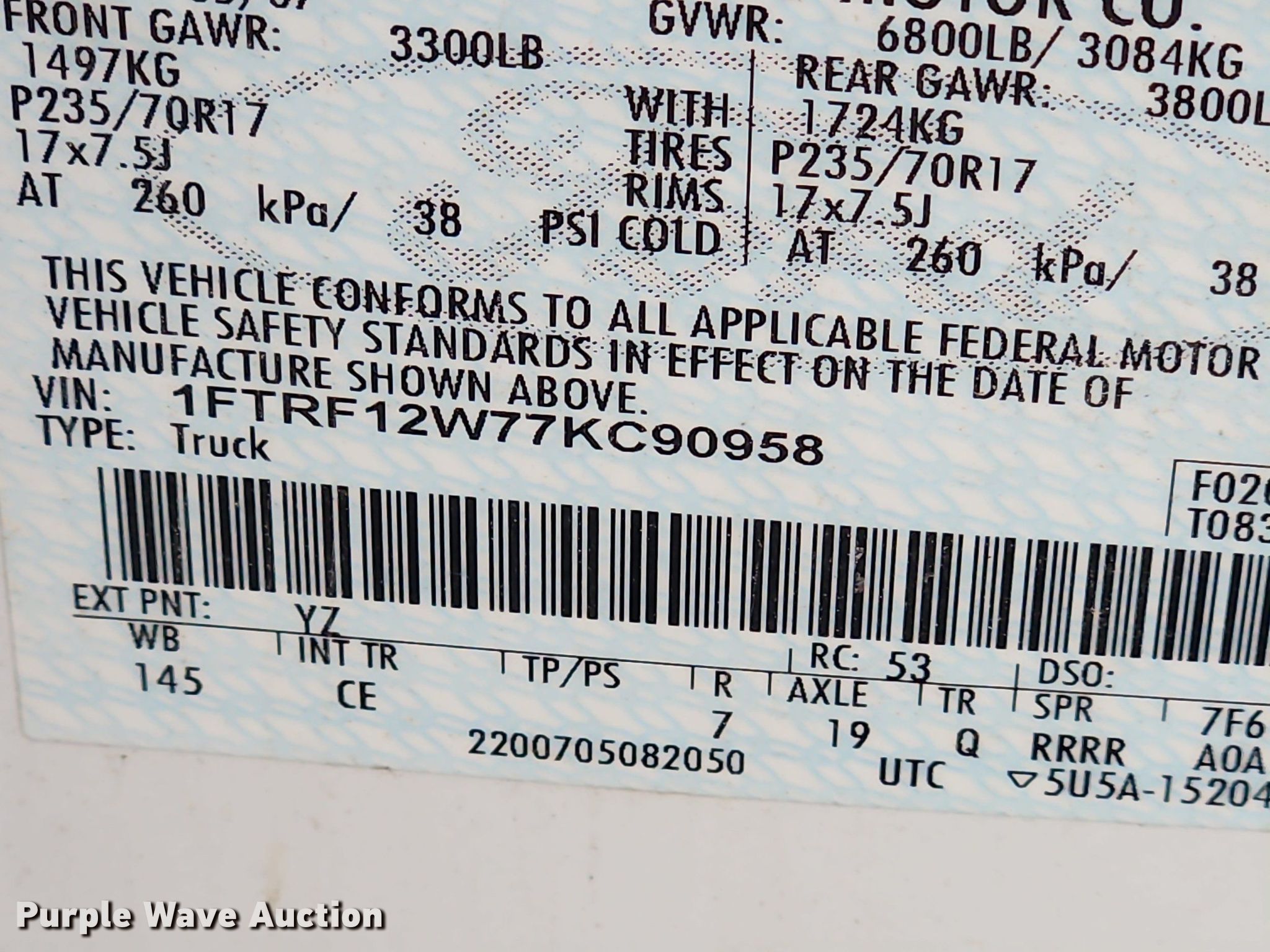 - VIN: 1FTRF12W77KC90958