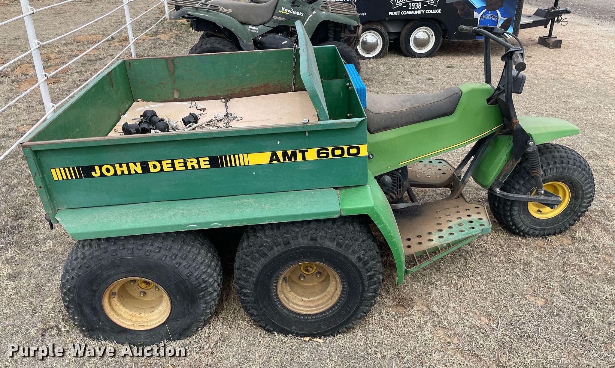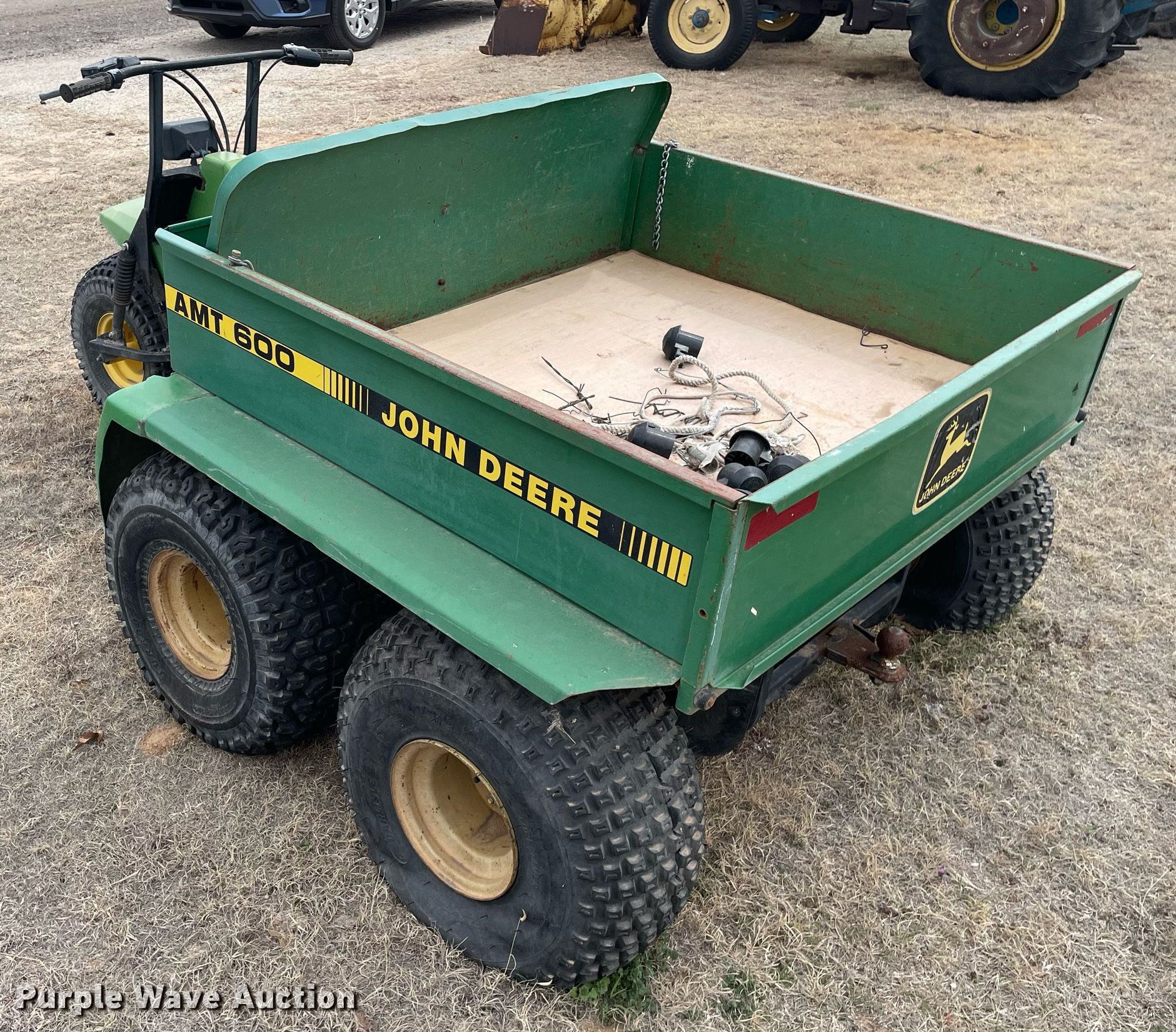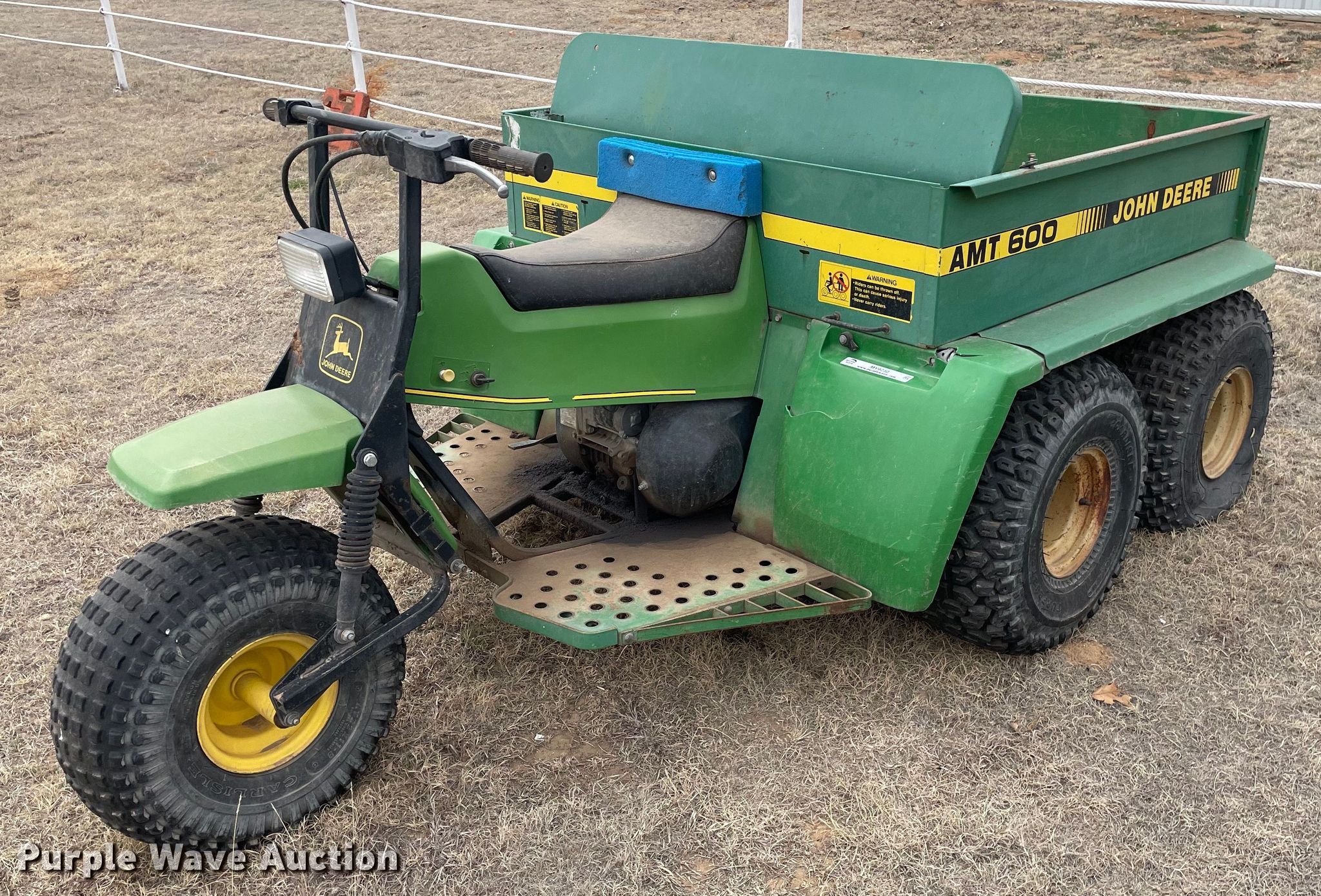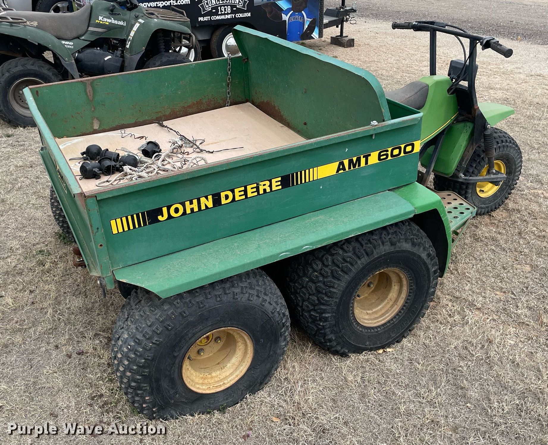 1988 John Deere AMT600 utility vehicle. Serial: W00600X007922. Engine Kawasaki, Displacement: 250 cc, Cylinders: 1, Fuel type: Gas, Electric start. Transmission CVT. Features Dump bed 48" L x 48" W, Dump bed type: Manual. Tires Front: 22x11-8, Rear: 25x12-9. Notes Dead battery, Unknown operating condition. Transfer of ownership documentation will be a bill of sale. Pratt Community College. Pratt, KS 67124