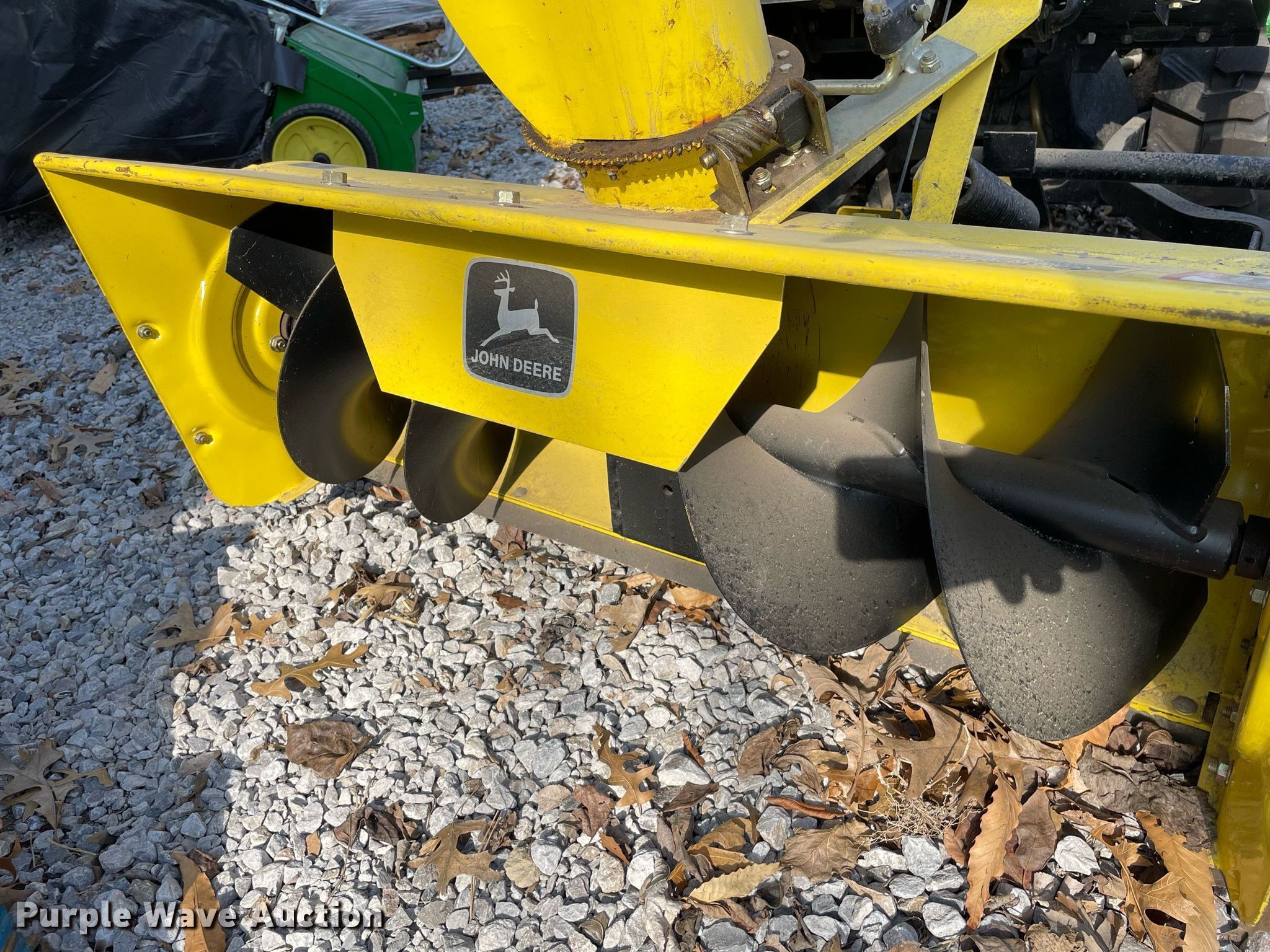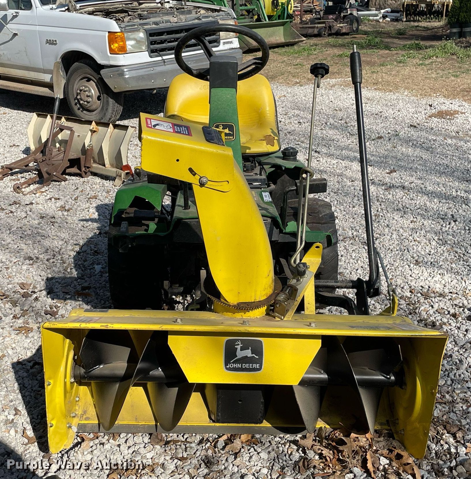 John Deere F510 lawn mower. Hours: 268 on meter, Serial: M0F510X120322. Engine Kawasaki PA420A, Cylinders: 1, Fuel type: Gas. Transmission Hydrostatic. Features Snow blower Width: 38", John Deere, Mower deck Width: 38". Tires Front: 18x8.50-8, Rear: 13x8.50-6. Notes Dead battery, Unknown operating condition. Catholic Life Center Landscape Counsel. Belaire, KS 67226
