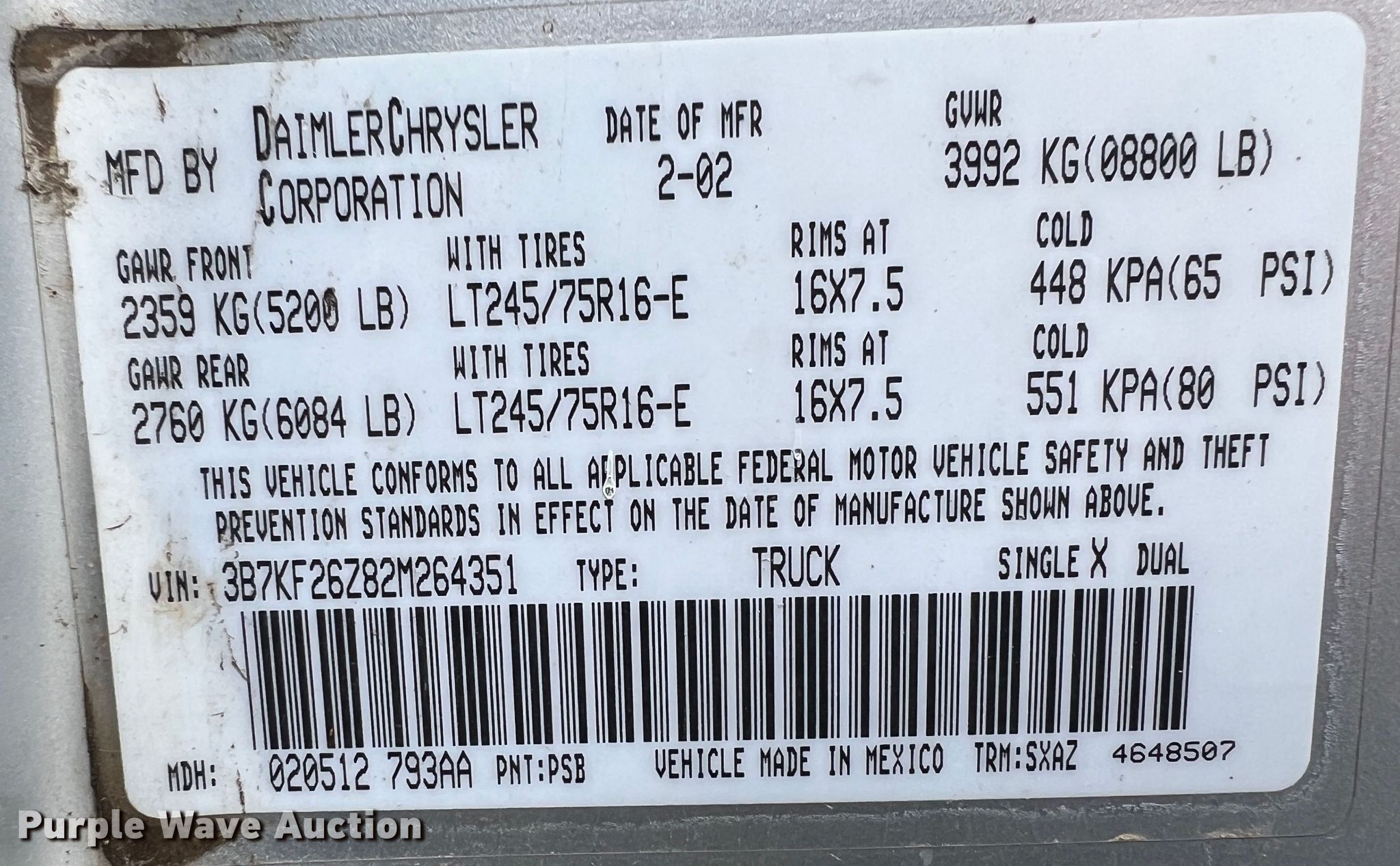 Purple Wave is selling a used 3/4 or 1 Ton Pickup or Van in Kansas. This item is a 2002 Dodge Ram 2500 pickup truck with the following: Miles: 100,205 on odometer, Miles or hours may vary, unit still in use, VIN: 3B7KF26Z82M264351