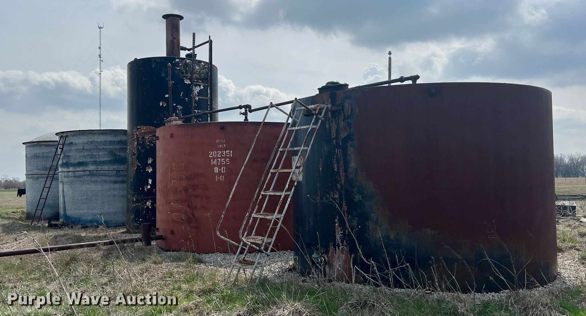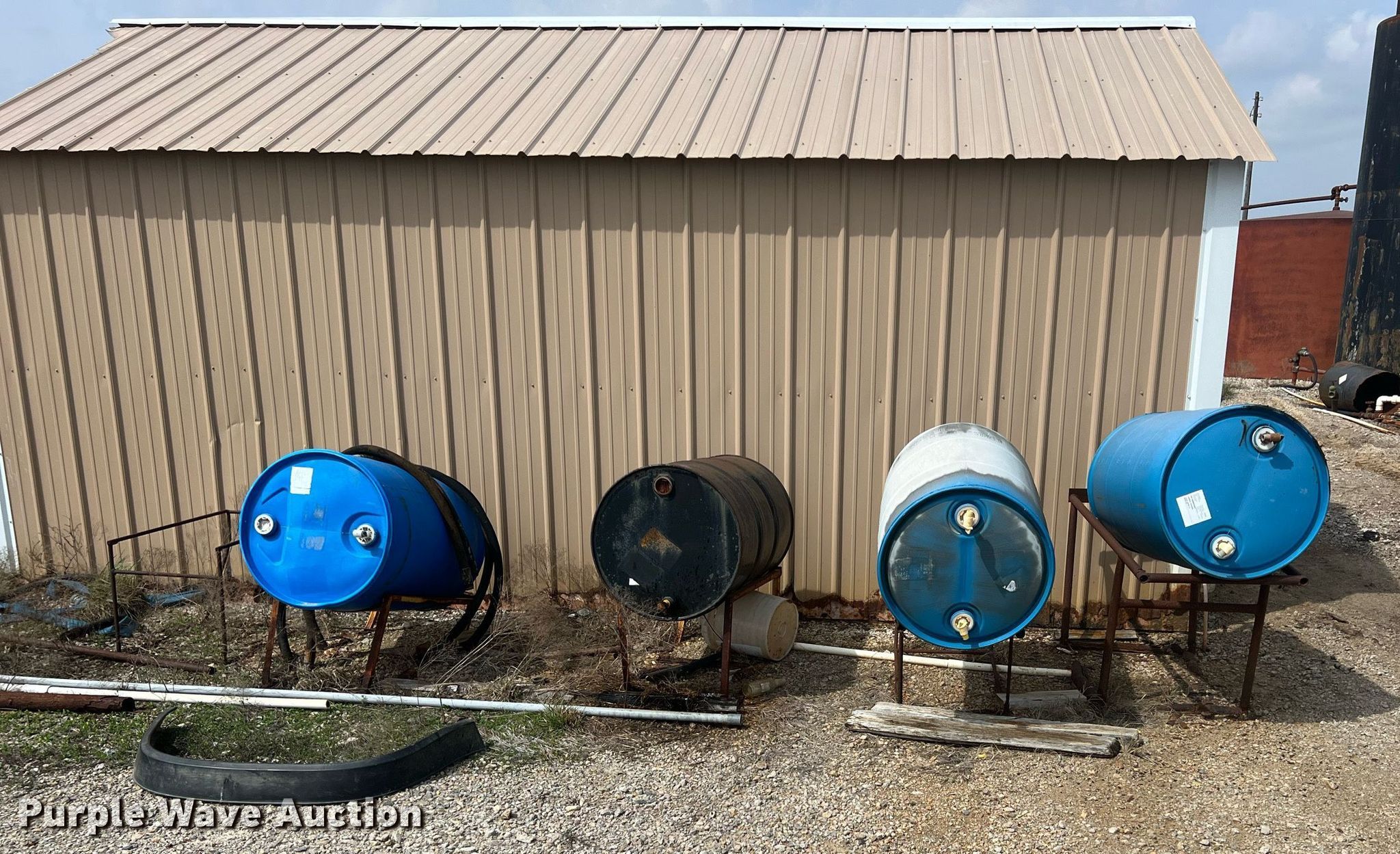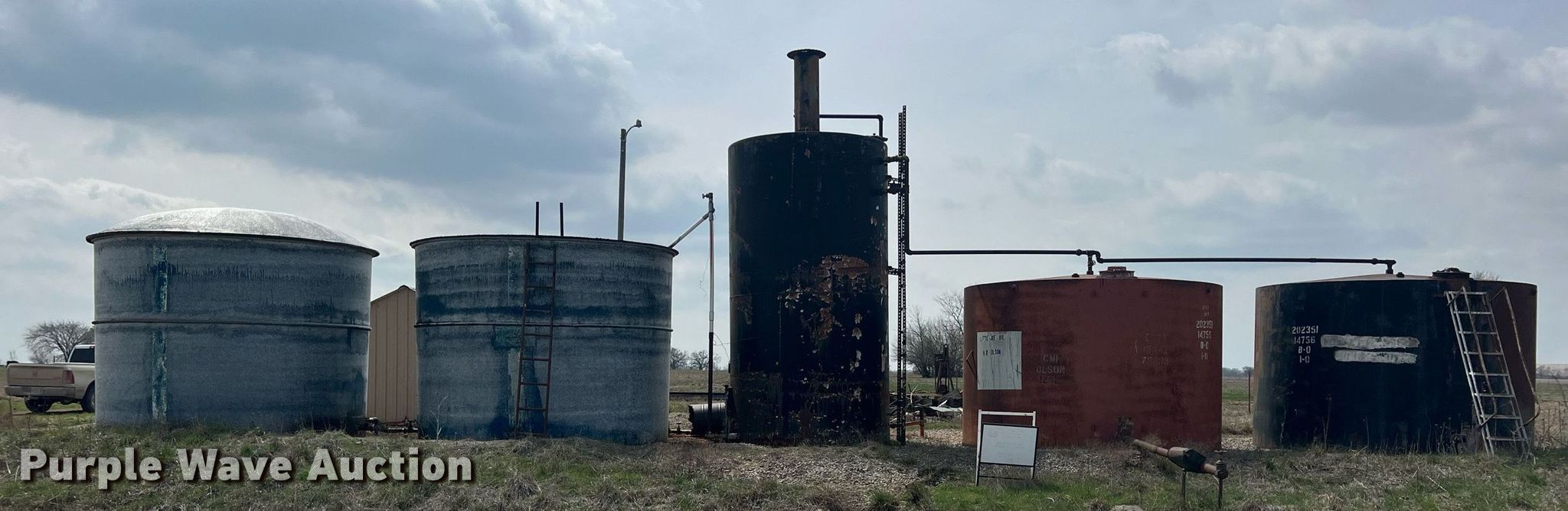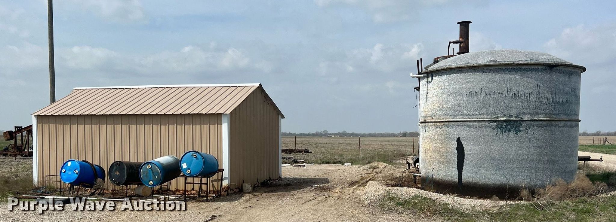 Purple Wave is selling a used Other Industrial or Business in Kansas. This item is a Oilfield equipment with the following: Control #: 2023FP3-02 - HR Olson, (2) metal tanks, Capacity: approx. 100 barrels, Gun barrel, Capacity: approx. 75 barrels, (2) fiberglass tanks, Capacity: approx. 100 barrels, (4) chemical barrels, Capacity: 55 gallons, Stands, Pump house, 18' x 12', Pump, (2) electric motors, Hoses, Pulleys, Casing clamps
