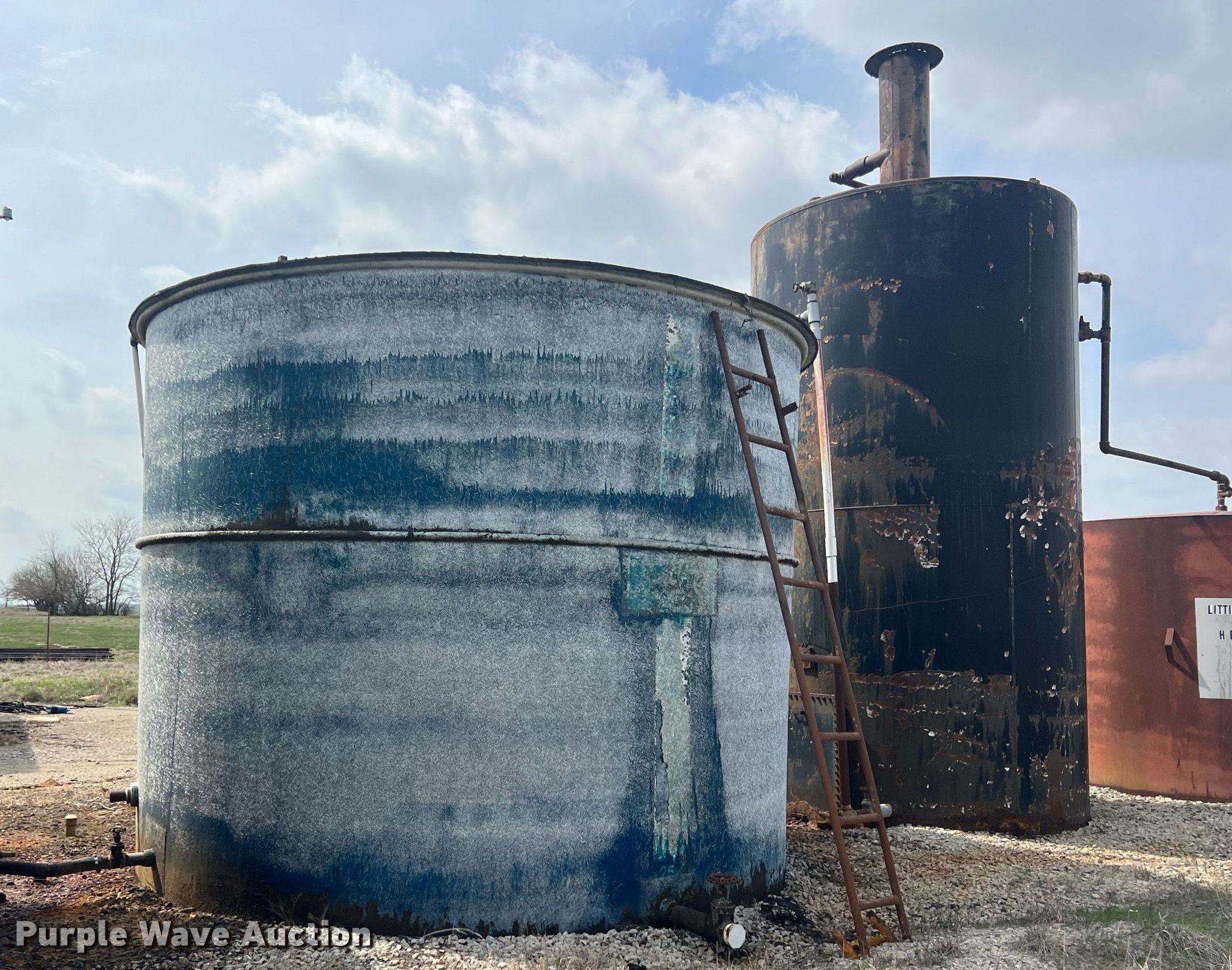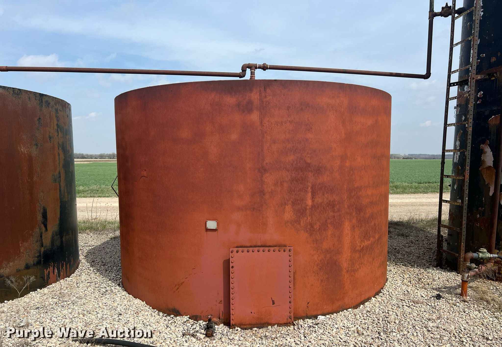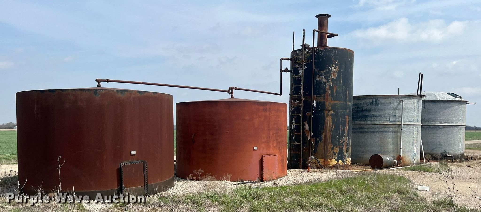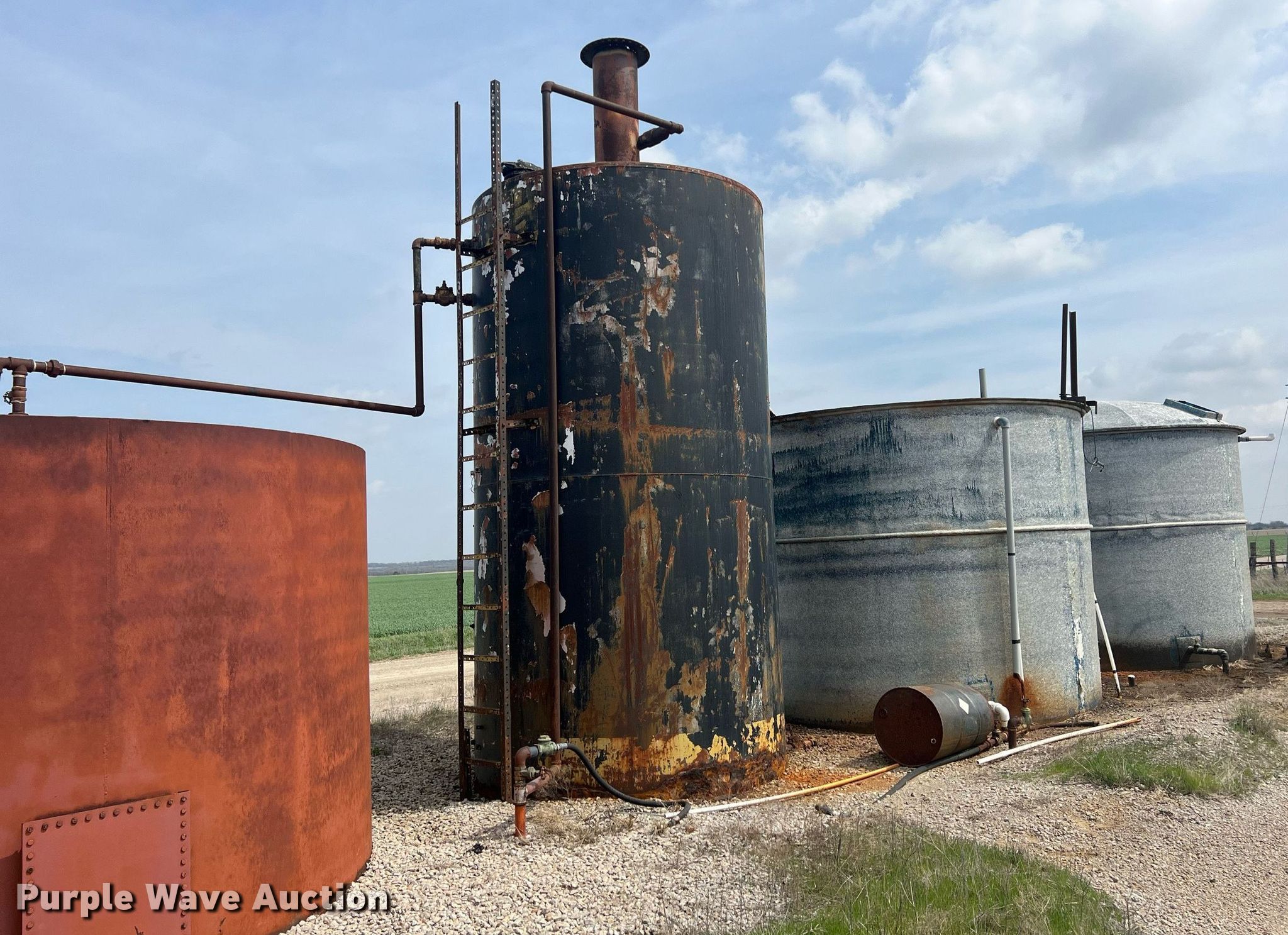 Purple Wave is selling a used Other Industrial or Business in Kansas. This item is a Oilfield equipment with the following: Control #: 2023FP3-02 - HR Olson, (2) metal tanks, Capacity: approx. 100 barrels, Gun barrel, Capacity: approx. 75 barrels, (2) fiberglass tanks, Capacity: approx. 100 barrels, (4) chemical barrels, Capacity: 55 gallons, Stands, Pump house, 18' x 12', Pump, (2) electric motors, Hoses, Pulleys, Casing clamps