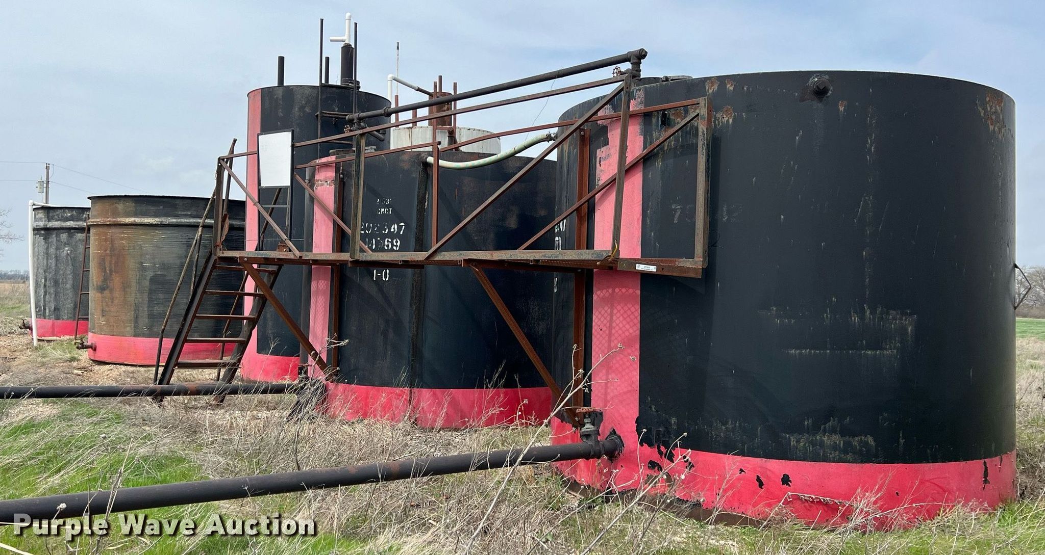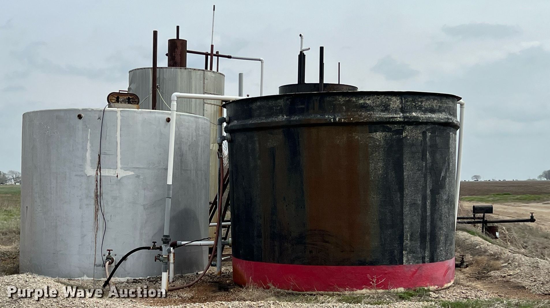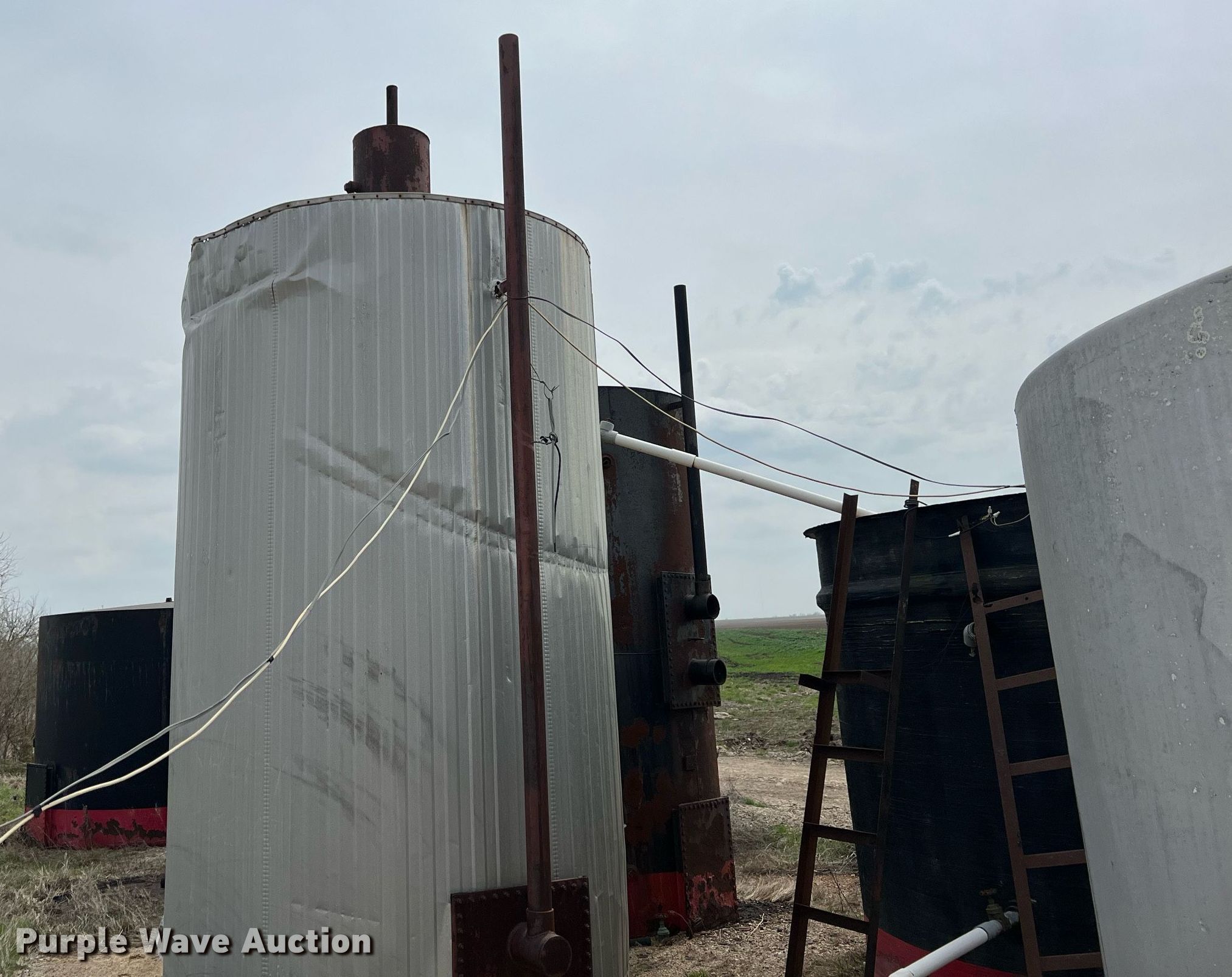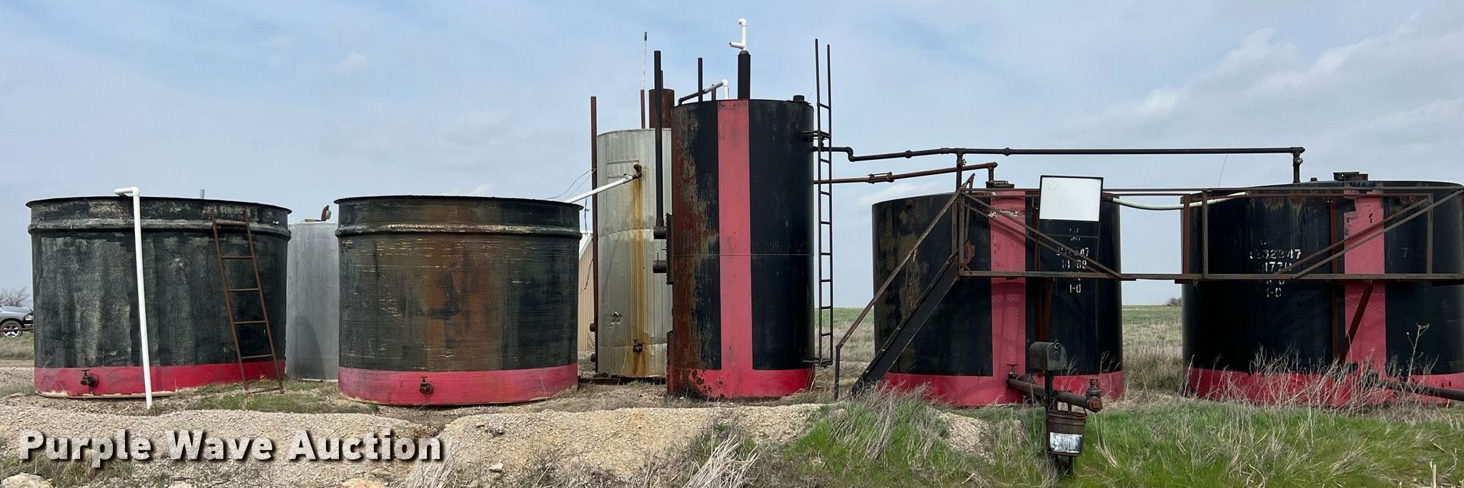 Purple Wave is selling a used Tanks in Kansas. This item is a (7) tanks with the following: Control #: 2023FP3-02 - Mike Olson, (3) metal tanks, Capacity: approx. 100 barrels, (2) fiberglass tanks, Capacity: approx. 100 barrels, (2) gun barrels, Capacity: approx. 50 barrels