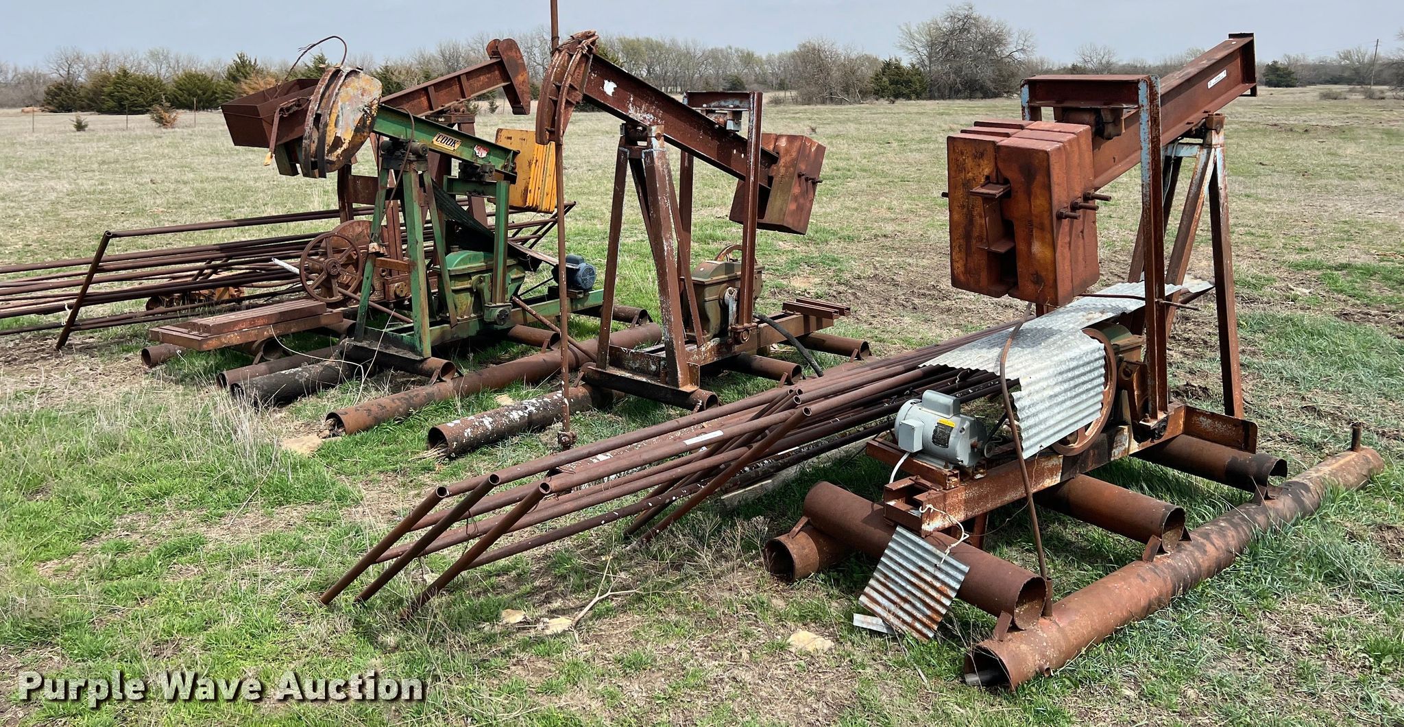 (4) pump jacks. Control #: 2023FP3-02 - Dulin, (2) with electric motors, Unknown operating condition. KCC Conservation Division Oilfield Salvage Disposal. Chanute, KS 66720