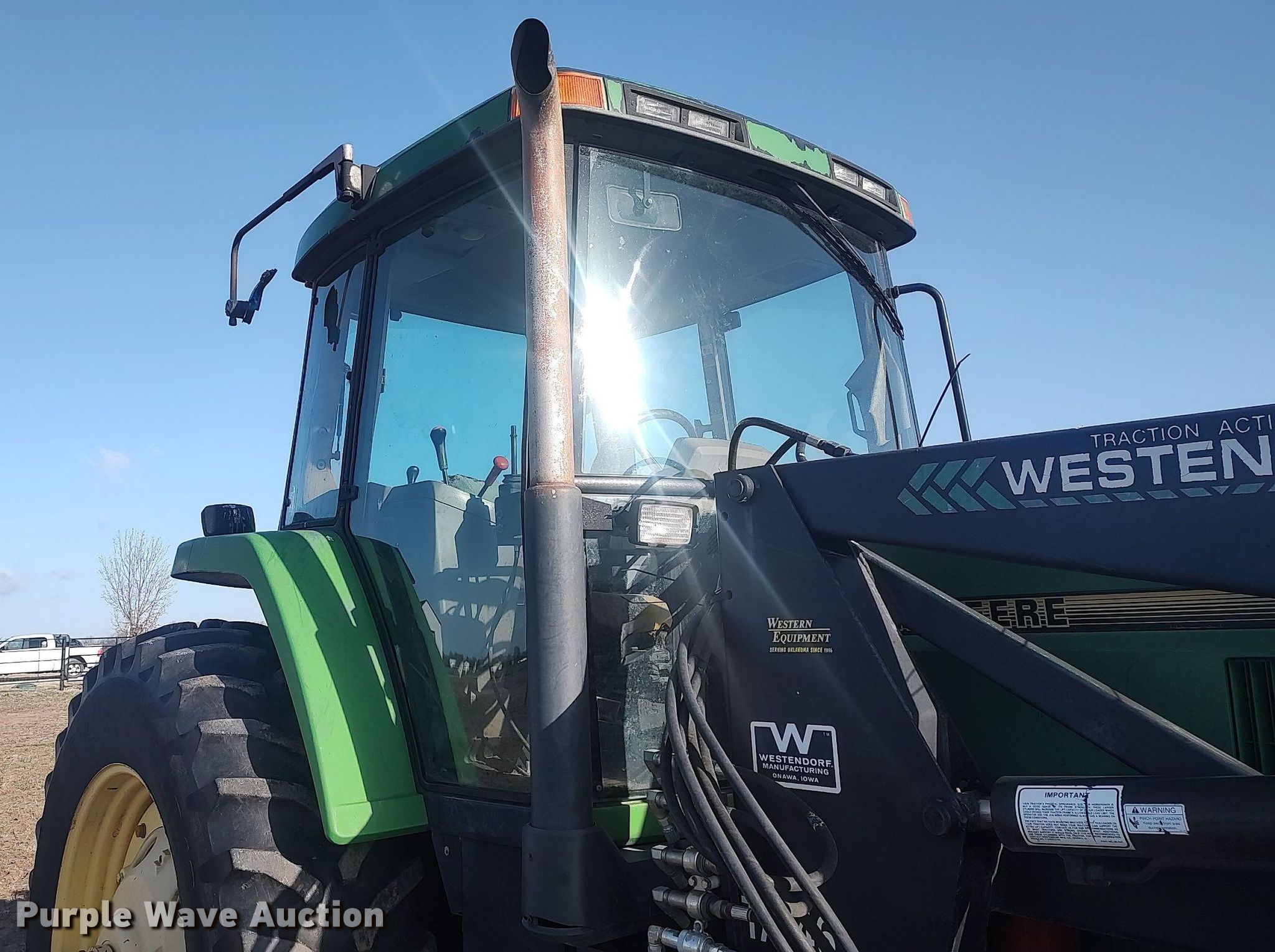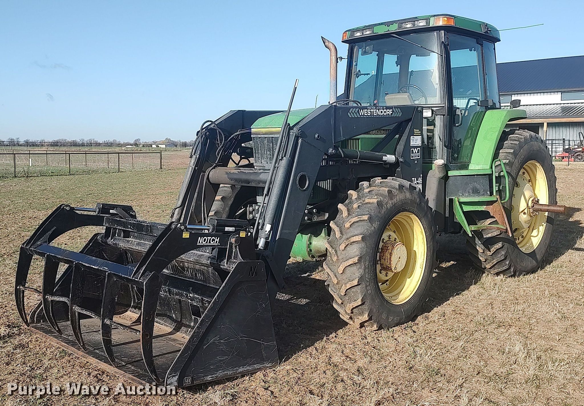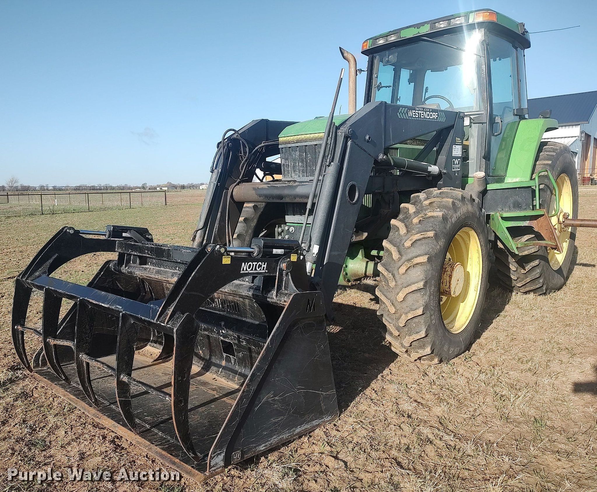 1994 John Deere 7800 MFWD tractor. Hours: 8,867 on meter, Serial: RW7800H006976. Engine Cylinders: 6, Fuel type: Diesel. Transmission Powershift, 16F - 16R. Operators station AC, Heat. Features PTO: 540, Three point Top link, Seven pin outlet, Hydraulic remote sets Rear: 2, Loader Westendorf, Controls: Joystick, Grapple bucket Width: 72".. Tires Front: 380/85R30, Rear: 18.4R42. Goddard, KS 67052