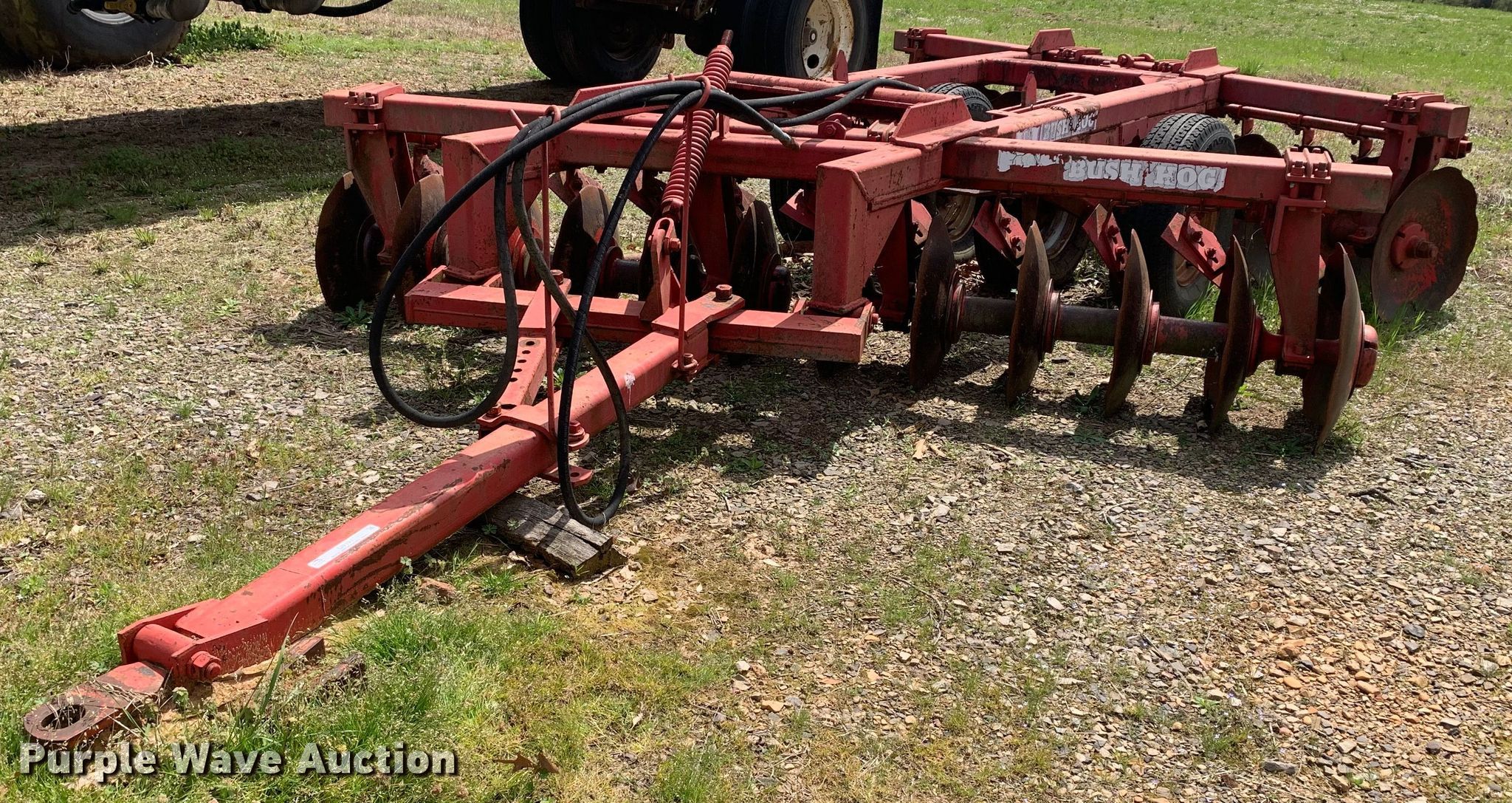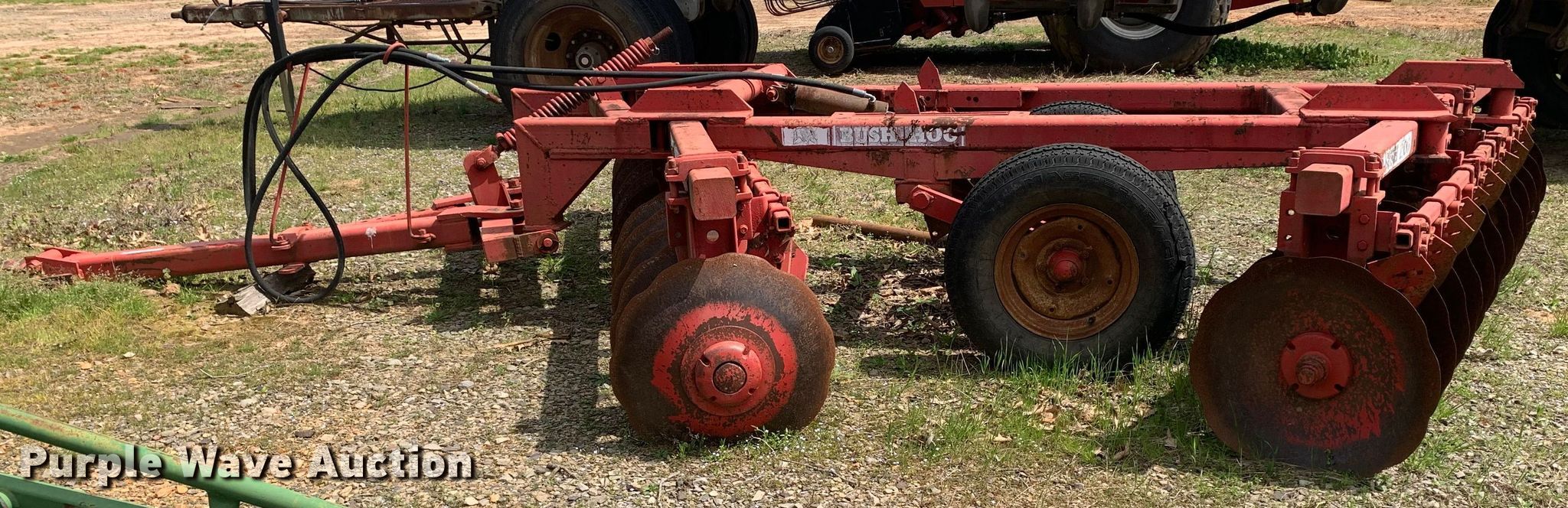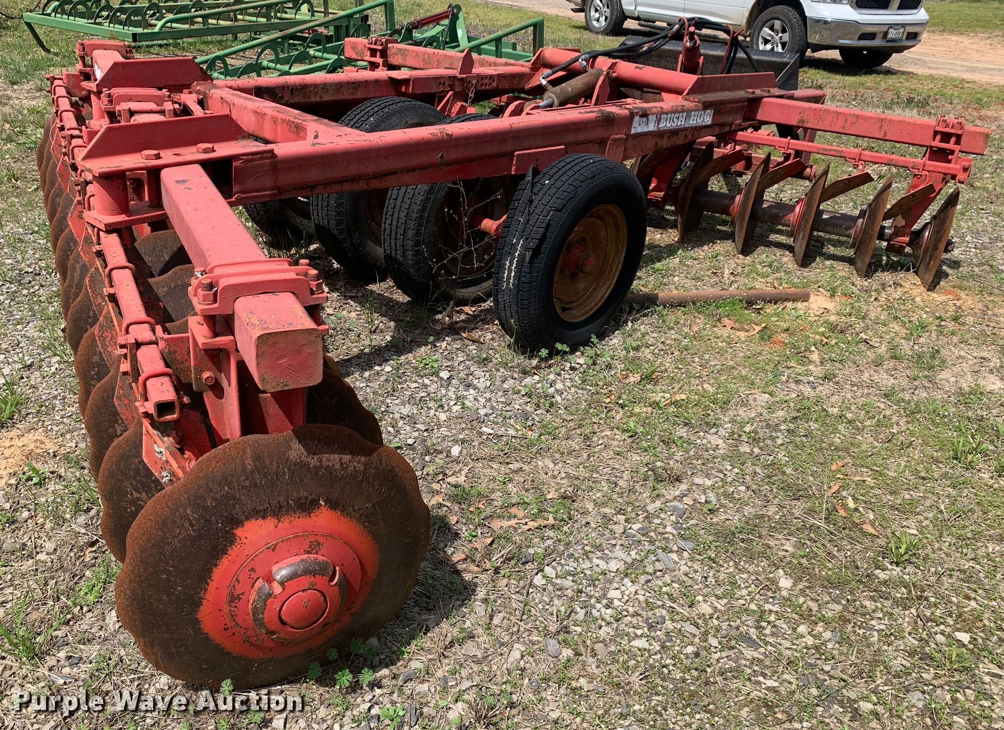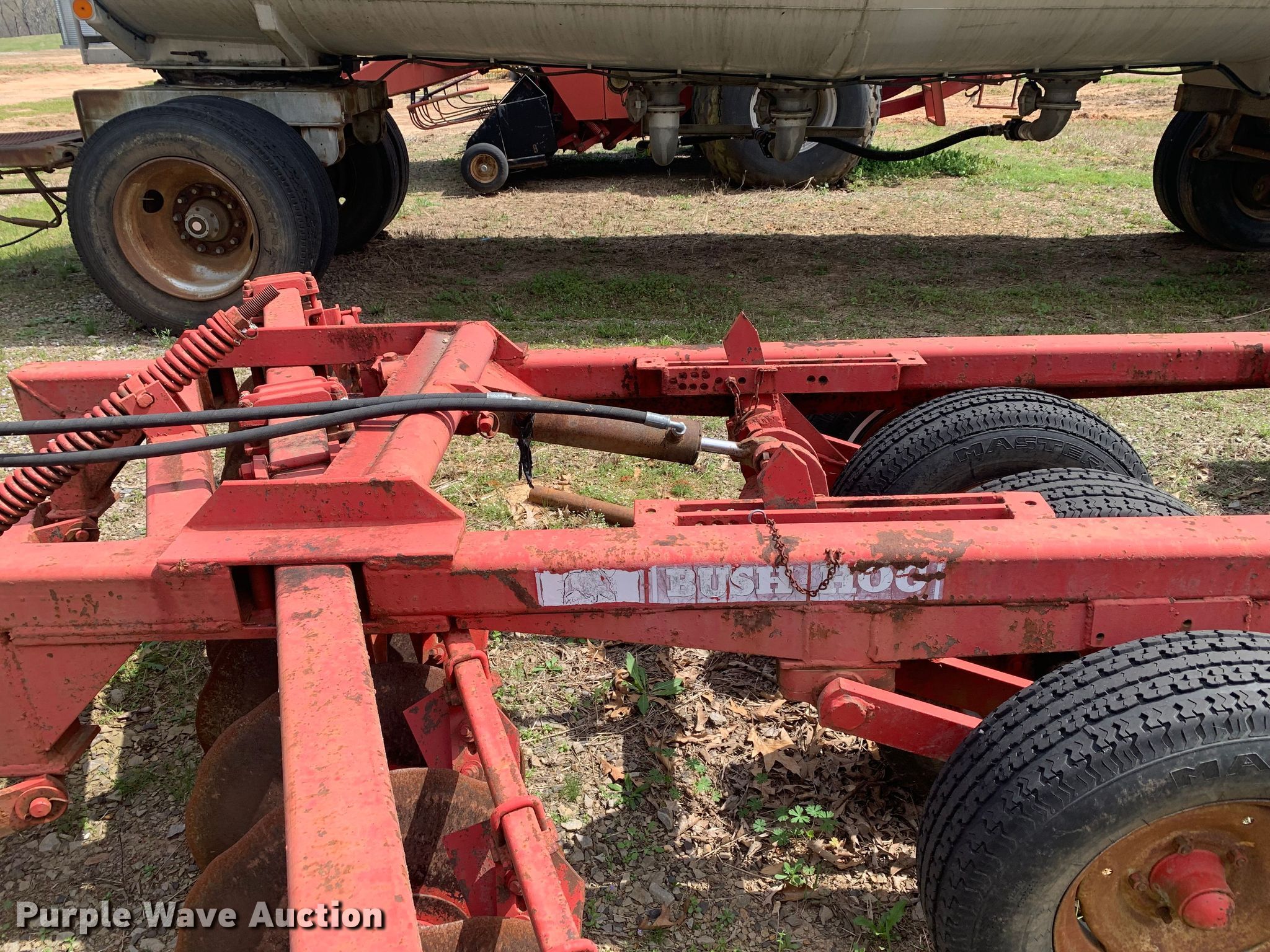Bush Hog off-set disk. Overall width: 10'. Features Blade diameter Front: 20", Rear: 23", Spacing: 10.5", Disk scrapers, Operation Hydraulic lift. Tires Tire size: P215/70R15. Notes Flat tires. Don - Warren Cattle Company. 1503 Crowe Road. Lavaca, AR 72941