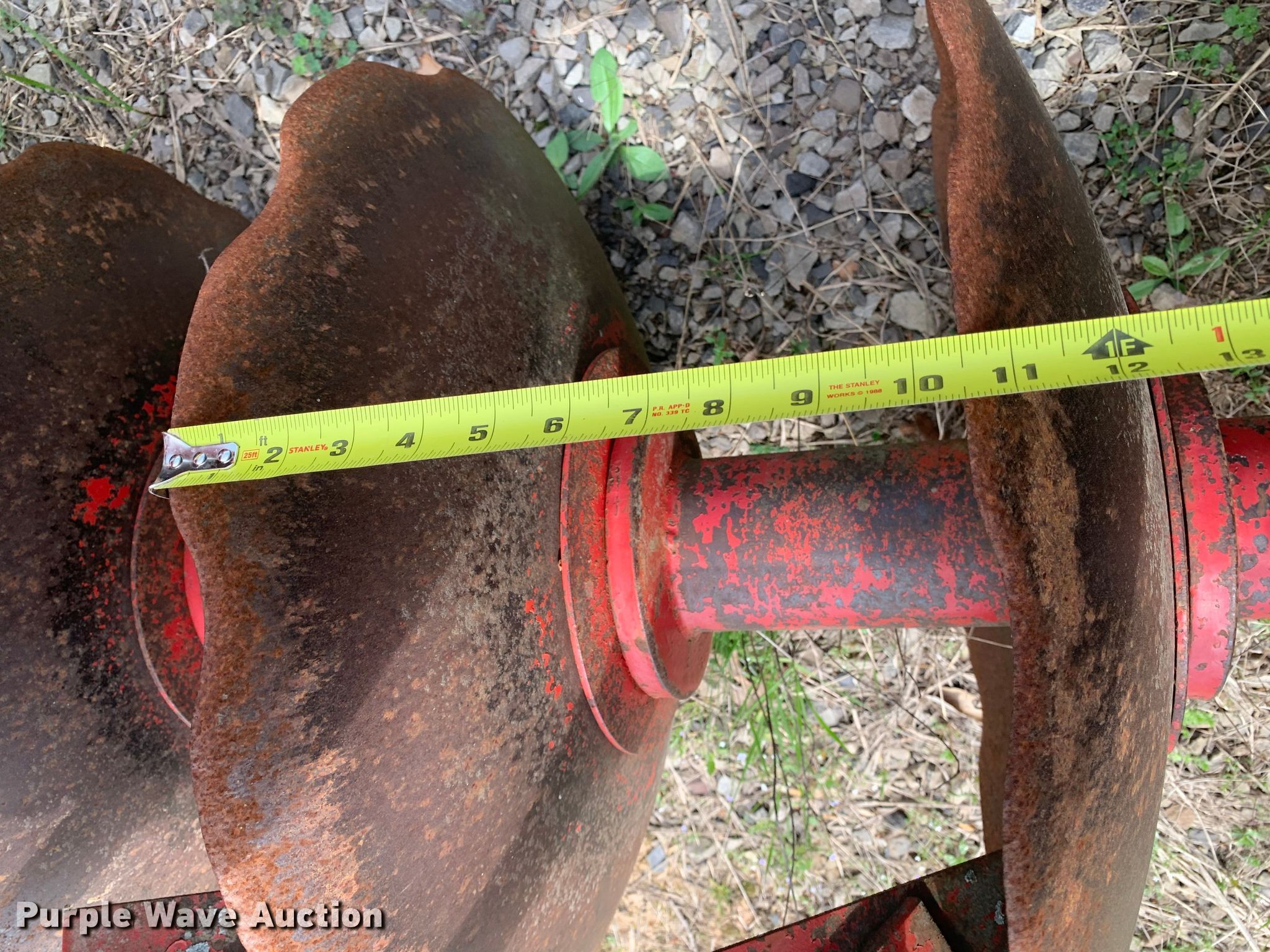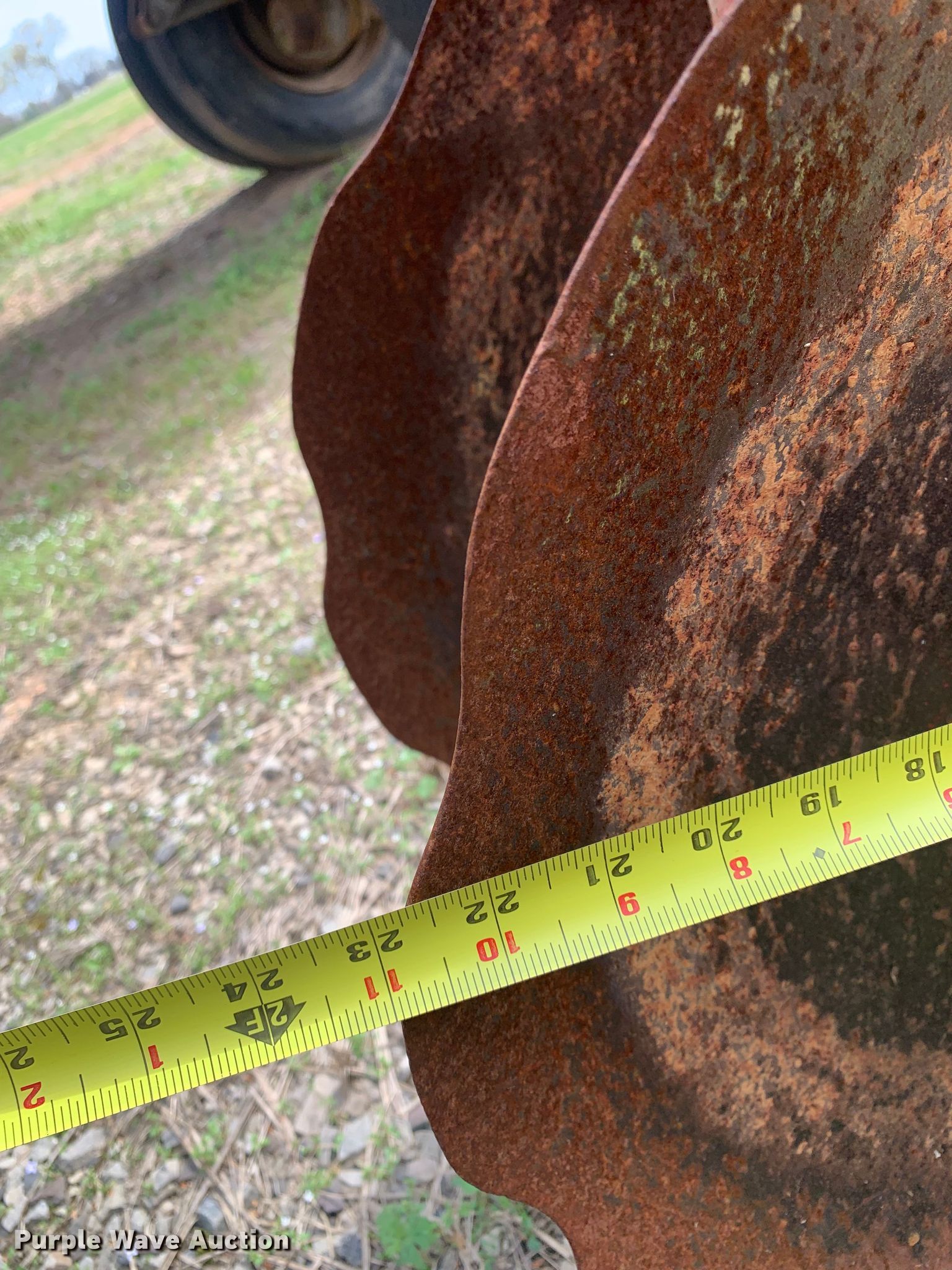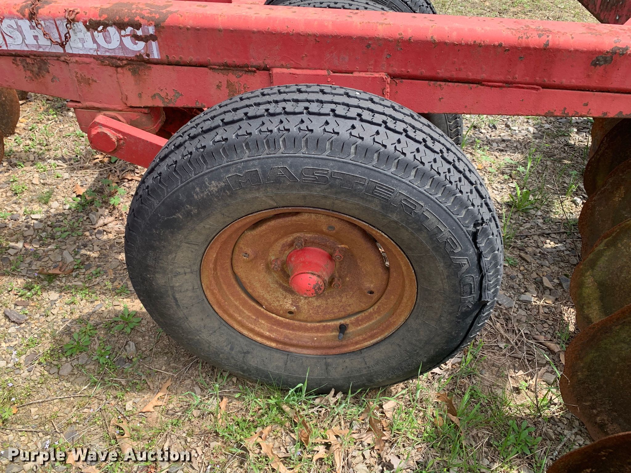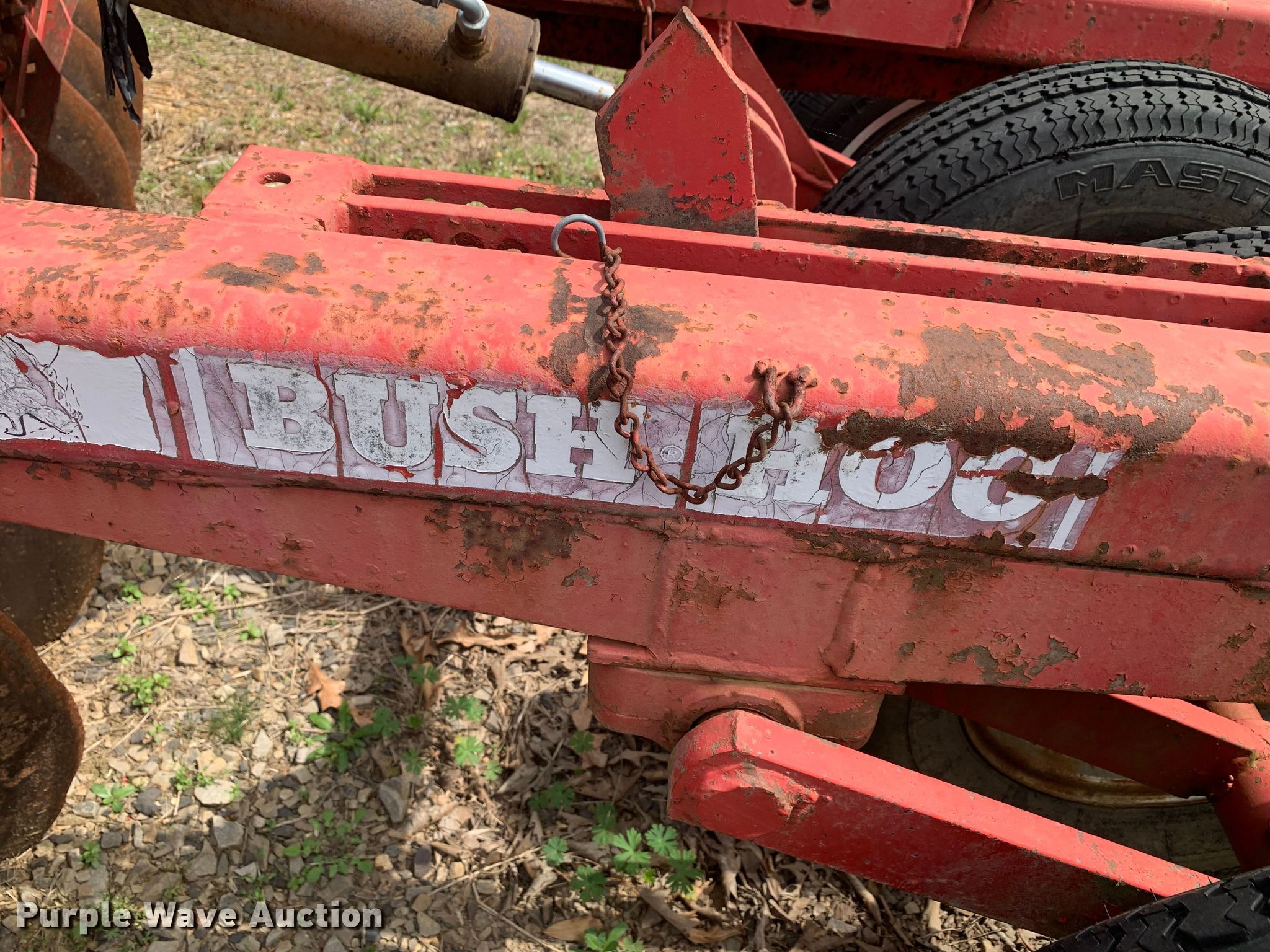 Bush Hog off-set disk. Overall width: 10'. Features Blade diameter Front: 20", Rear: 23", Spacing: 10.5", Disk scrapers, Operation Hydraulic lift. Tires Tire size: P215/70R15. Notes Flat tires. Don - Warren Cattle Company. 1503 Crowe Road. Lavaca, AR 72941