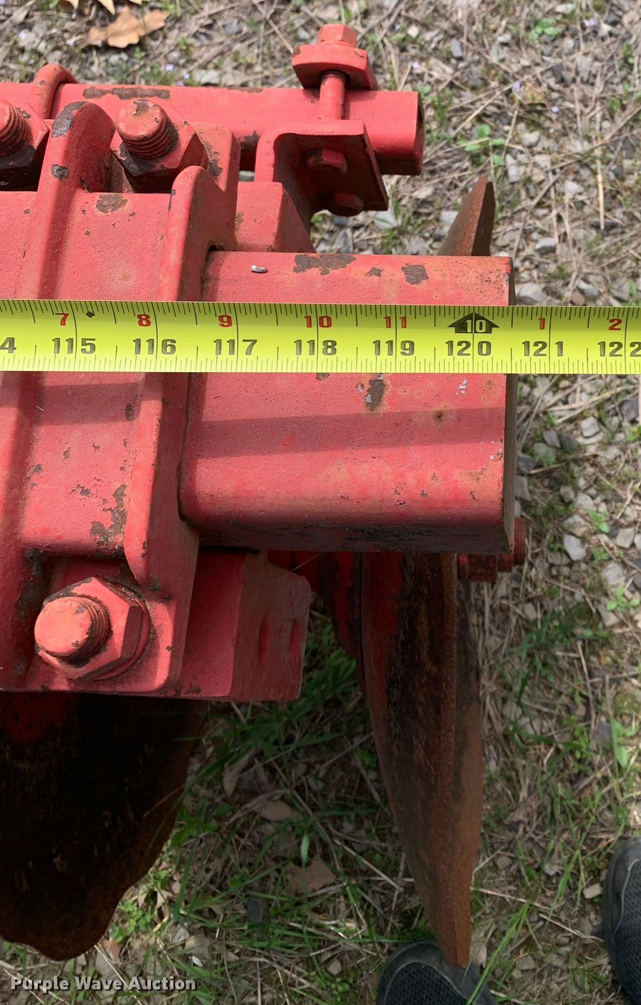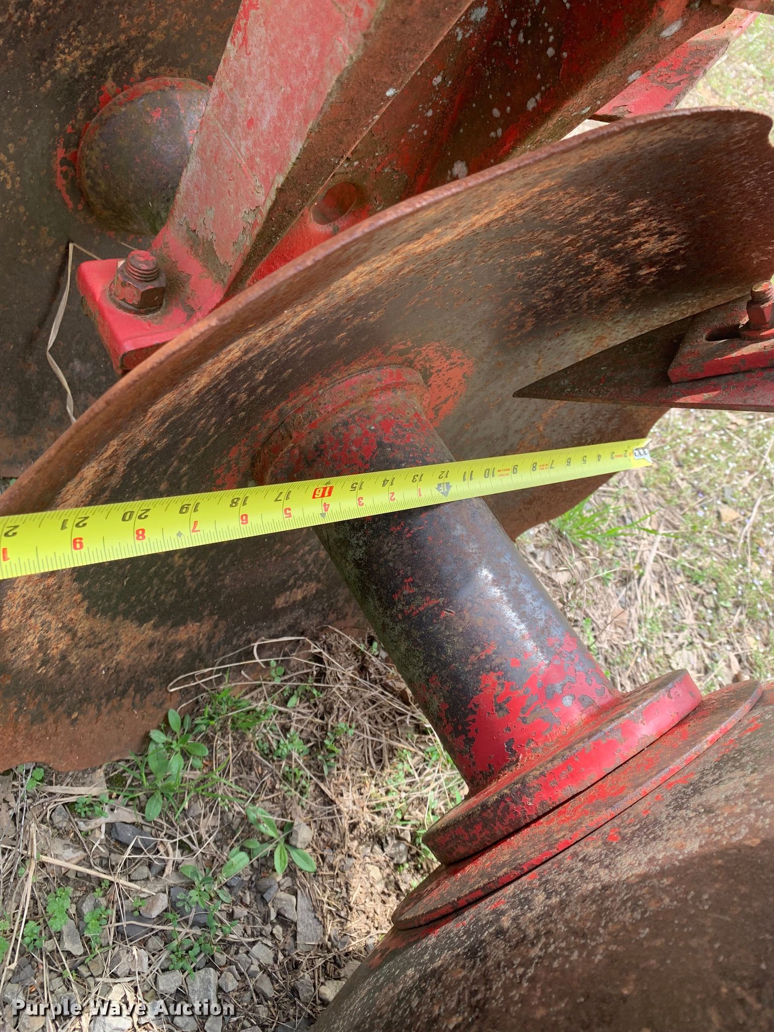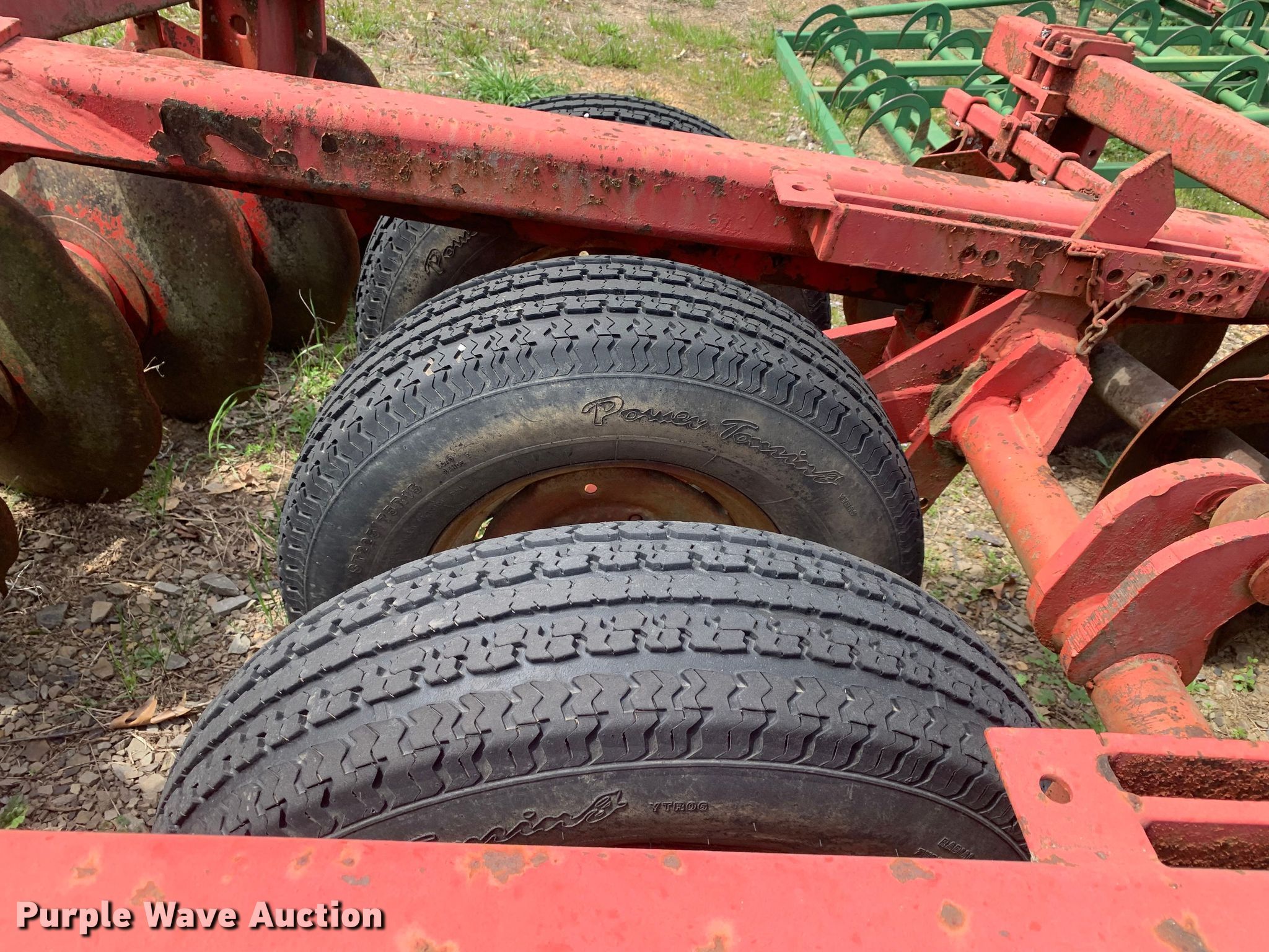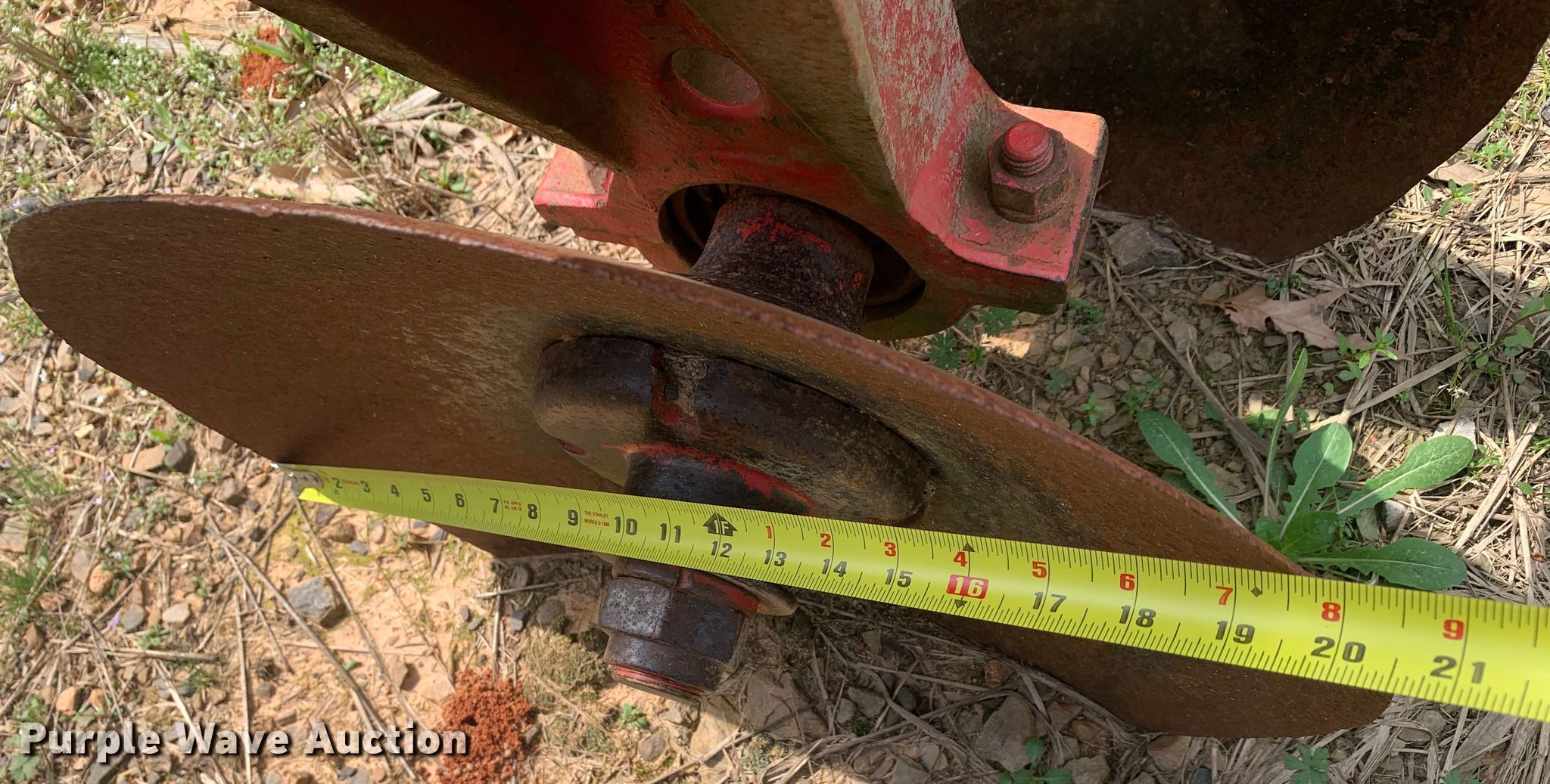 Bush Hog off-set disk. Overall width: 10'. Features Blade diameter Front: 20", Rear: 23", Spacing: 10.5", Disk scrapers, Operation Hydraulic lift. Tires Tire size: P215/70R15. Notes Flat tires. Don - Warren Cattle Company. 1503 Crowe Road. Lavaca, AR 72941