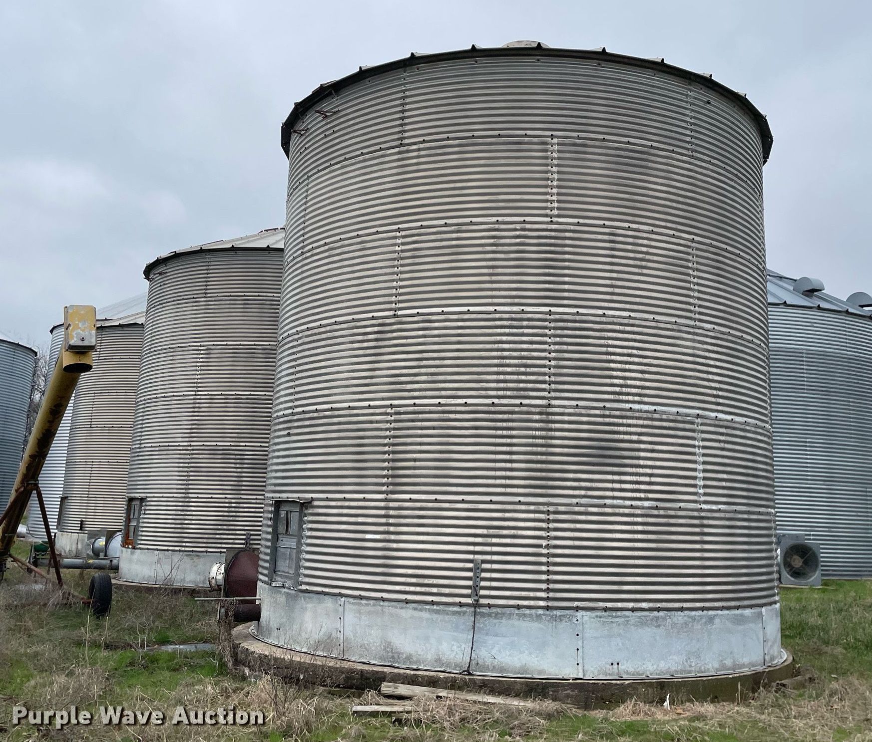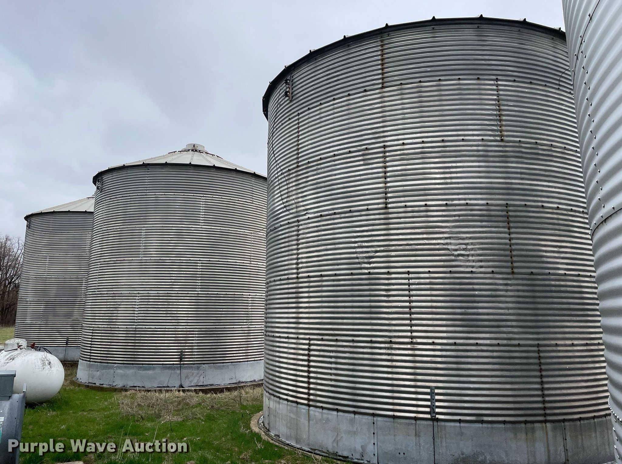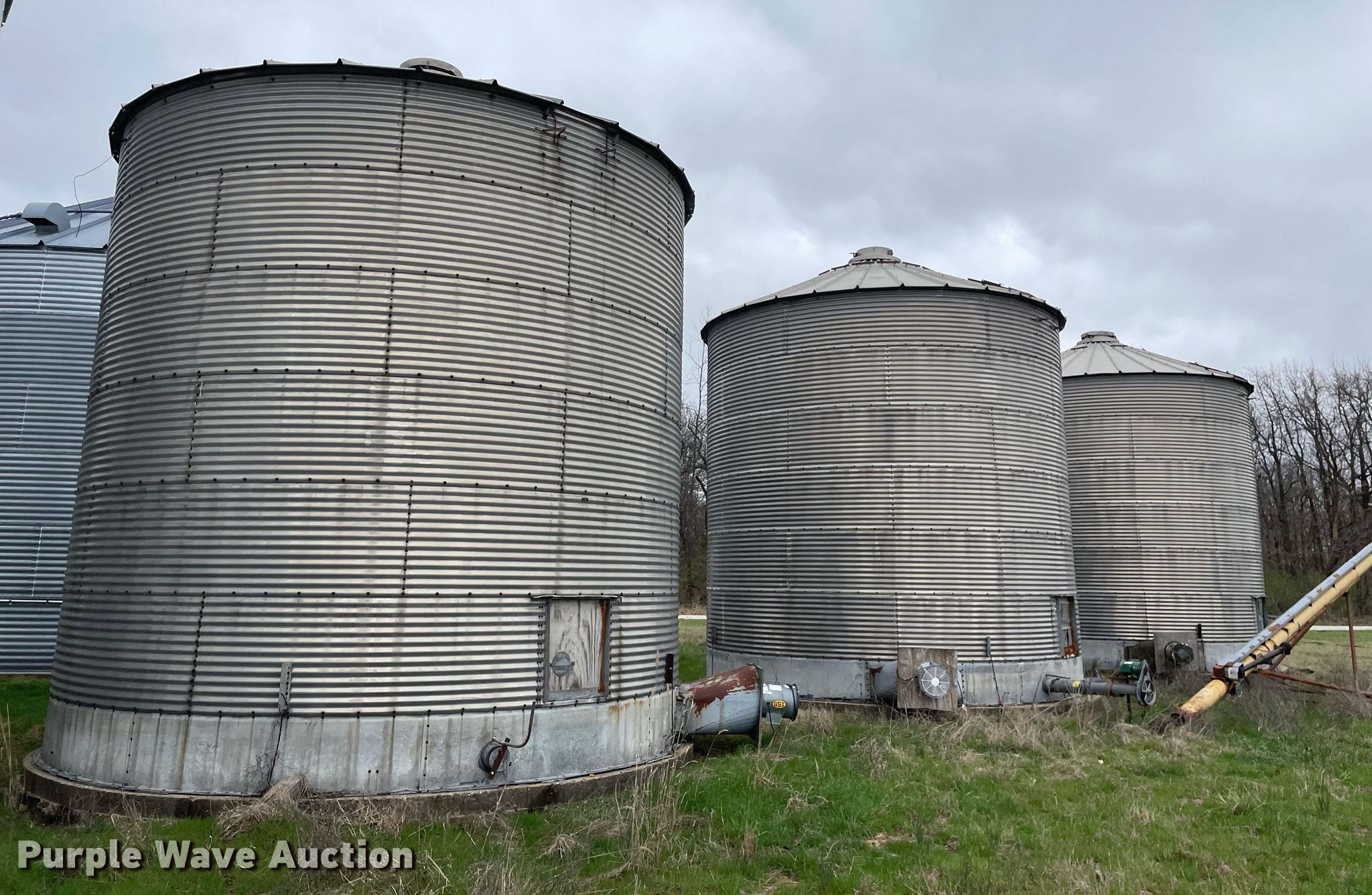 Purple Wave is selling a used Other Grain or Fertilizer Handling in Illinois. This item is a (3) grain bins with the following: Diameter: 18', (6) 32" rings, Capacity: 4,000 bushels, Drying floor, Grain dryers, Unloading motor