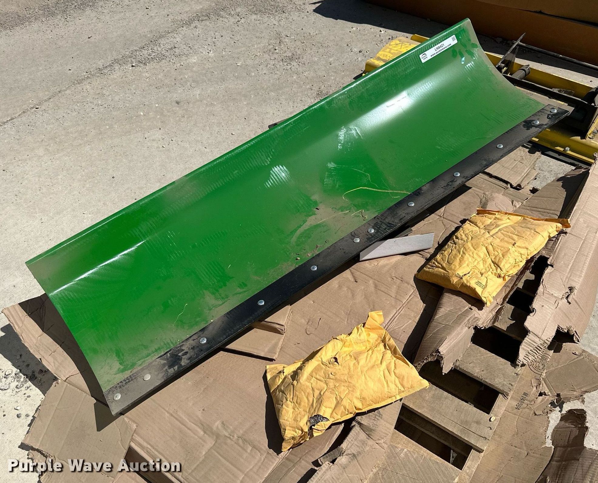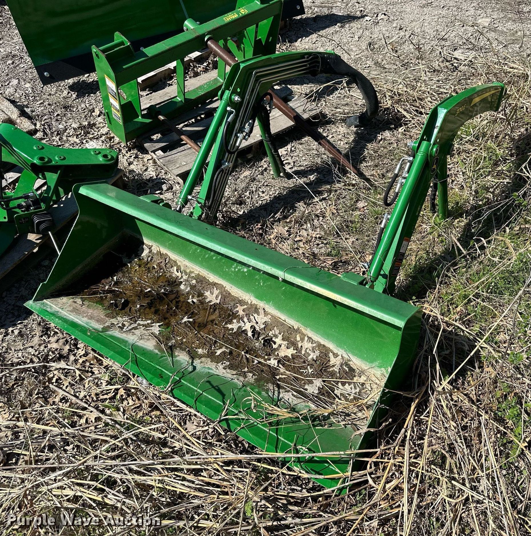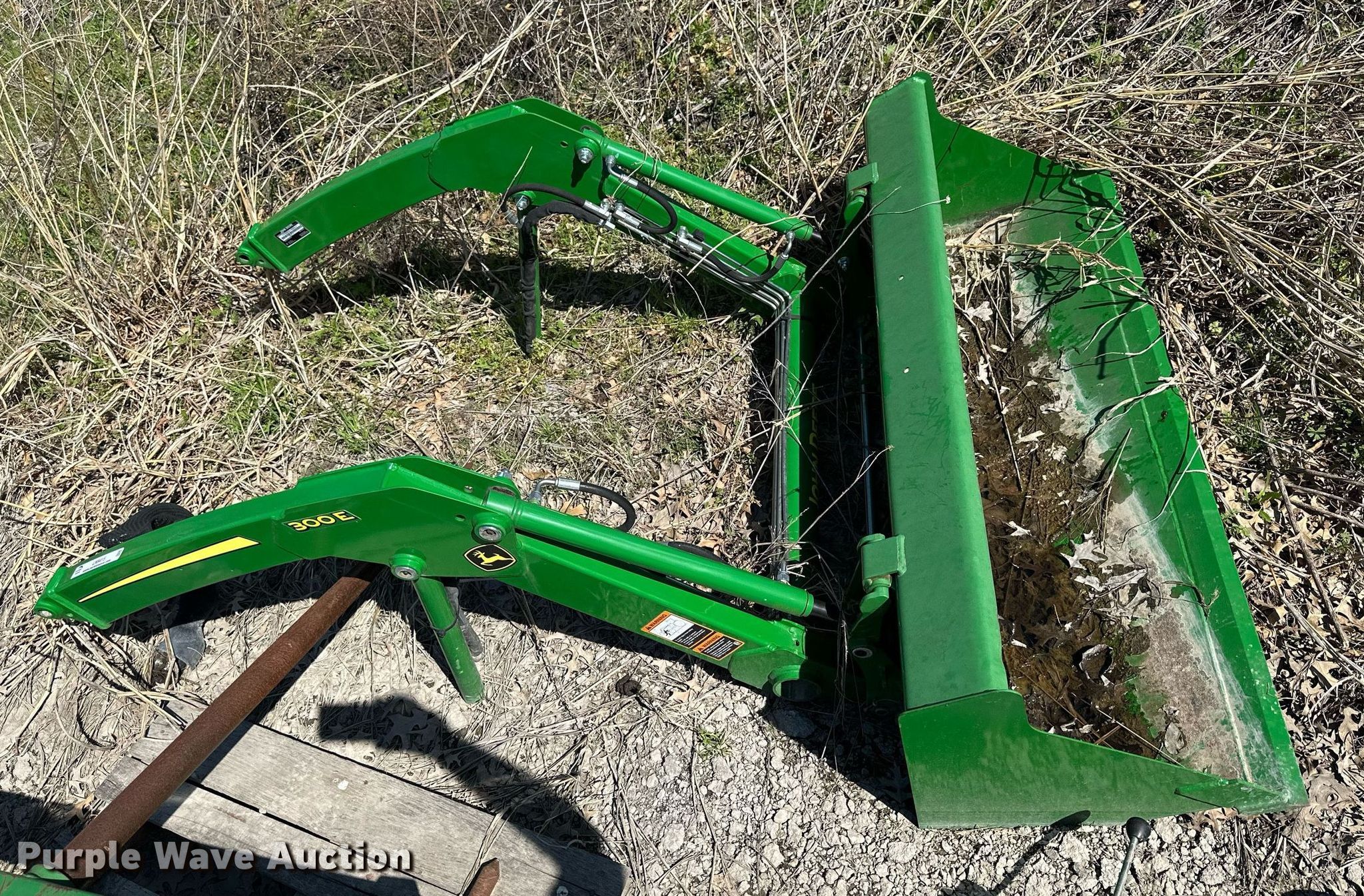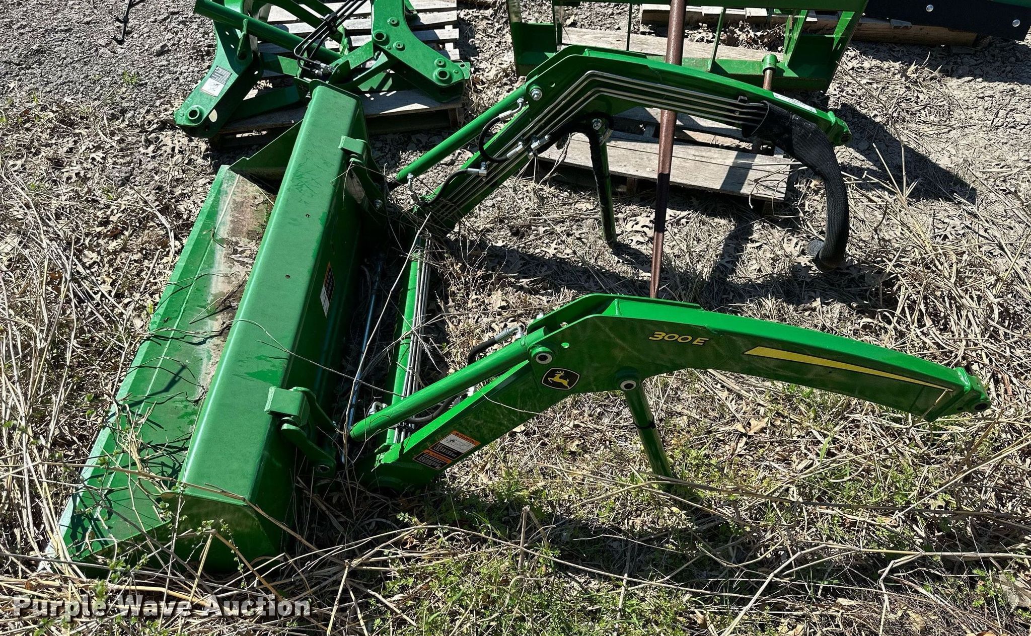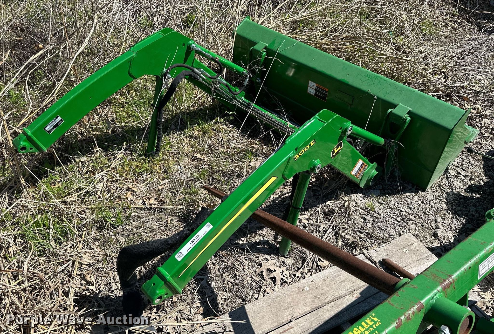 Purple Wave is selling a used Ag Tractor Loader or Attach. in Kansas. This item is a (3) attachments with the following: John Deere 300E loader, Bucket, Width: 5', Serial: 1P0300EXKJX056011, John Deere 72"W mower deck, Serial: 1M04172XLNM160003, John Deere 5'W blade, Hardware, Lift arm kit missing, Unknown operating conditions, ICN: LN9416, LN9421