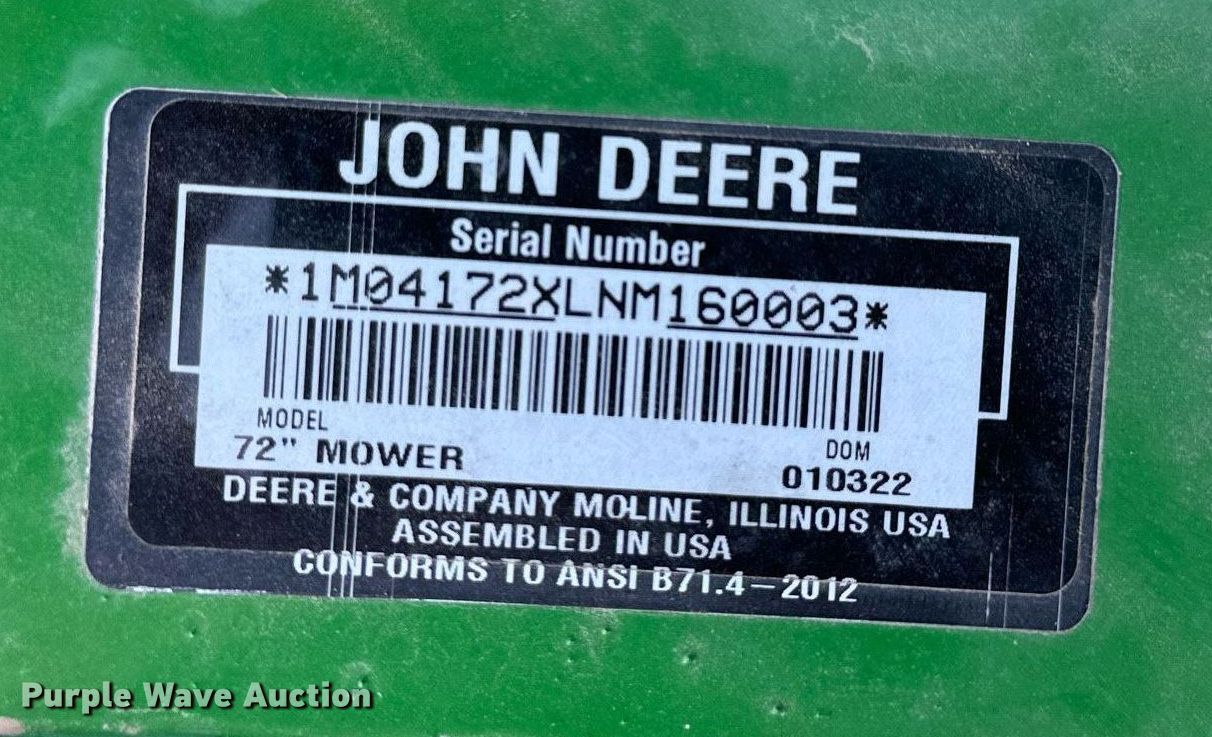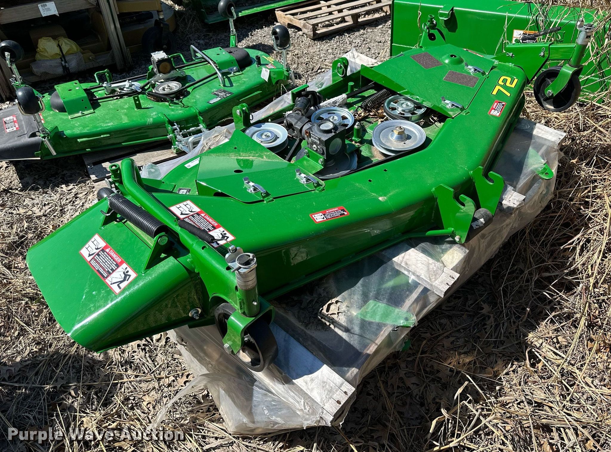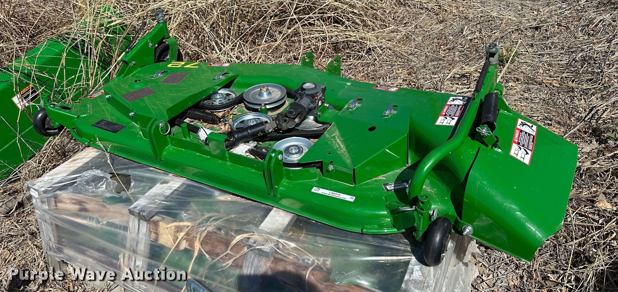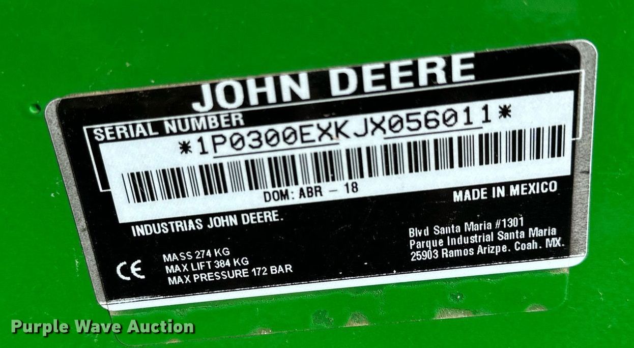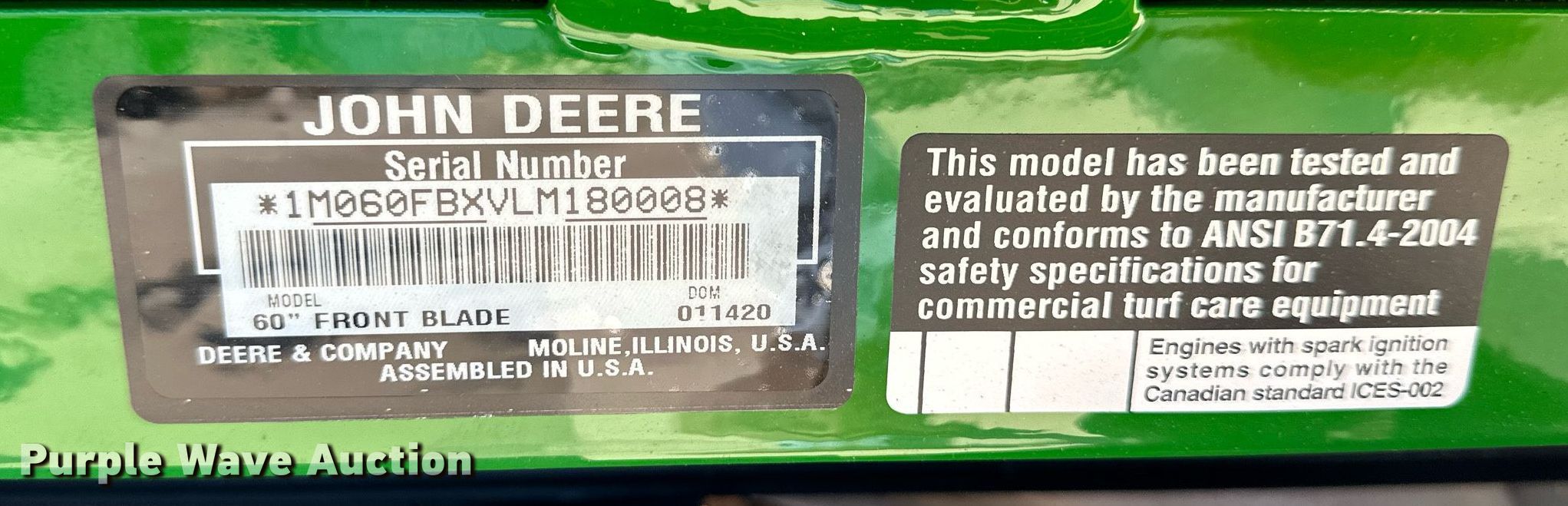 Purple Wave is selling a used Ag Tractor Loader or Attach. in Kansas. This item is a (3) attachments with the following: John Deere 300E loader, Bucket, Width: 5', Serial: 1P0300EXKJX056011, John Deere 72"W mower deck, Serial: 1M04172XLNM160003, John Deere 5'W blade, Hardware, Lift arm kit missing, Unknown operating conditions, ICN: LN9416, LN9421