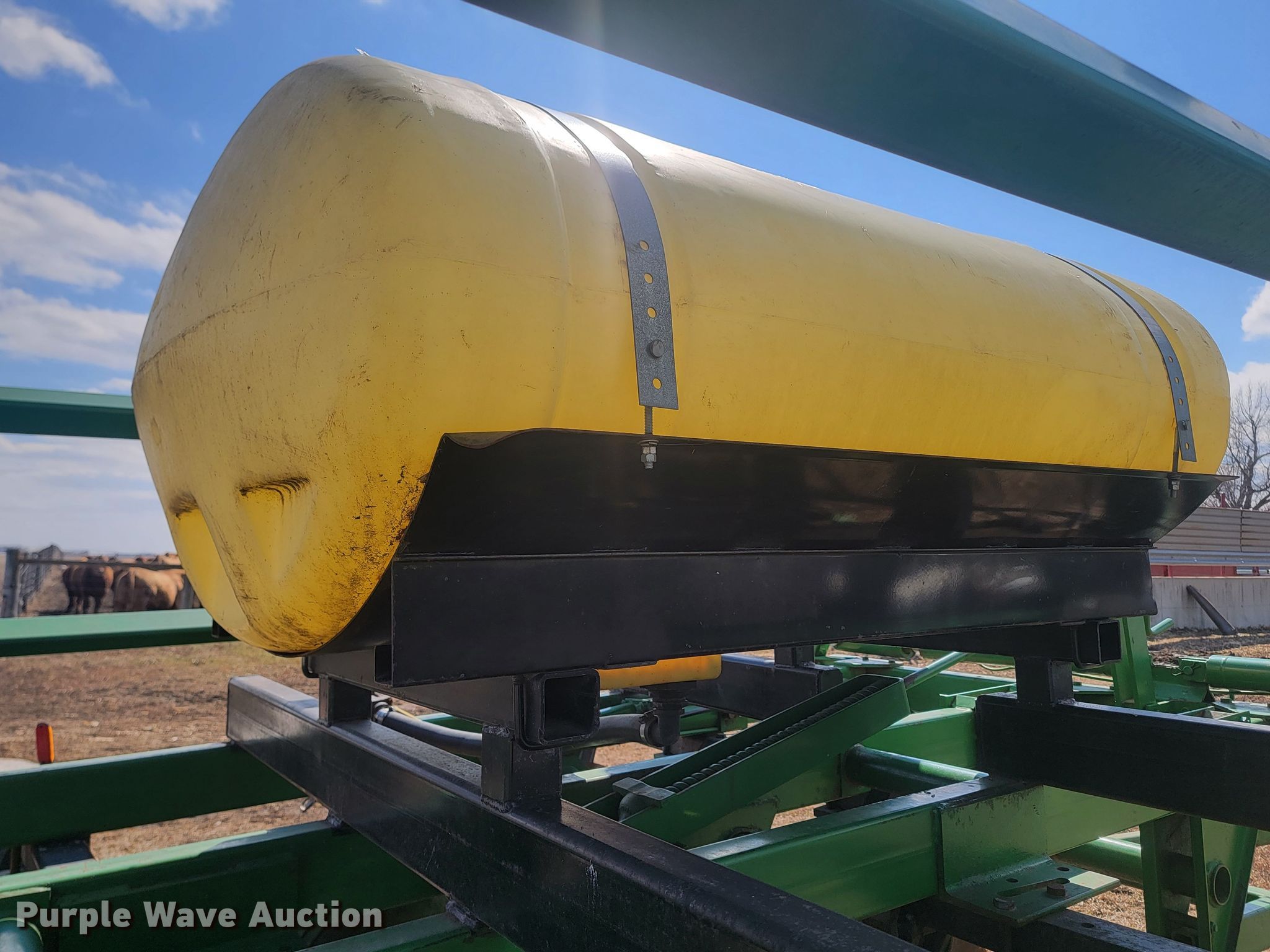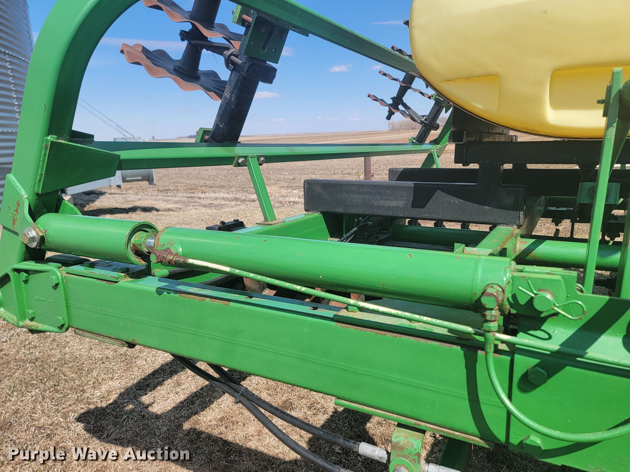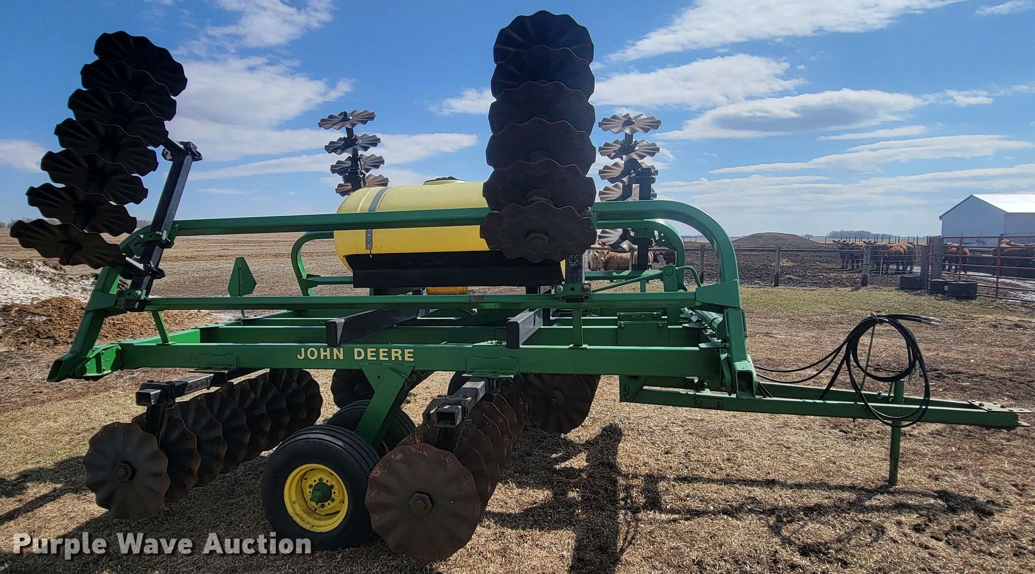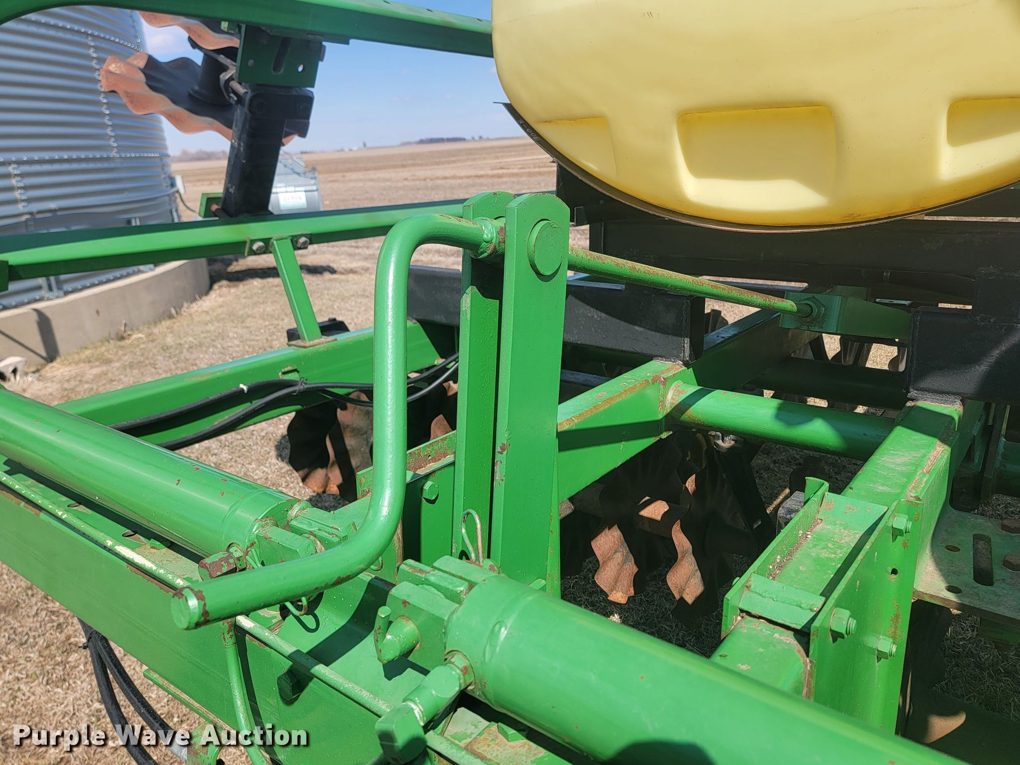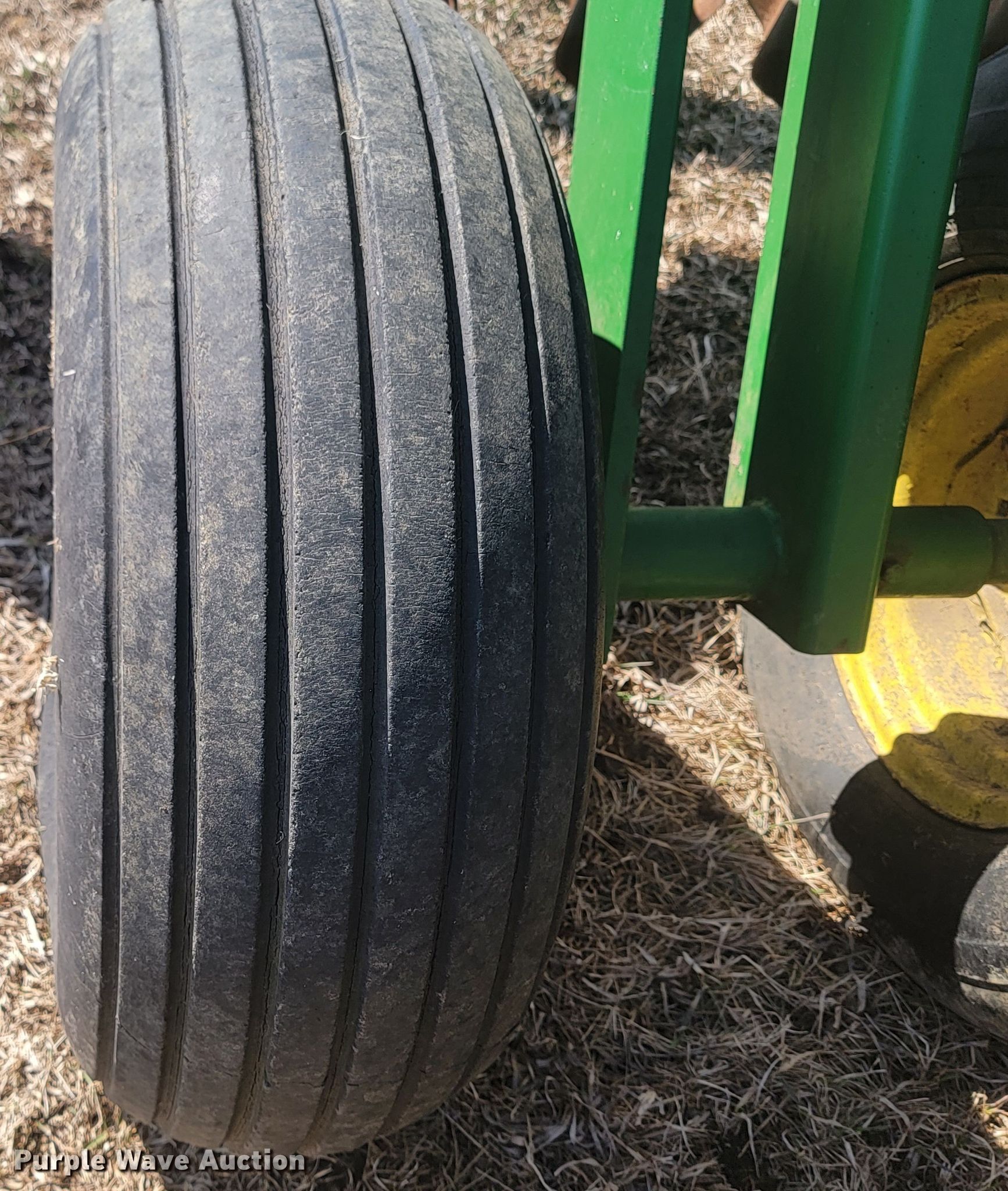 John Deere disk. Overall width: 24'. Features Front blades Diameter: 22", Spacing: 9", Rear blades Diameter: 22", Spacing: 9", Operation Hydraulic lift, Hydraulic fold, Leveler: Manual, Tank capacity: 300 gallons. Tires Tire size: 11L-14SL. 4094 260th Street. George, IA 51237