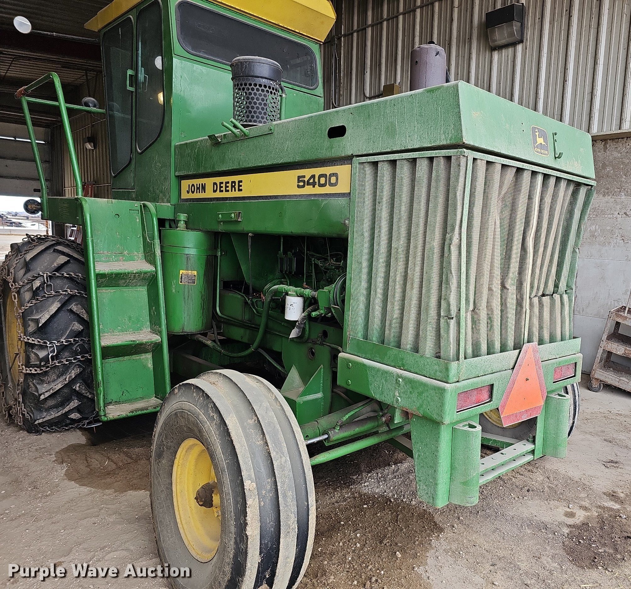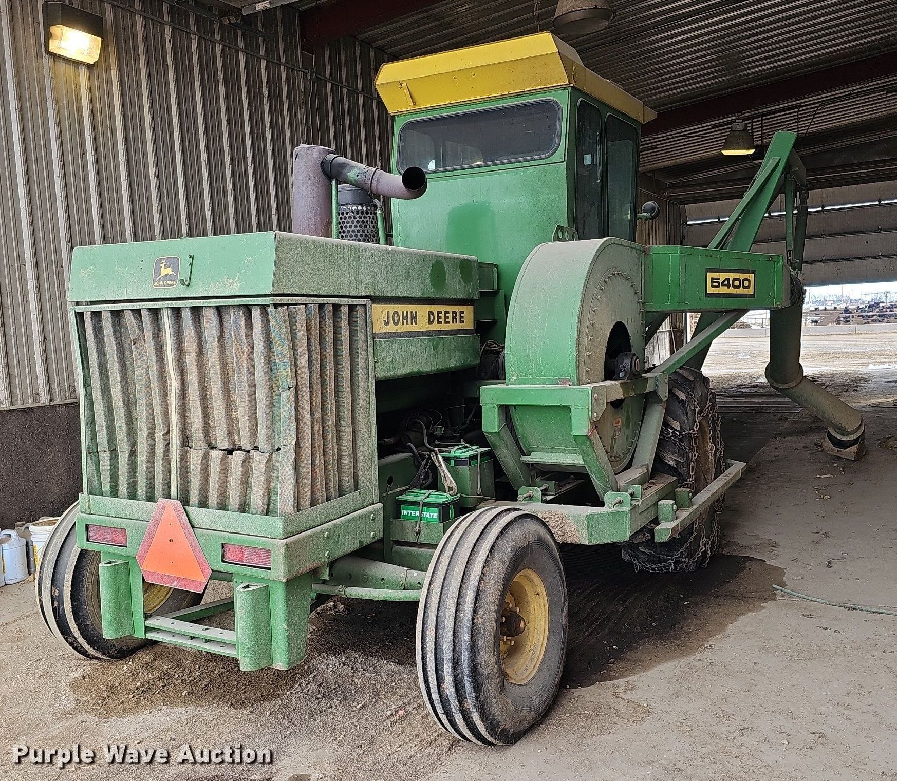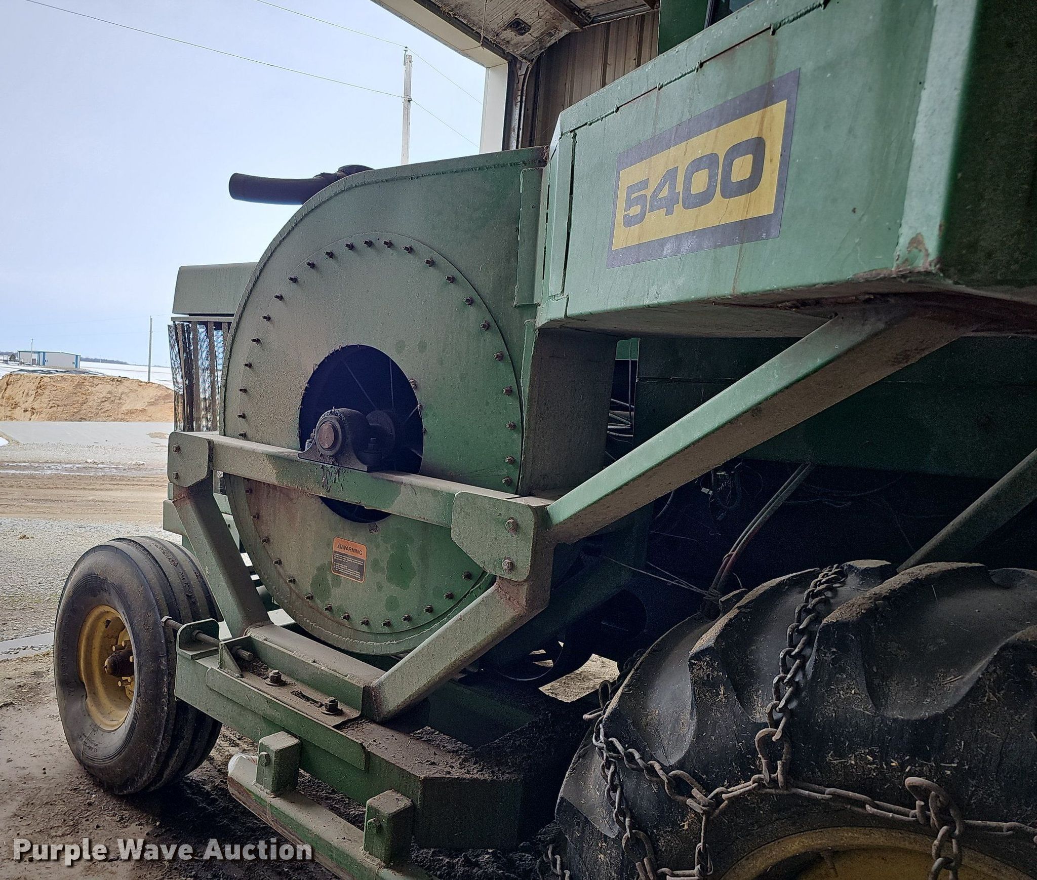 1995 John Deere 5400 bunk sweeper. Engine hours: 5,409 on meter, Serial: 049133. Engine John Deere, Cylinders: 6, Fuel type: Diesel. Transmission Hydrostatic, Differential lock. Operators station AC, Heat. Tires Front: 11.00-16, Rear: 18.4/15-26. Features 12"W blower head. Notes Non-operational engine, Non-operational unit. M Farm Inc.. 1255 County Road 130. Osceola, NE 68651