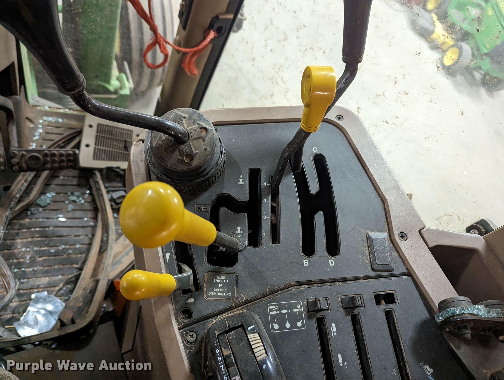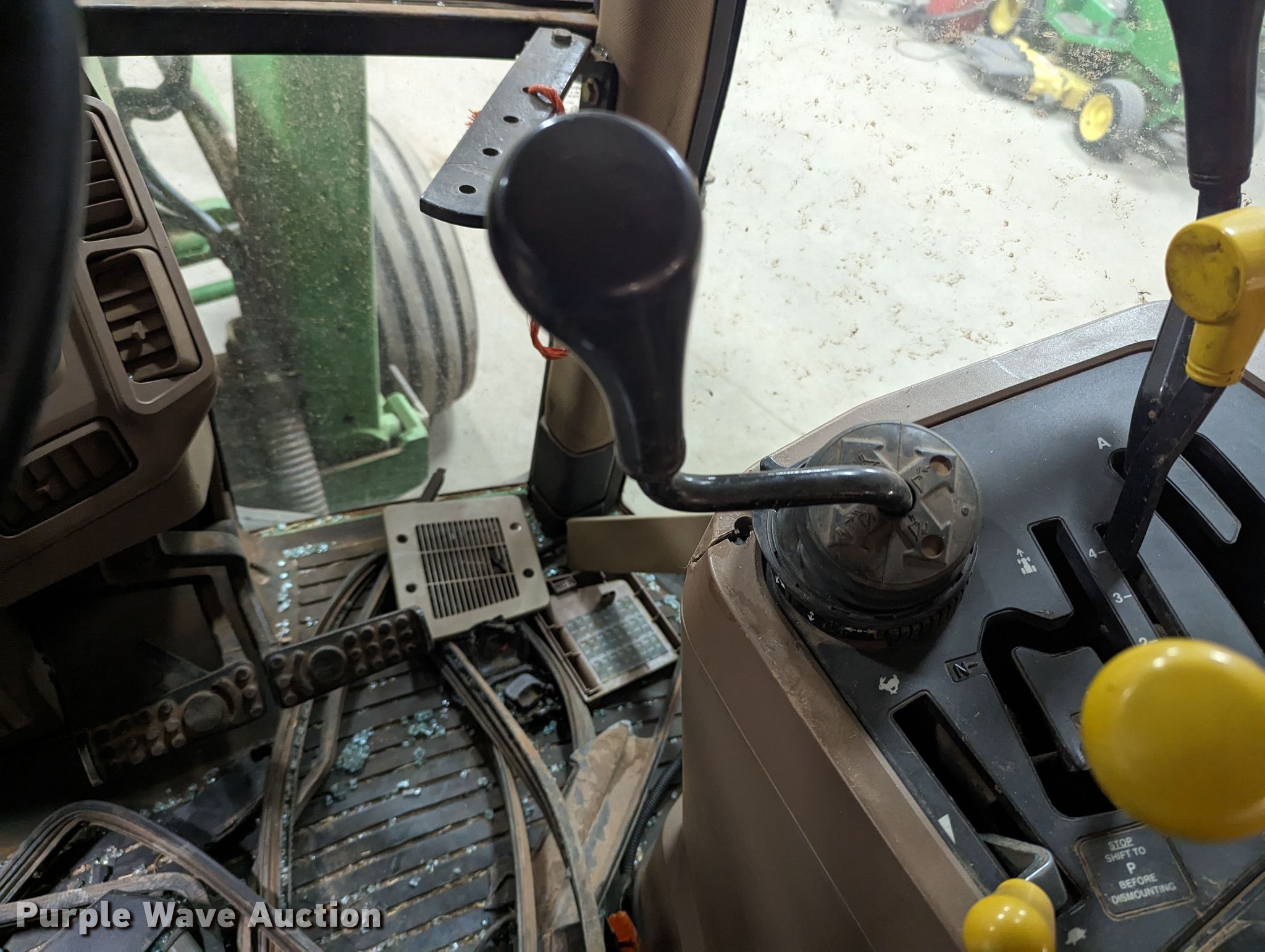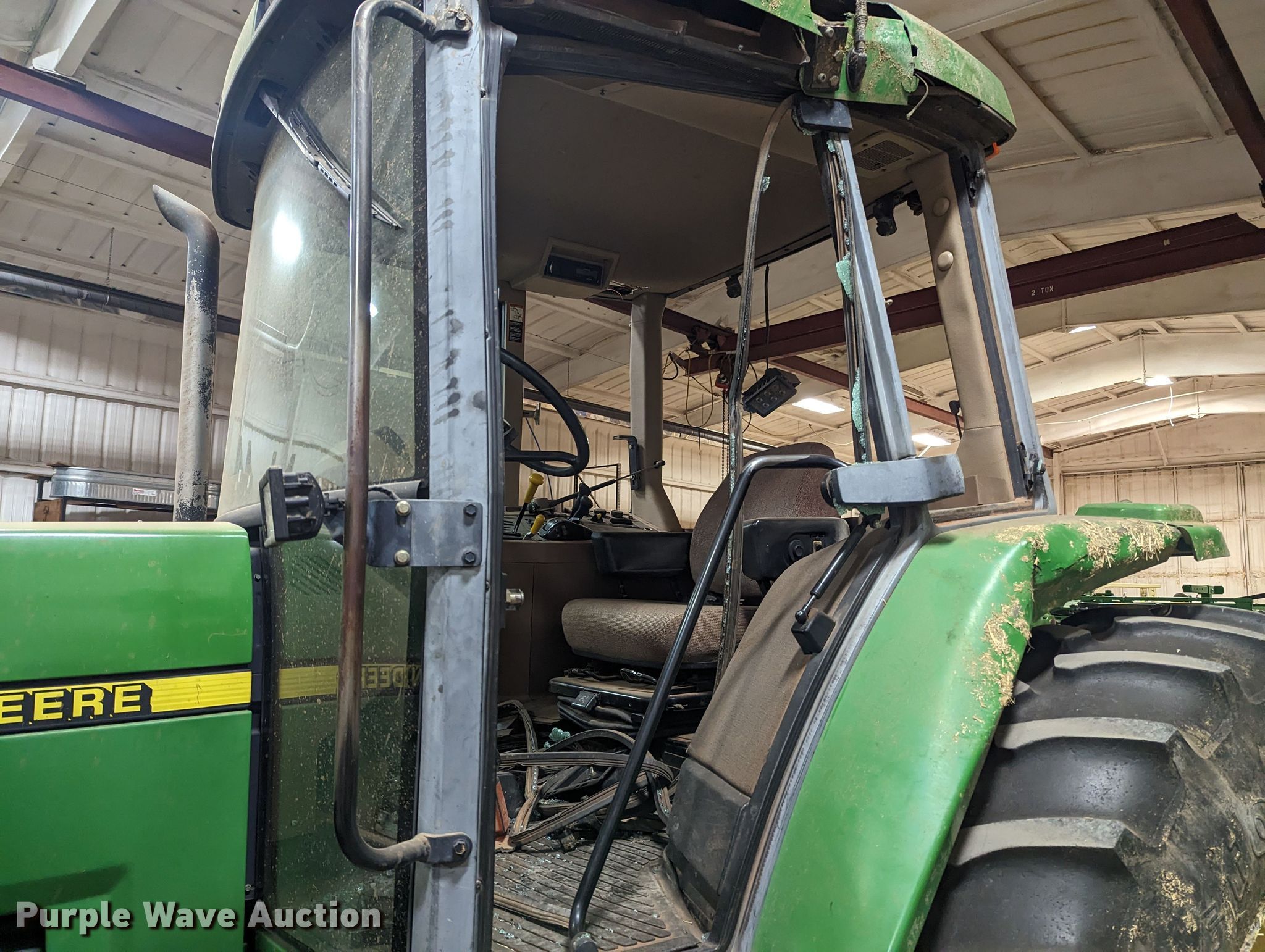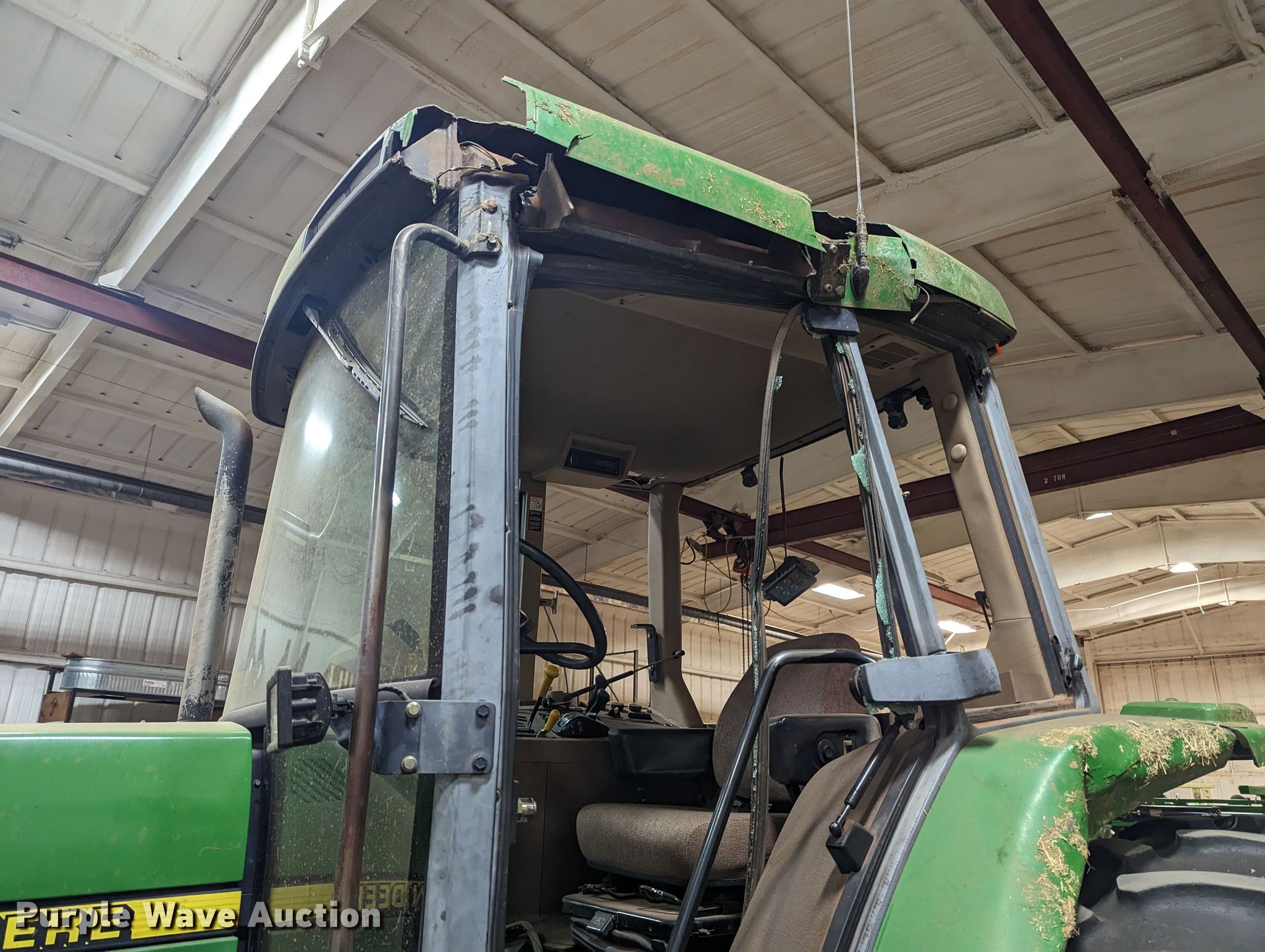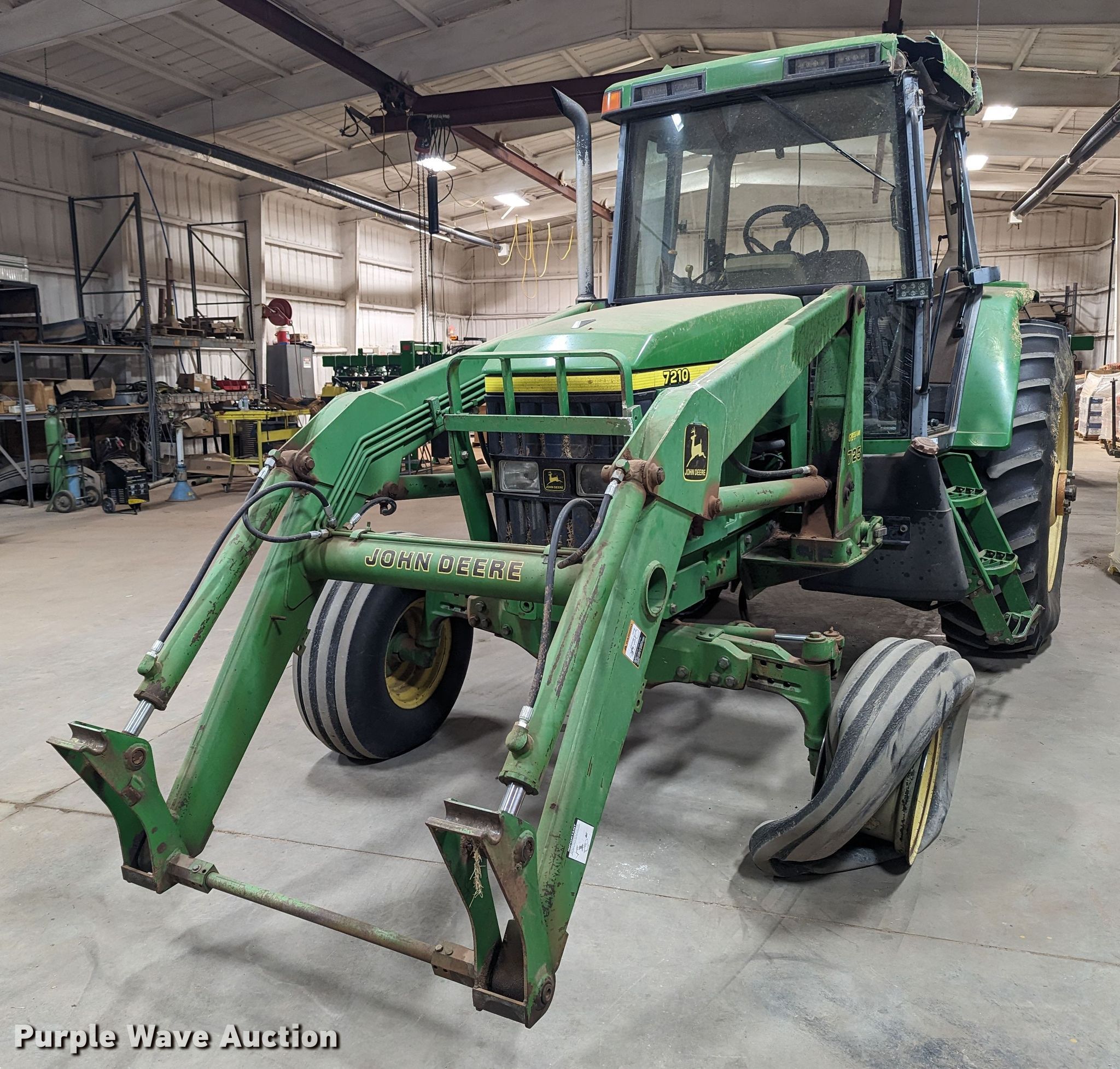 1999 John Deere 7210 tractor. Hours: 7,258 on meter, Serial: RW7210H020194, Claim #: 3-802069. Engine Displacement: 414 C.I.D., Cylinders: 6, Fuel type: Diesel. Transmission Powershift, 16F - 16R. Operators station AC, Heat. Features PTO: 540, Three point, Seven pin outlet, Hydraulic remote sets Rear: 2, Power beyond (hydraulics), Loader John Deere 725, Controls: Joystick. Tires Front: 11.00-16, Rear: 18.4R38. Notes Tornado damage, Cab damage, Glass missing, Tire damage. Oklahoma Farm Bureau Insurance. 4501 East Main Street. Weatherford, OK 73096