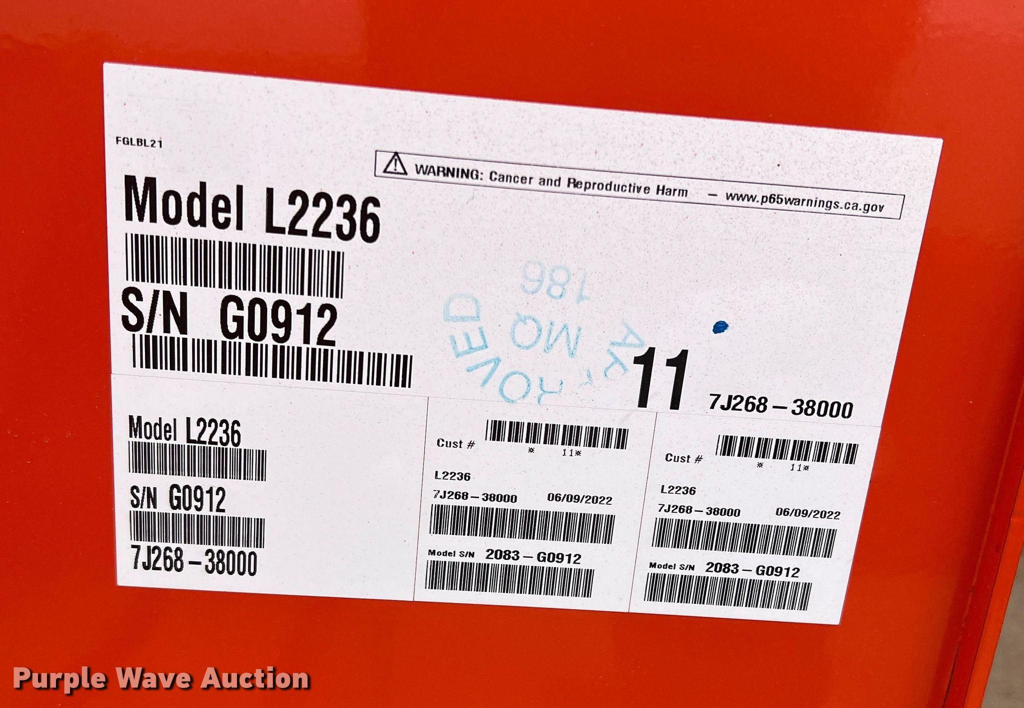Kubota L2236 72"W bucket. Serial: G0912. Kubota Tractor Corp. 1000 Kubota Dr. Grapevine, TX 76051