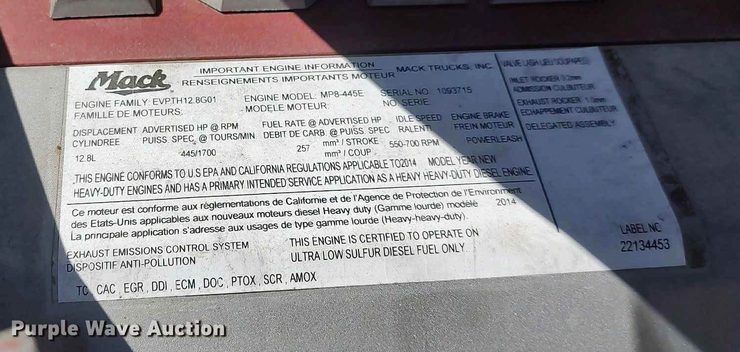 2016 Mack CXU613 semi truck. Miles: 626,787 on odometer, Hours: 19,041 on meter, Miles or hours may vary, unit still in use, VIN: 1M1AW09YXGM053271. Engine Model: MP8-445E, Serial: 1093715, Displacement: 12.8L, Cylinders: 6, Fuel type: Diesel. Transmission Manual, Speed: 10. Chassis Axles: Tandem, Differential lock: Inter-axle, Suspension: Air, Brakes: Air. Interior AC, Heat, Heated mirrors, Power windows, Power locks, Cruise control, Air ride cab, Sleeper Sleeper length: 56", Beds: Single, Rear climate control. Features Fifth wheel type: Fixed, Fuel tank: Dual. Tires Size: 11R22.5. Notes Auxiliary power unit non-operational. View repairs. Oklahoma title. Title has a lien that will be released following the close of the auction. Title distribution may be delayed up to 30 days from verification of funds. Grow Trucking. Ringwood, OK 73768