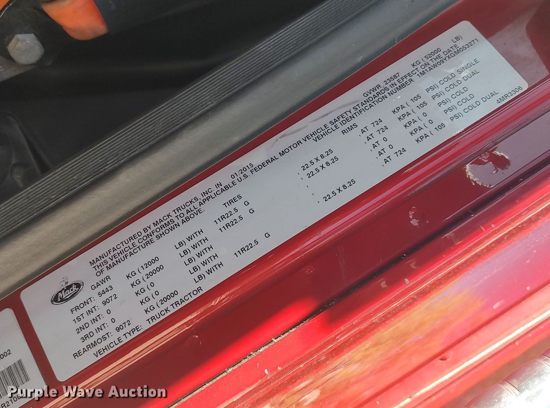 Purple Wave is selling a used Truck Tractor in Oklahoma. This item is a 2016 Mack CXU613 semi truck with the following: Miles: 626,787 on odometer, Hours: 19,041 on meter, Miles or hours may vary, unit still in use, VIN: 1M1AW09YXGM053271