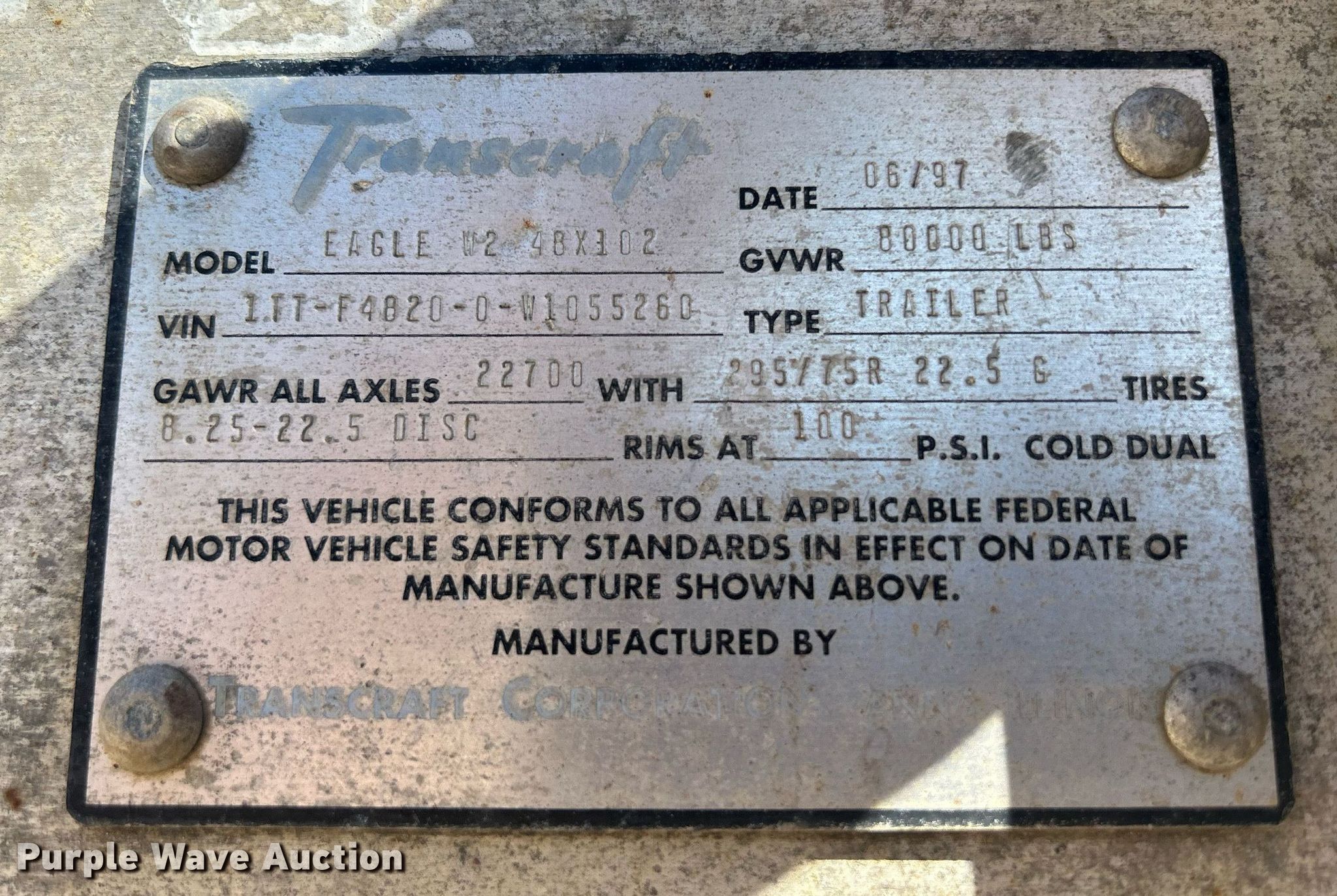 1998 Transcraft Corp Eagle W2 flatbed trailer. VIN: 1TTF48200W1055260. Dimensions Overall: 48' L x 102" W, Deck: 47' 10" L x 98" W, Deck height: 56". Features Deck type: Aluminum. Chassis Landing gear: Dual, Suspension: Air, Brakes: Air, Axles: Spread, GVWR: 80,000 lbs. Tires Steel wheels, Size: 295/75R22.5. Iowa title. Title distribution may be delayed up to 14 days from verification of funds. Tom McManus Backhoe and Trucking. 310 Hwy 67. Camanche, IA 52730