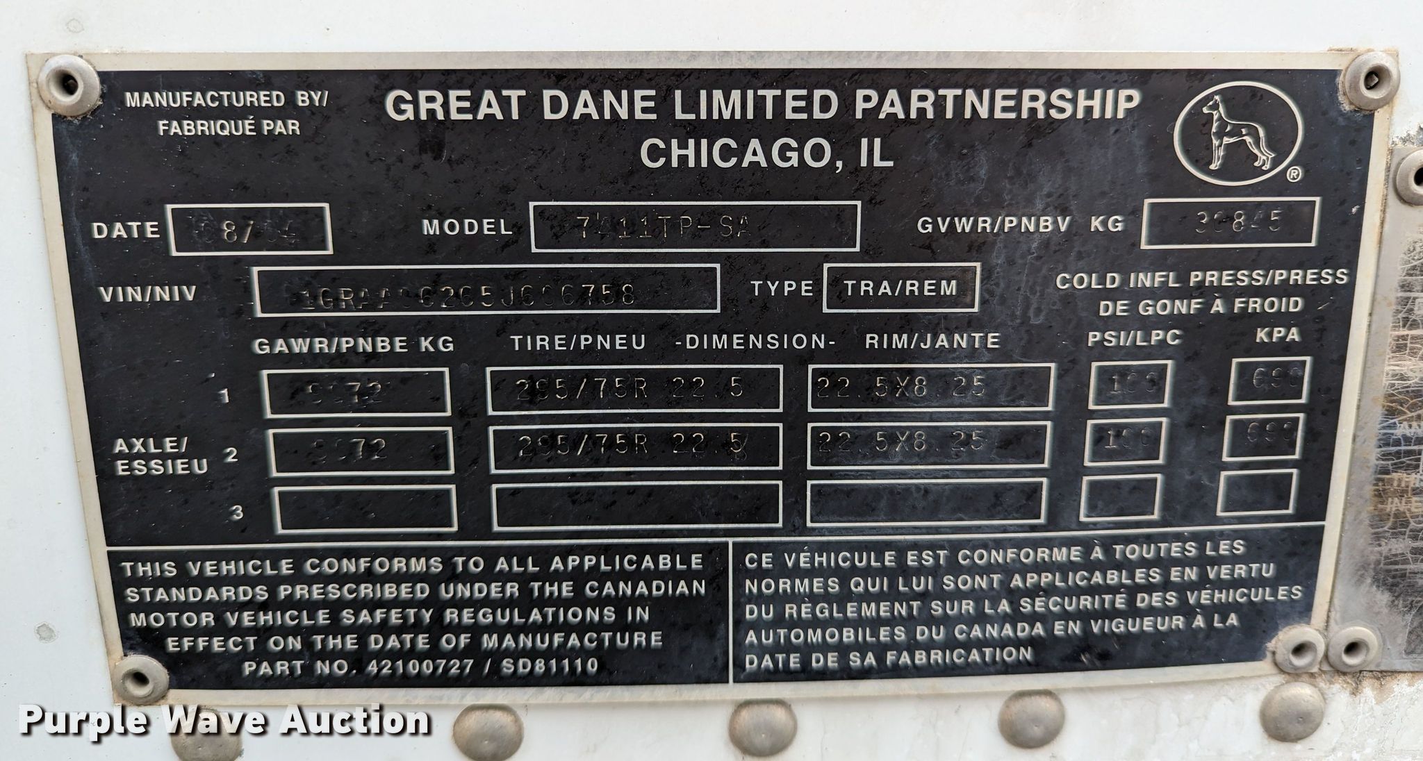 Purple Wave is selling a used Dry Van Trailer in Oklahoma. This item is a 2005 Great Dane 7411TP-SA dry van trailer with the following: VIN: 1GRAA06265J606758