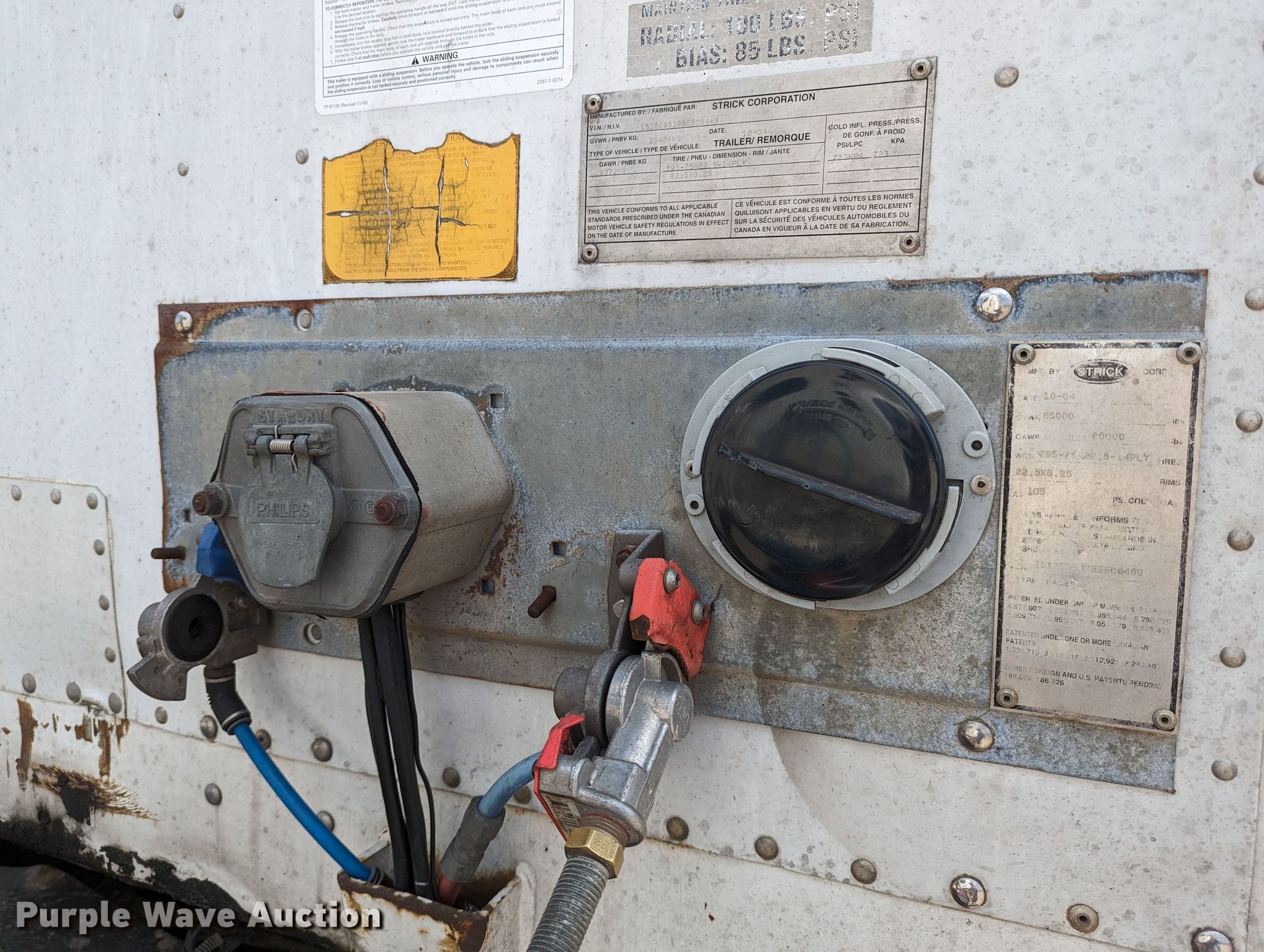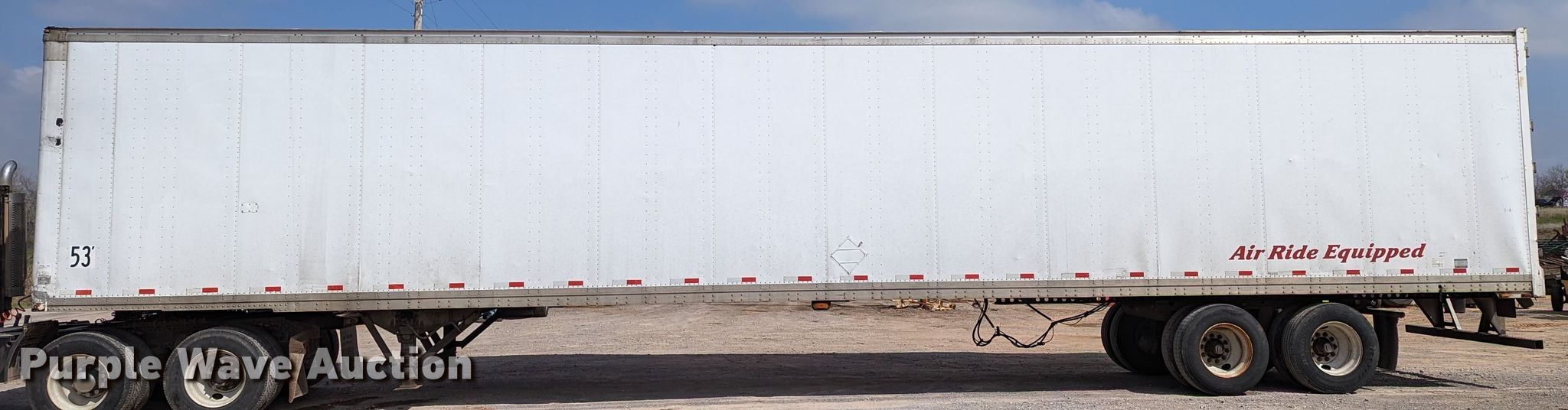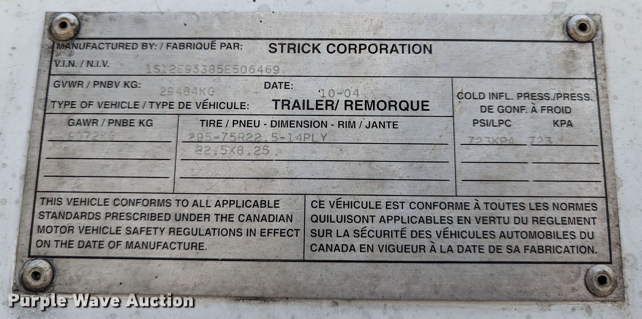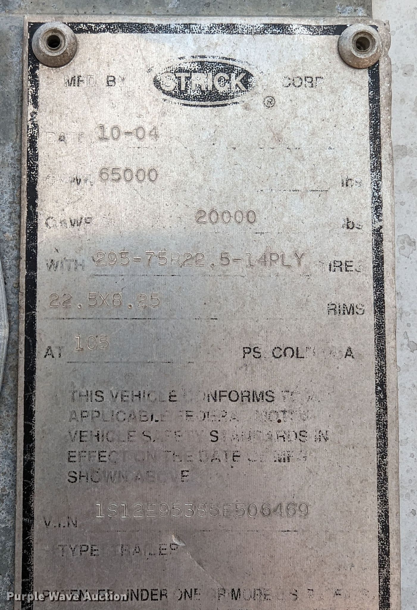 2005 Strick dry van trailer. VIN: 1S12E95385E506469. Dimensions Overall: 53' L x 102" W. Features Deck type: Wood. Chassis Landing gear: Dual, Suspension: Air, Brakes: Air, Axles: Tandem, GVWR: 65,000 lbs, GAWR: 20,000 lbs. Tires Steel wheels, Size: 295/75R22.5. Oklahoma title. Title distribution may be delayed up to 30 days from verification of funds. Jim-N-I Services, Inc. Retirement Auction - Open Inspection May 3rd. 3549 County Street 2940. Bradley, OK 73011