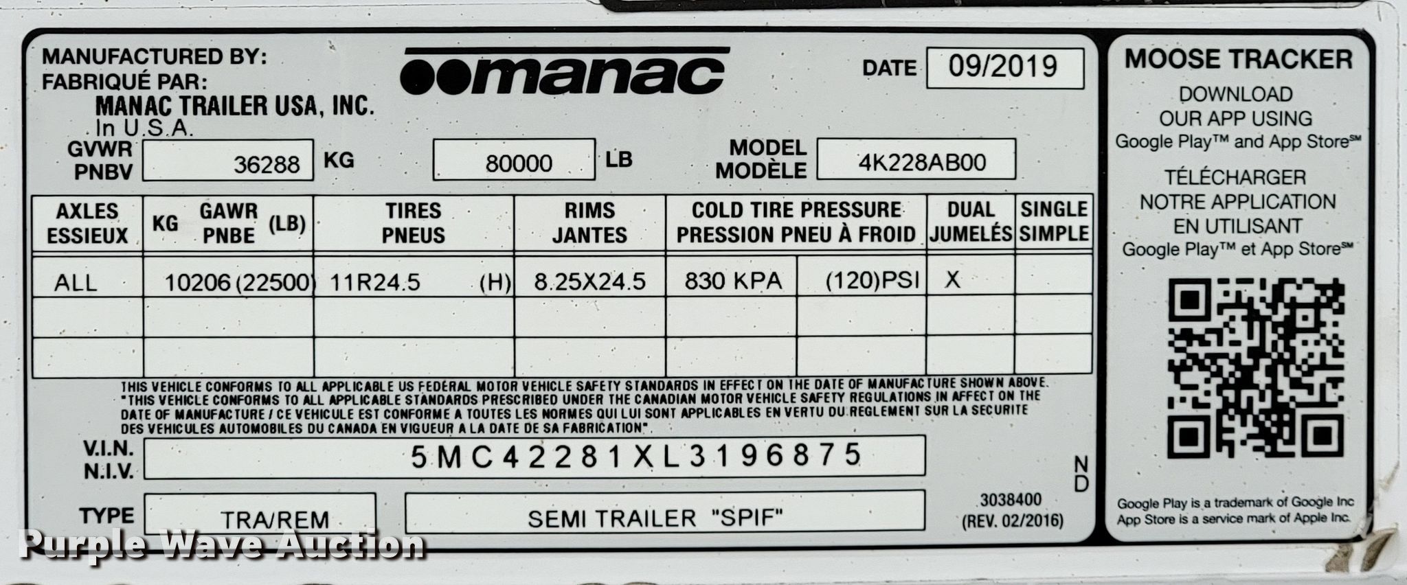Purple Wave is selling a used End Dump Rock Trailer in Oklahoma. This item is a 2019 Manac 4K228AB00 end dump trailer with the following: VIN: 5MC42281XL3196875