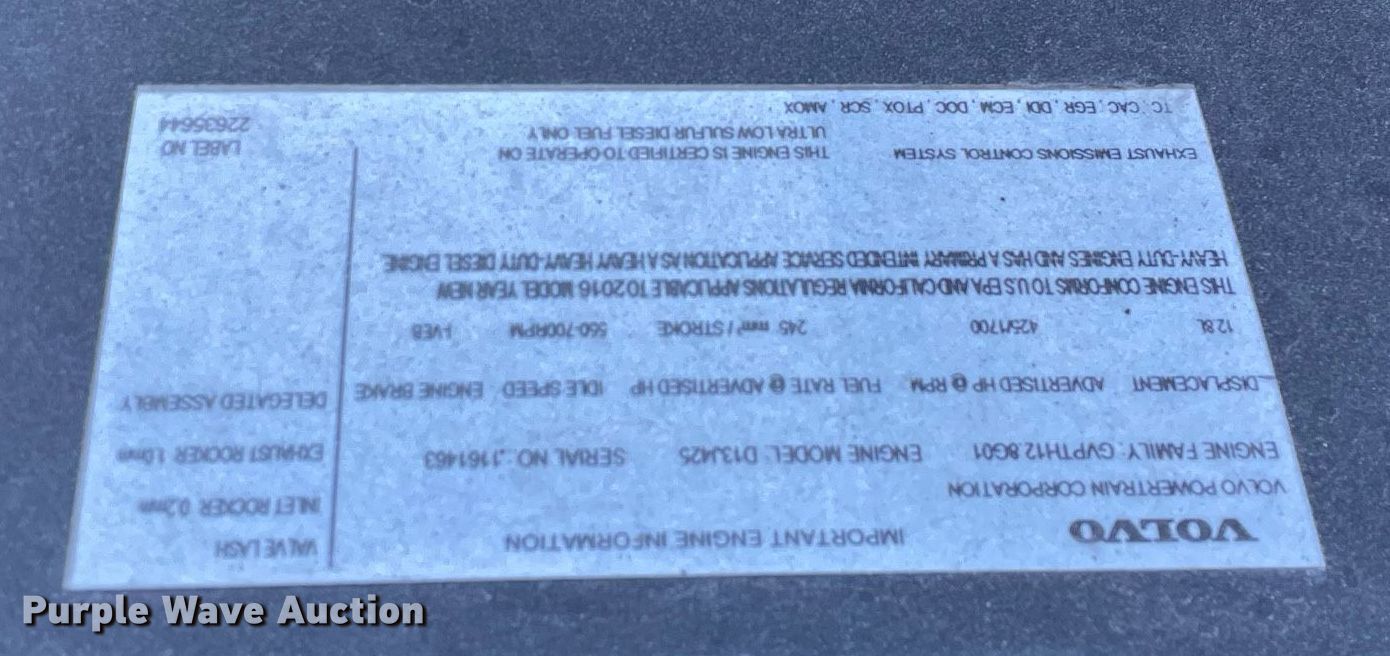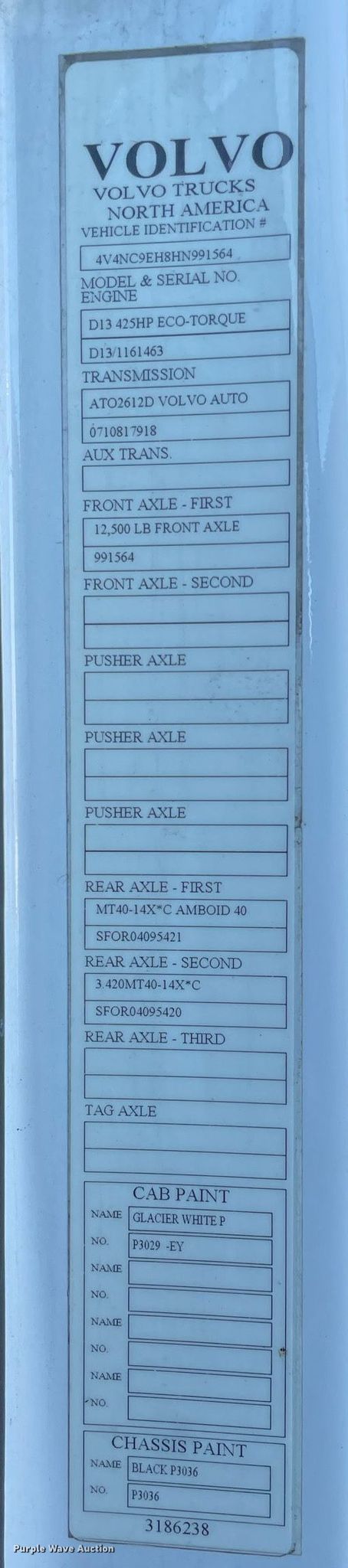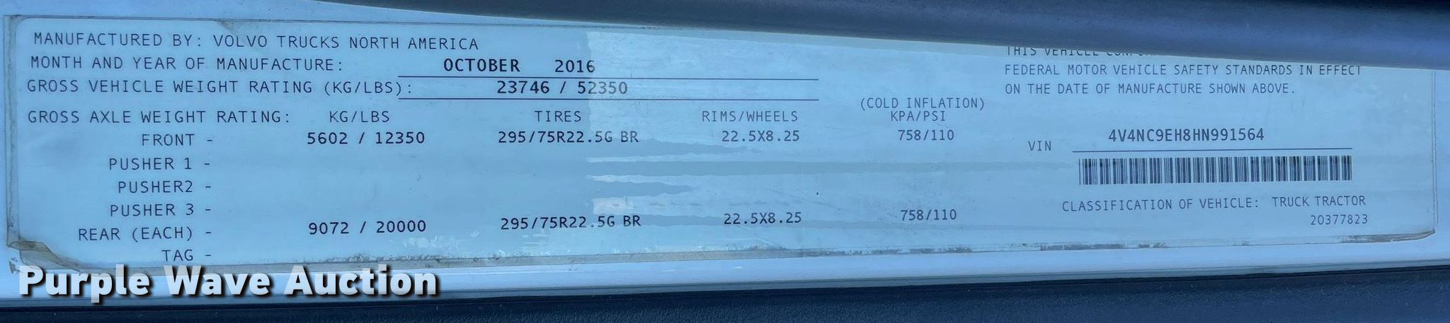 2017 Volvo VNL semi truck. Miles: Unknown, VIN: 4V4NC9EH8HN991564, Unit #: 180. Engine Volvo D13, Displacement: 12.8L, Cylinders: 6, Fuel type: Diesel. Transmission Automatic. Chassis Axles: Tandem, Differential lock: Inter-axle, Suspension: Air Dump valves, Brakes: Air, GVWR: 52,350 lbs FAWR: 12,350 lbs, IAWR: 20,000 lbs, RAWR: 20,000 lbs. Interior AC, Heat, Heated mirrors, Cruise control, Air ride cab. Tires Size: 295/75R22.5. Notes Unit will need to be towed or hauled , Parts missing Fifth wheel , Fuel tanks, Non-operational unit. Michigan title. Title distribution may be delayed up to 14 days from verification of funds. Aim Transportation Solutions. 1601 East 165th Street. Hammond, IN 46320