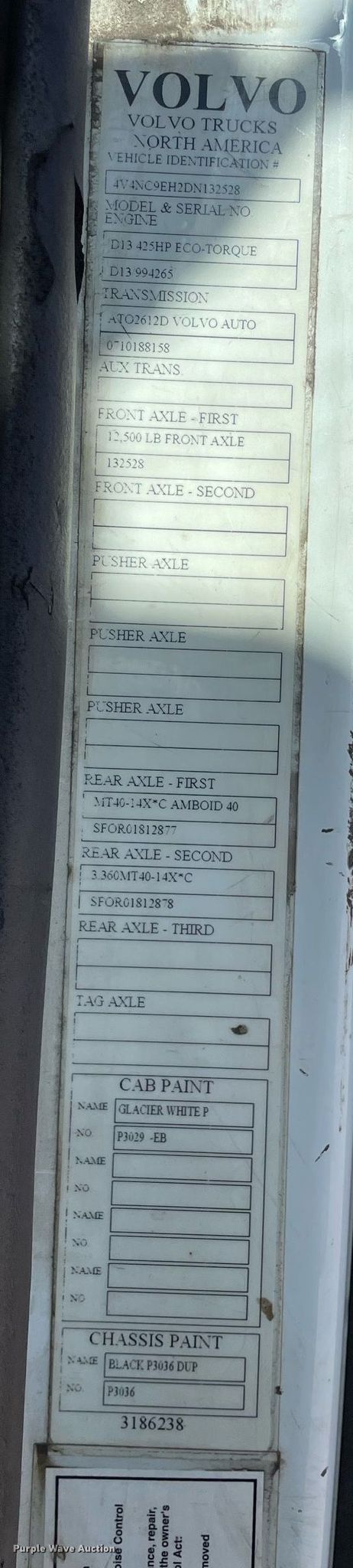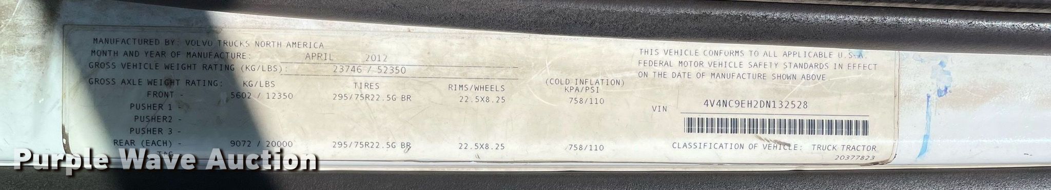 2013 Volvo semi truck. Miles: 671,062 on odometer, Hours: 26,991 on meter, VIN: 4V4NC9EH2DN132528, Unit #: 147. Engine Volvo D13, Displacement: 12.8L, Cylinders: 6, Fuel type: Diesel. Transmission Automatic. Chassis Axles: Tandem, Differential lock: Inter-axle, Suspension: Air Dump valves, Brakes: Air, GVWR: 52,350 lbs FAWR: 12,350 lbs, IAWR: 20,000 lbs, RAWR: 20,000 lbs. Interior AC, Heat, Cruise control, Air ride cab. Features Deck plate: Aluminum, Fifth wheel type: Air operated, Sliding, Fuel tank: Dual. Tires Size: 295/75R22.5. Michigan title. Title distribution may be delayed up to 14 days from verification of funds. Aim Transportation Solutions. 48649 Schooner Dr. Van Buren Township, MI 48111