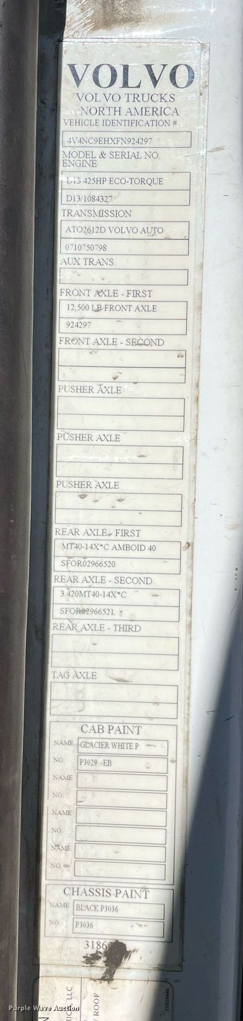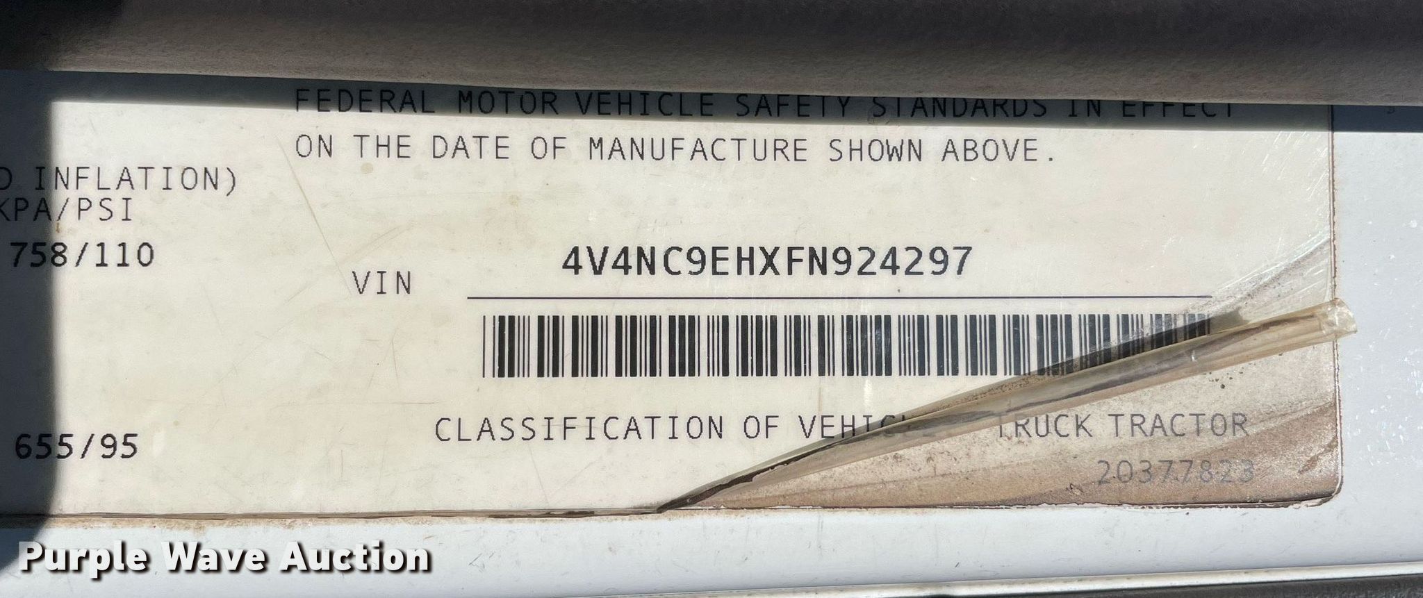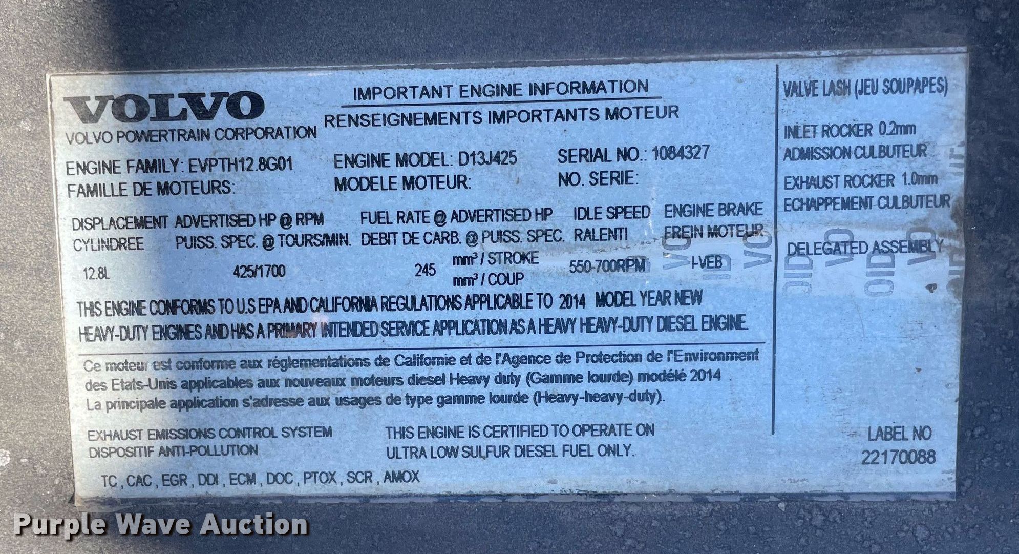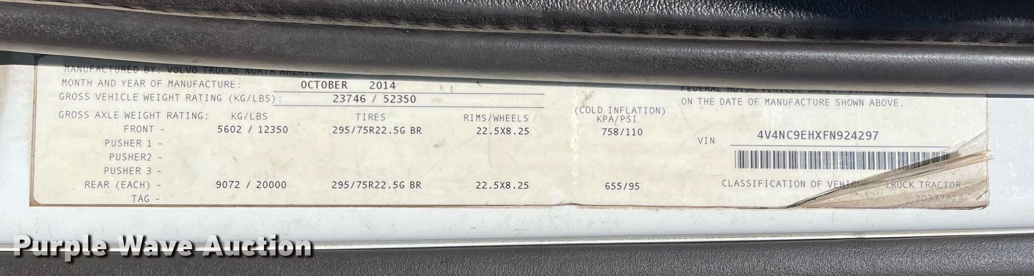 2015 Volvo semi truck. Miles: 366,831 on odometer, Hours: 18,917 on meter, VIN: 4V4NC9EHXFN924297, Unit #: 169. Engine Volvo D13, Displacement: 12.8L, Cylinders: 6, Fuel type: Diesel. Transmission Automatic. Chassis Axles: Tandem, Differential lock: Inter-axle, Suspension: Air Dump valves, Brakes: Air, GVWR: 52,350 lbs FAWR: 12,350 lbs, IAWR: 20,000 lbs, RAWR: 20,000 lbs. Interior AC, Heat, Heated mirrors, Cruise control, Air ride cab. Features Deck plate: Aluminum, Fifth wheel type: Air operated, Sliding, Fuel tank: Dual. Tires Size: 295/75R22.5. Notes Parts to be removed prior to auction: Bulk head and air lines , Trailer electric plug, Dash warning indicator: Traction control, Air leak. Michigan title. Title distribution may be delayed up to 14 days from verification of funds. Aim Transportation Solutions. 48649 Schooner Dr. Van Buren Township, MI 48111