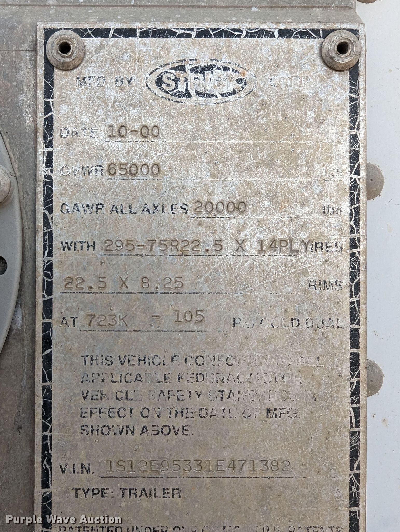 2001 Strick dry van trailer. VIN: 1S12E95331E471382. Dimensions Overall: 53' L x 102" W. Features Deck type: Wood. Chassis Landing gear: Dual, Suspension: Air, Brakes: Air, Axles: Tandem, GVWR: 65,000 lbs, GAWR: 20,000 lbs. Tires Steel wheels, Size: 295/75R22.5. Oklahoma title. Title distribution may be delayed up to 30 days from verification of funds. Jim-N-I Services, Inc. Retirement Auction - Open Inspection May 3rd. 3549 County Street 2940. Bradley, OK 73011