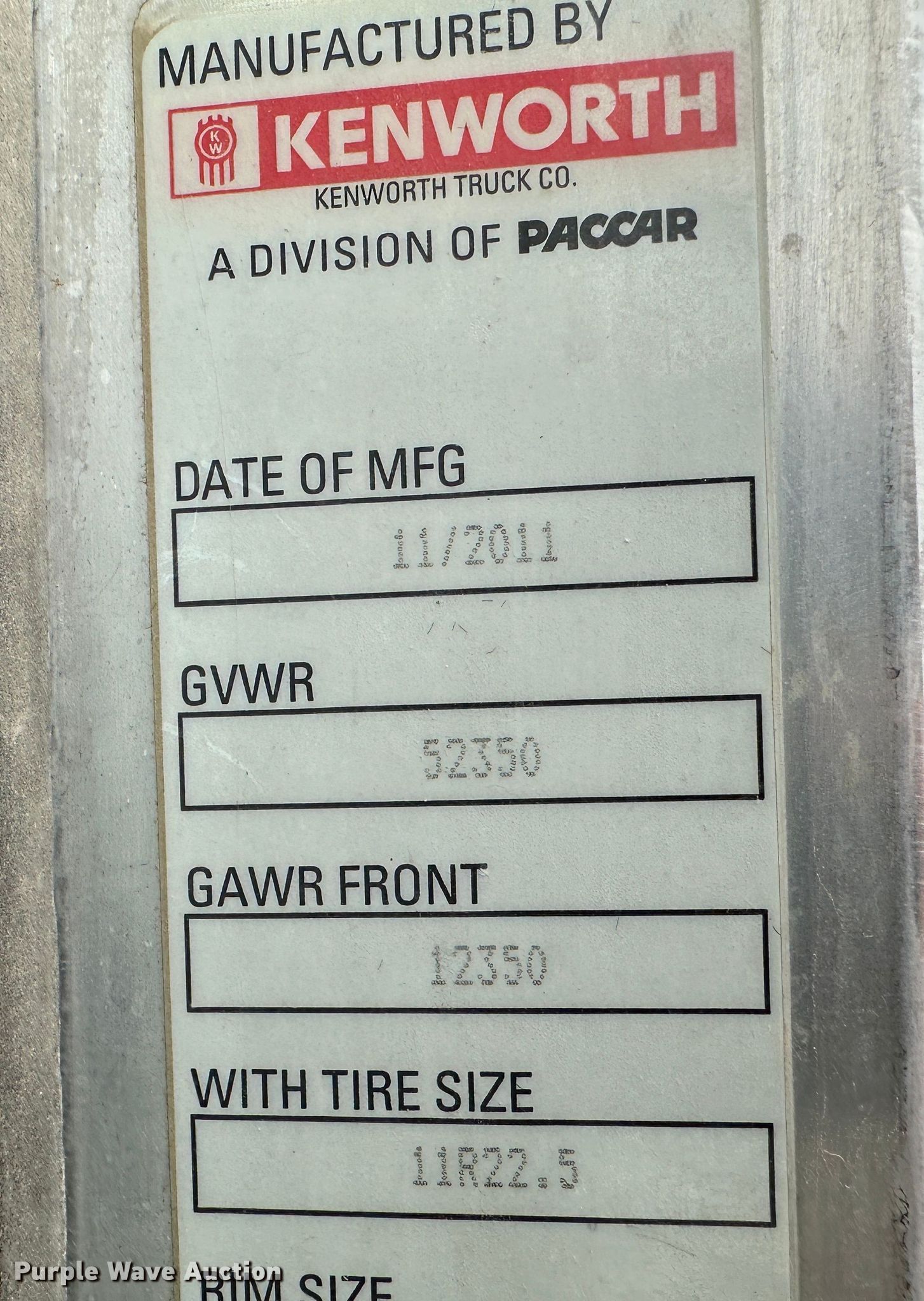 2012 Kenworth T800 semi truck. Miles: 731,245 on odometer, VIN: 1XKDD49X0CJ333296, Unit #: 11407. Engine Cummins ISX, Serial: 60812926, Displacement: 15L, Cylinders: 6, Fuel type: Diesel, Engine brake. Transmission Manual, Speed: 10. Chassis Axles: Tandem, Differential lock: Full, Suspension: Air Dump valves, Brakes: Air, PTO, GVWR: 52,350 lbs. Interior AC, Heat, Heated mirrors, Power locks, Cruise control, Air ride cab. Features Fifth wheel type: Air operated, Sliding, Fuel tank: Dual. Tires Size: 11R22.5. Notes Dead battery, Unknown operating condition. Oklahoma title. Titles will be distributed after confirmation of payment and removal. Title distribution may be delayed up to 30 days from verification of funds. Seaboard Foods. Guymon, OK 73942