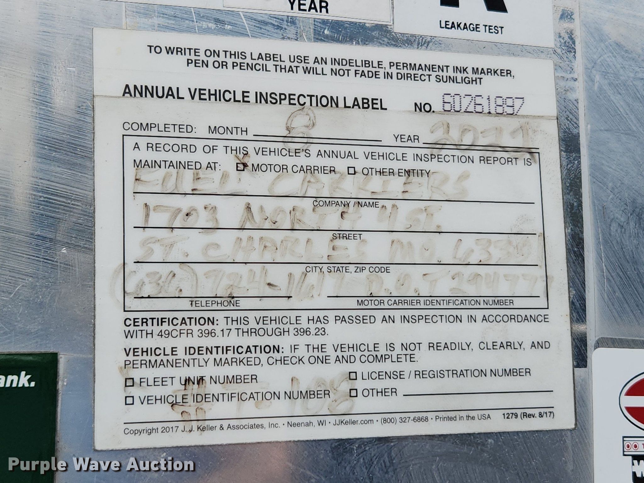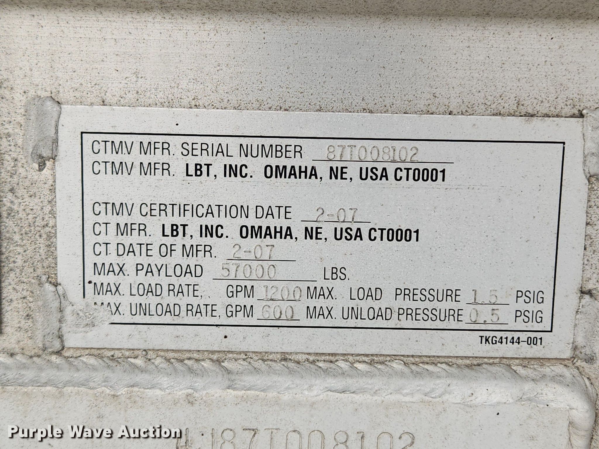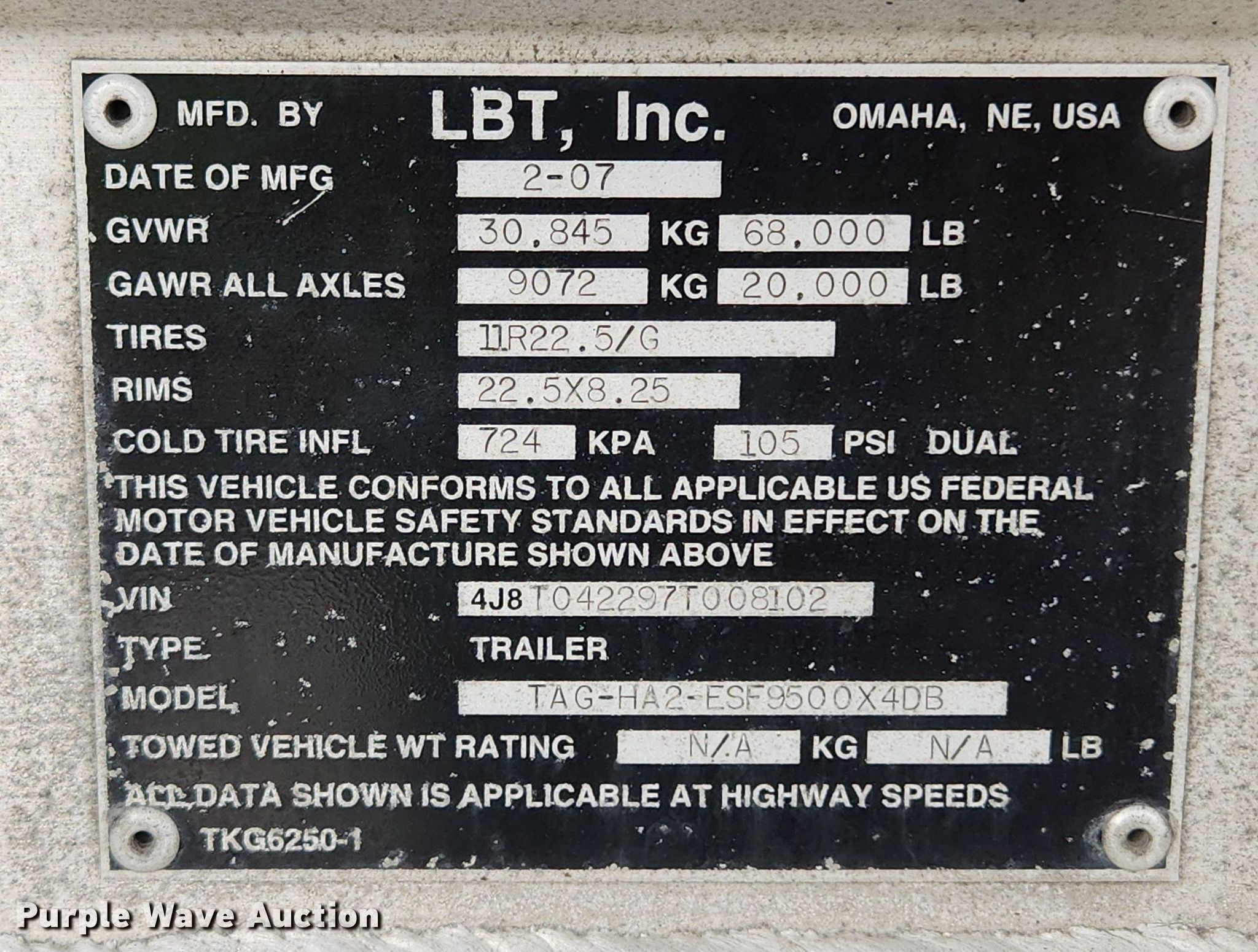 Purple Wave is selling a used Tank Trailer in Missouri. This item is a 2007 LBT TAG-HA2-ESF9500X4DB tank trailer with the following: VIN: 4J8T042297T008102