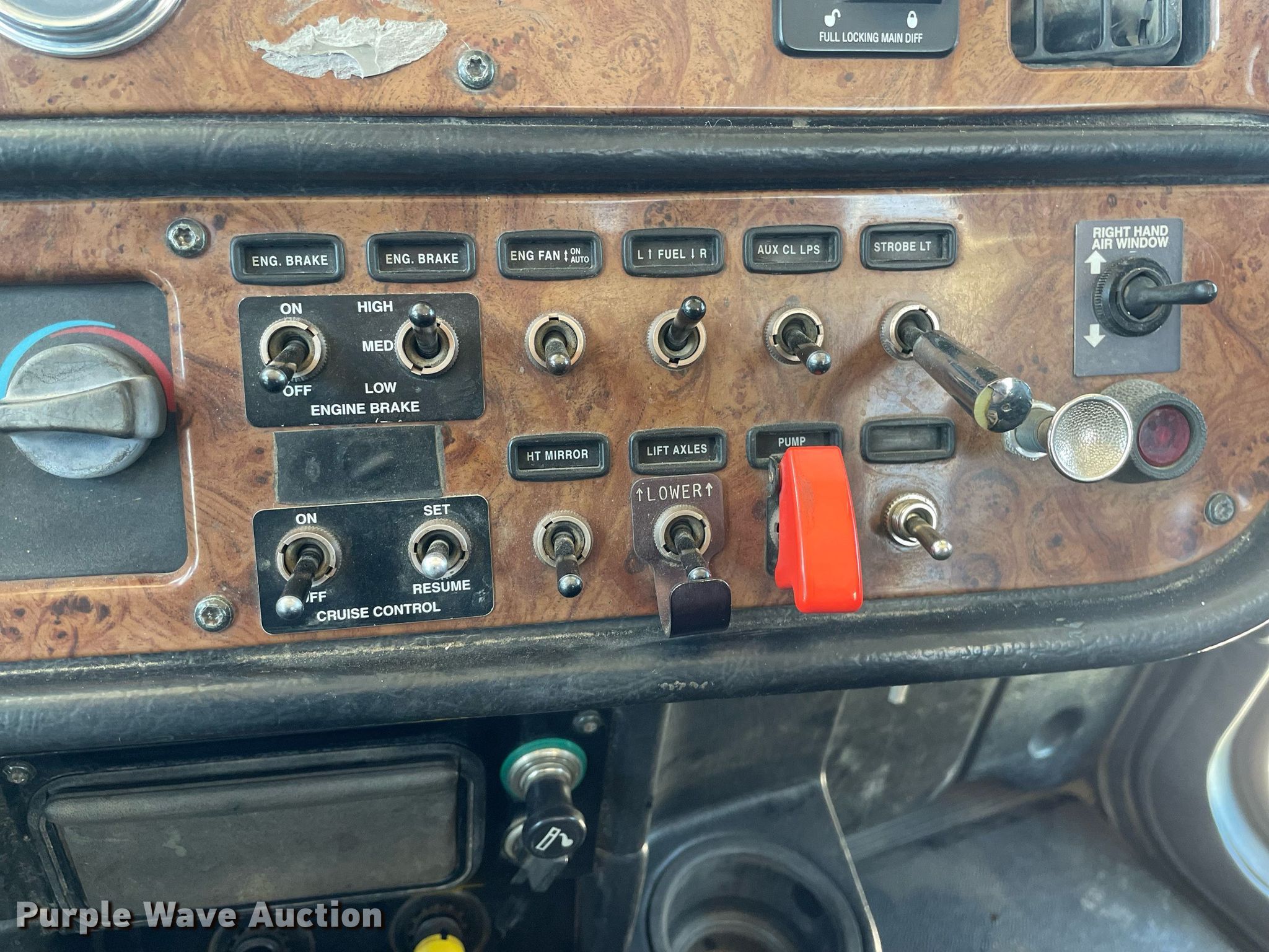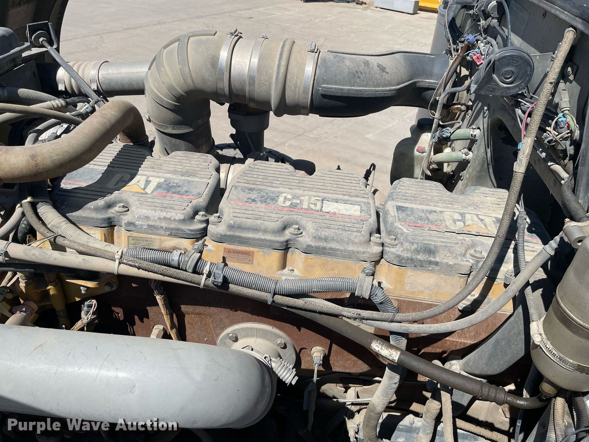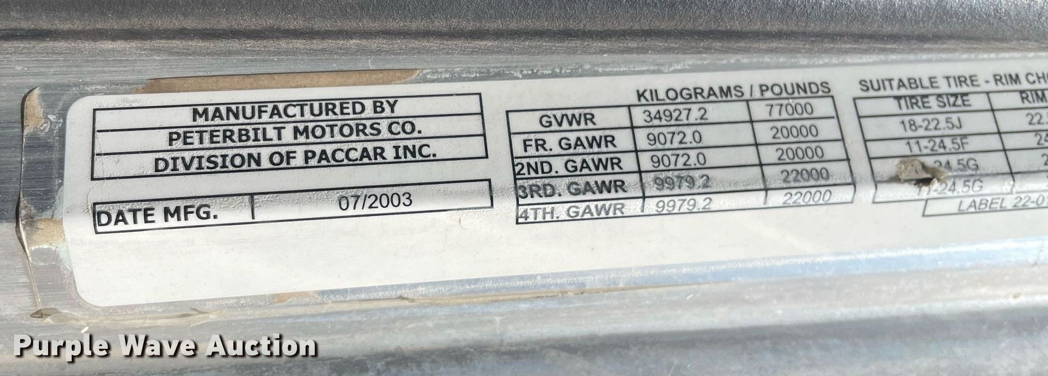 2004 Peterbilt 357 semi truck. Miles: 716,295 on odometer, VIN: 1XPAPBEX84D822043. Engine Caterpillar C15, Serial: MBN20185, Displacement: 14.6L, Cylinders: 6, Fuel type: Diesel, Engine brake. Transmission Manual, Speed: 18. Chassis Axles: Triple, Pusher axle, Differential lock: Full, Suspension: Air Dump valves, Brakes: Air, PTO, Wet kit, Truck chassis: 19' 2", GVWR: 77,000 lbs FAWR: 20,000 lbs, RAWR: 22,000 lbs, Lift axle GAWR: 20,000 lbs. Interior AC, Heat, Heated mirrors, Power passenger window , Cruise control. Features Deck plate: Aluminum, Fifth wheel type: Air operated, Sliding, Fuel tank: Dual. Tires Front: 425/65R22.5, Rear: 11R24.5, Lift axle: 255/70R22.5. Kansas title. Title distribution may be delayed up to 14 days from verification of funds. Allied Equipment. Wichita, KS 67217