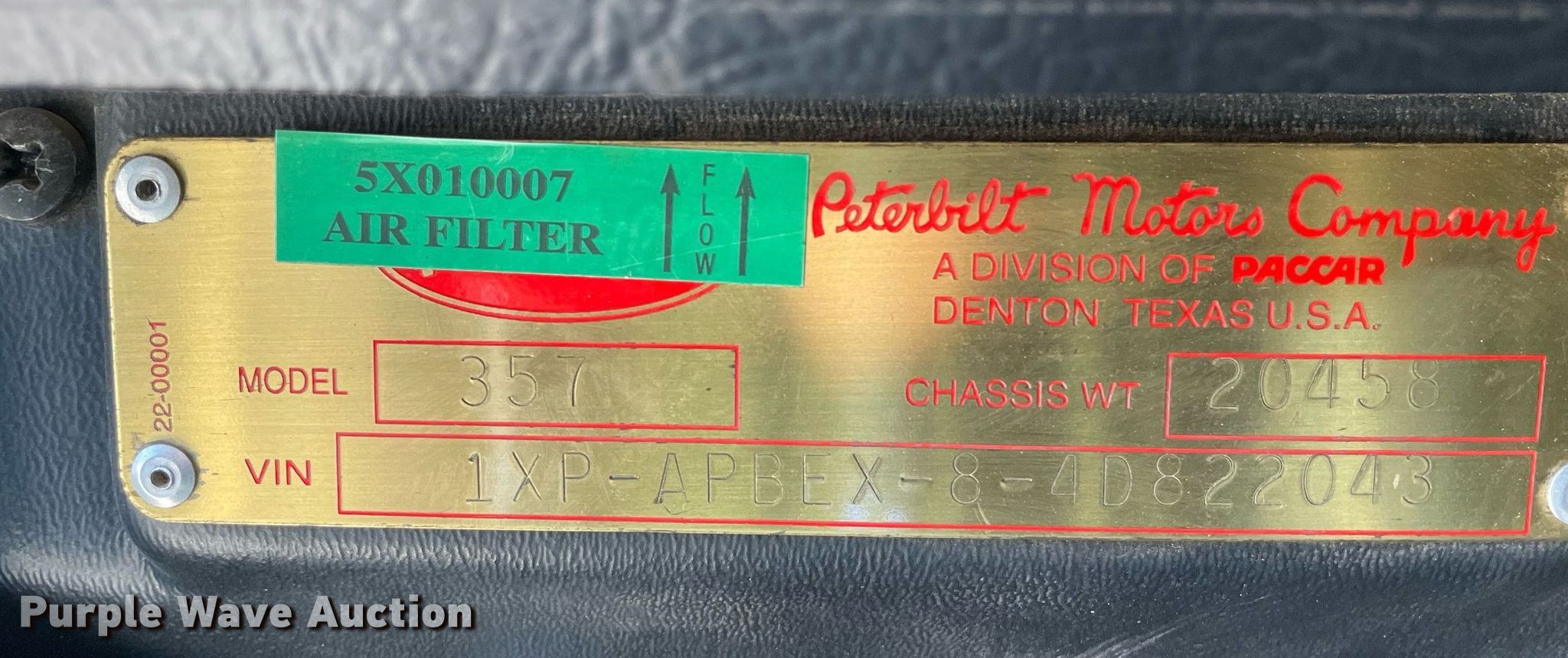 Purple Wave is selling a used Truck Tractor in Kansas. This item is a 2004 Peterbilt 357 semi truck with the following: Miles: 716,295 on odometer, VIN: 1XPAPBEX84D822043