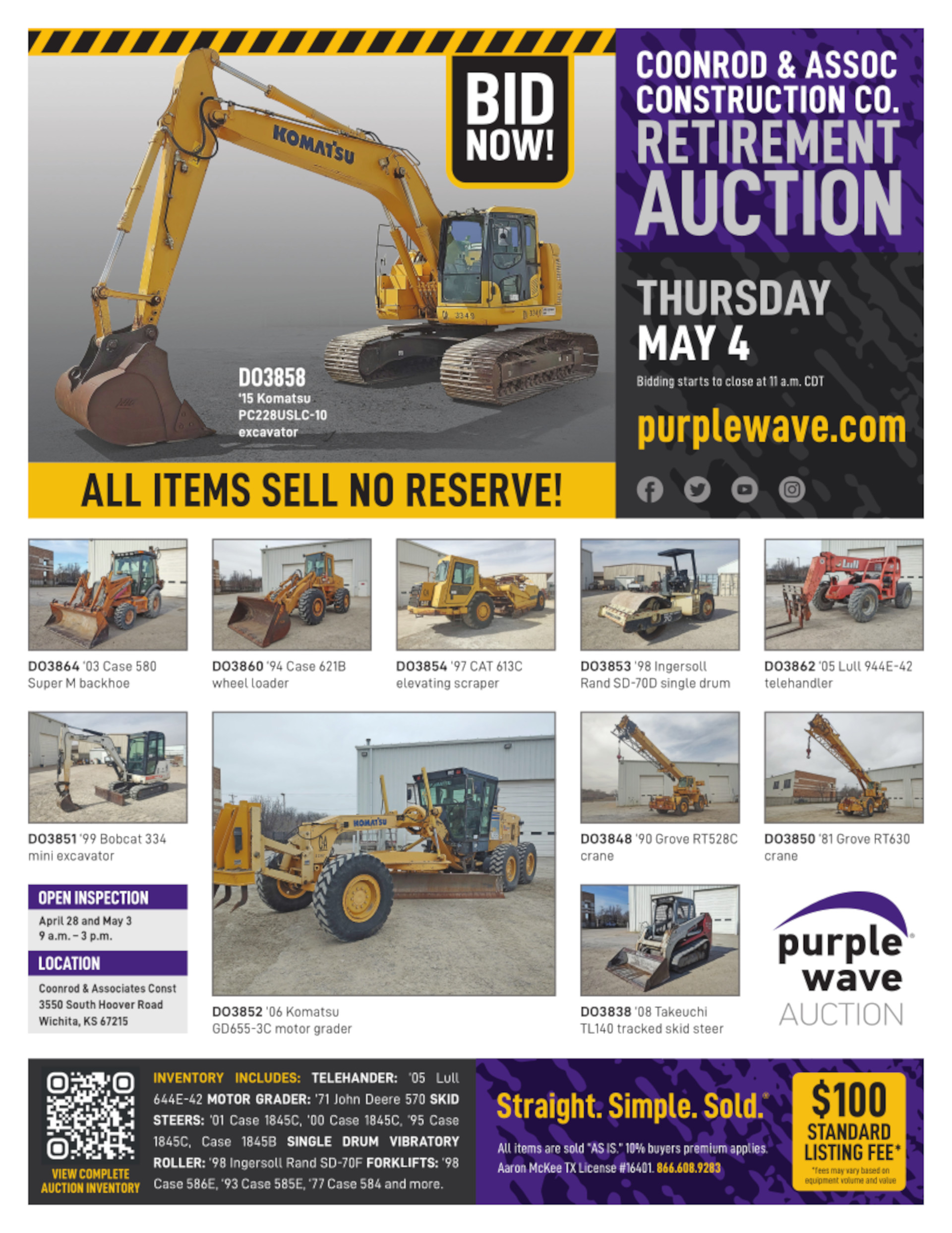Terms, conditions, explanations and information in addition to those listed on this page are found in the Terms and Conditions section of this site and on the individual listing pages for all assets included in this auction. All terms, conditions, explanations and information are intended to be supplemental and complementary to each other. They are incorporated by reference into this page, and collectively they govern this auction. In the event of a conflict or inconsistency among terms, conditions, explanations or information in the Terms and Conditions section, the individual listing pages for assets and/or this page, the individual listing pages shall control this page and the Terms and Conditions section, and this page shall control the Terms and Conditions section. By registering to bid live and/or on the internet, you agree to abide by all terms and conditions and you acknowledge receipt of all explanations and information made available by Purple Wave.