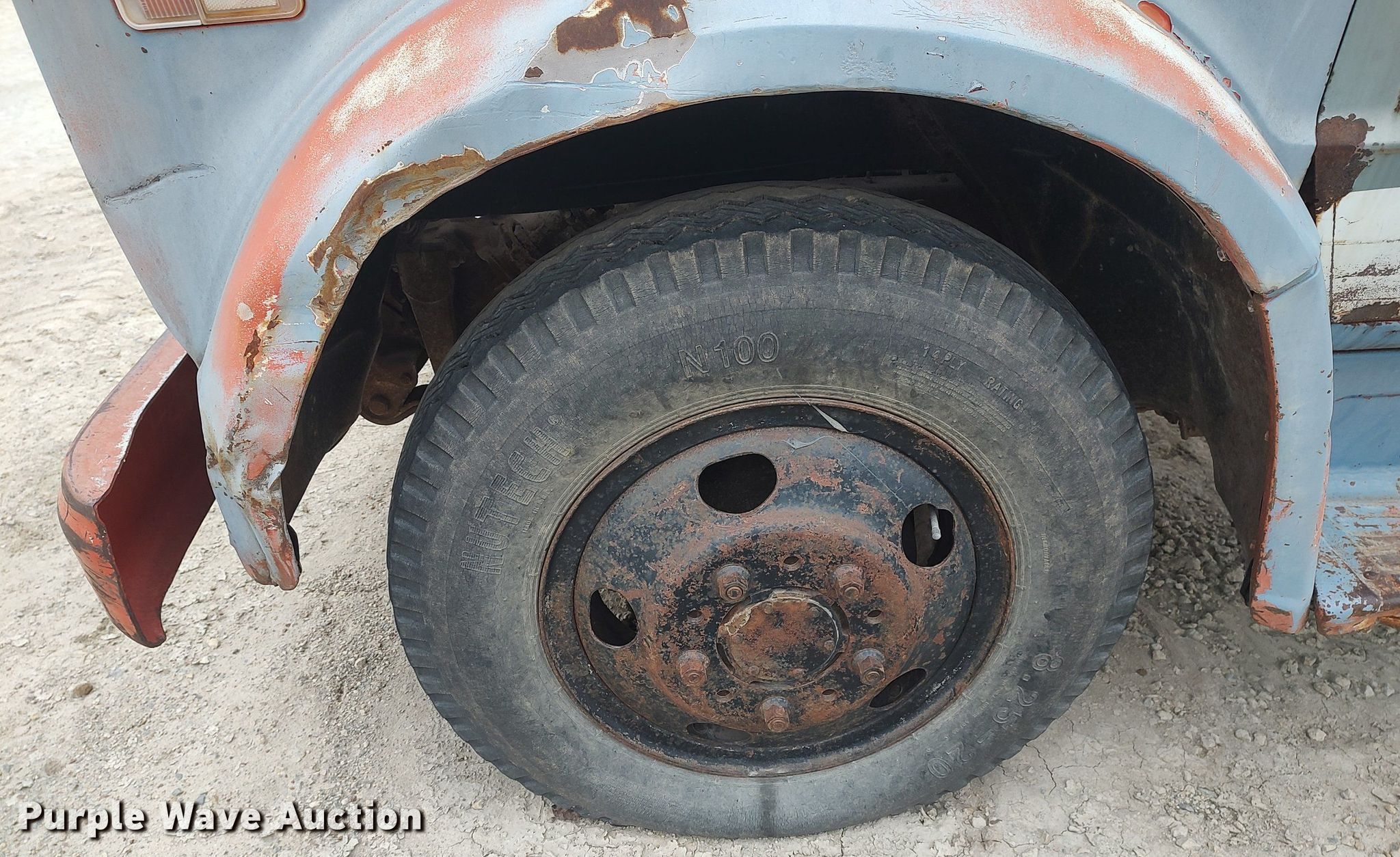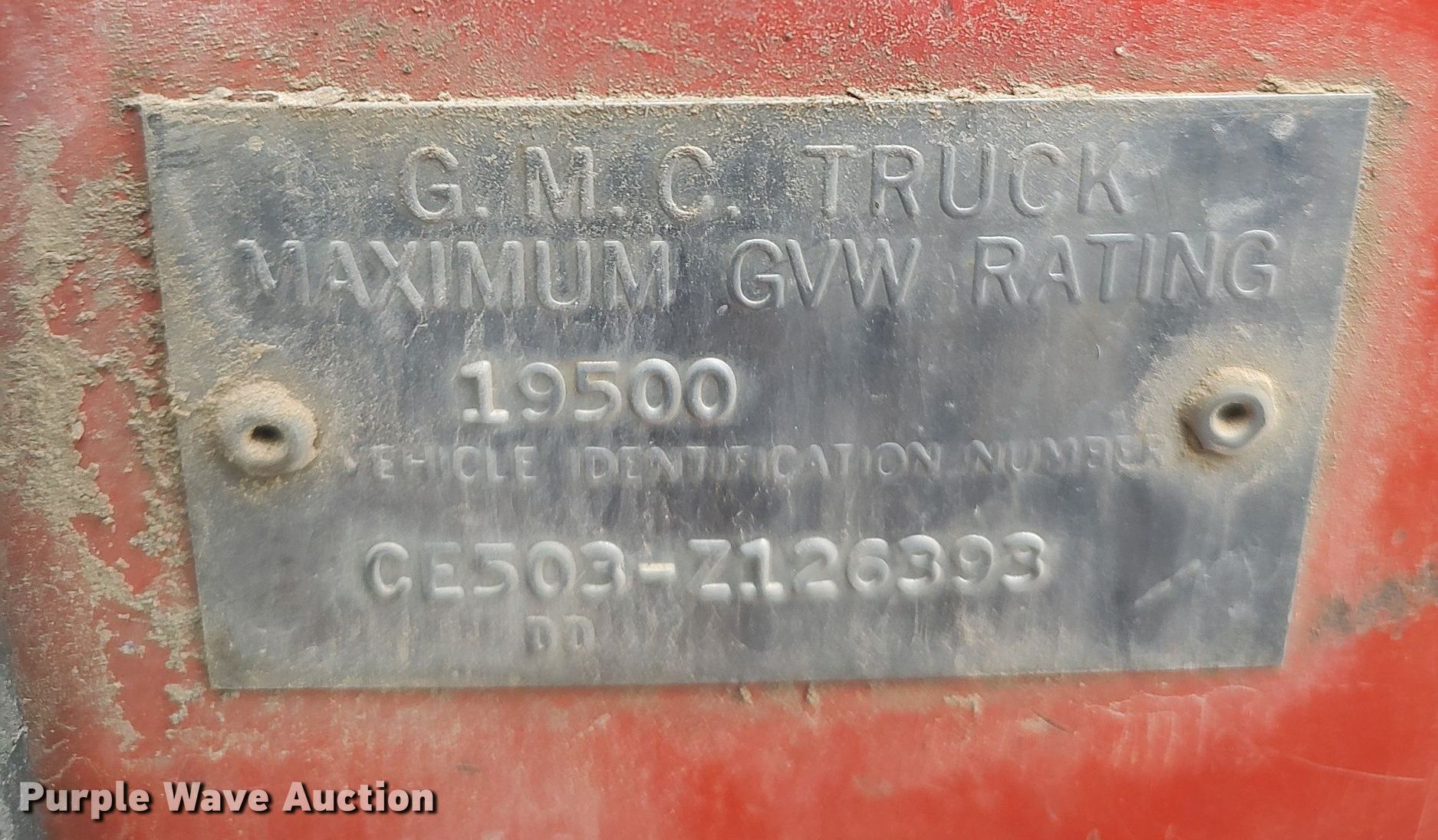 1970 GMC 5500 water truck. Miles: 13,607 on odometer Actual mileage unknown, VIN: CE503Z126393. Engine Cylinders: 8, Fuel type: Gas. Transmission Manual, Speed: 4, plus 2. Chassis Axles: Single, Suspension: Spring, Brakes: Hydraulic, PTO. Features Bed / tank Capacity: 1,025 gallons, 12' 6" L x 89" W, Spray bar: Rear, Side discharge, Top fill, Rear outlet: 2"". Tires Size: 8.25-20. Kansas title. Mileage has not been verified. Exempt will be written in the odometer disclosure on the title. Title distribution may be delayed up to 14 days from verification of funds. Coonrod & Associates Construction Co. Retirement. 3550 South Hoover Road. Wichita, KS 67215