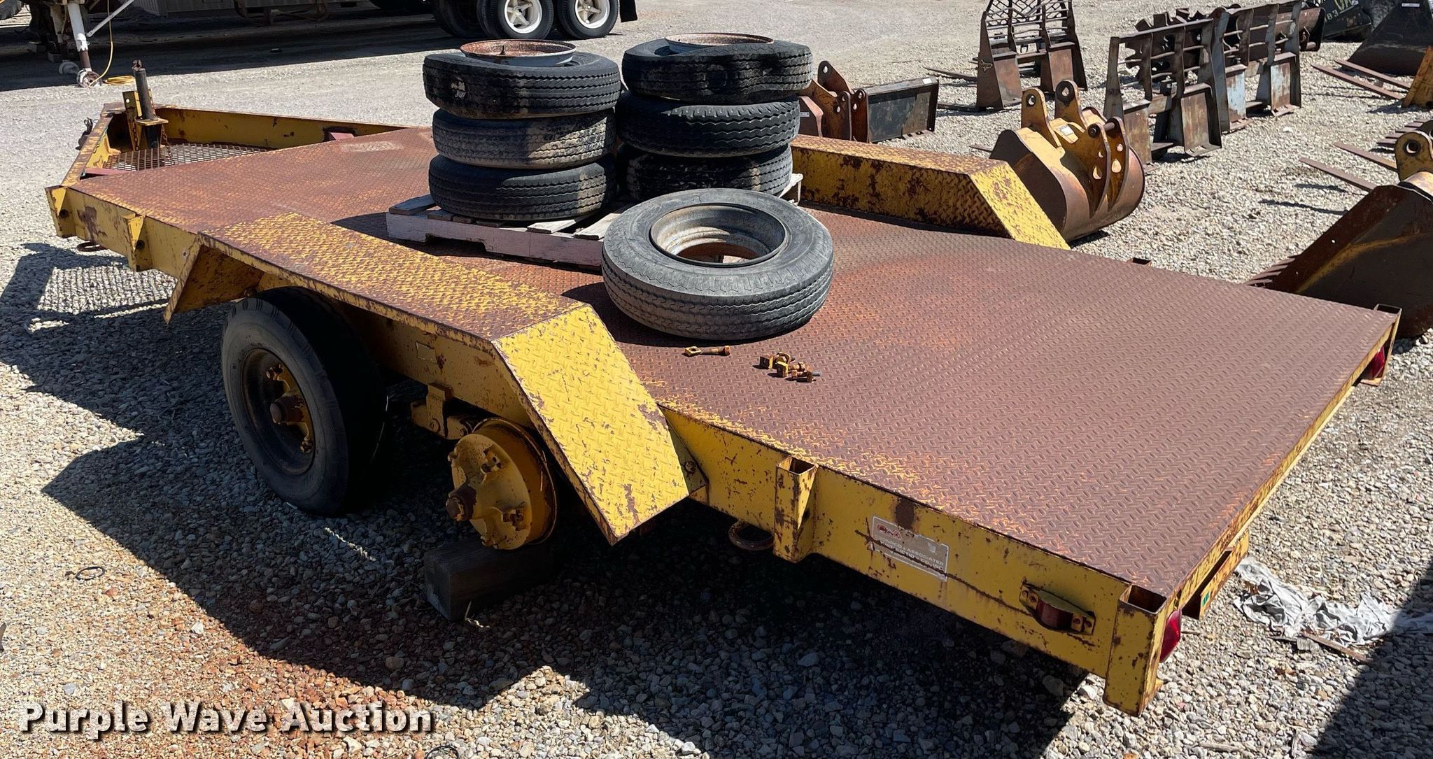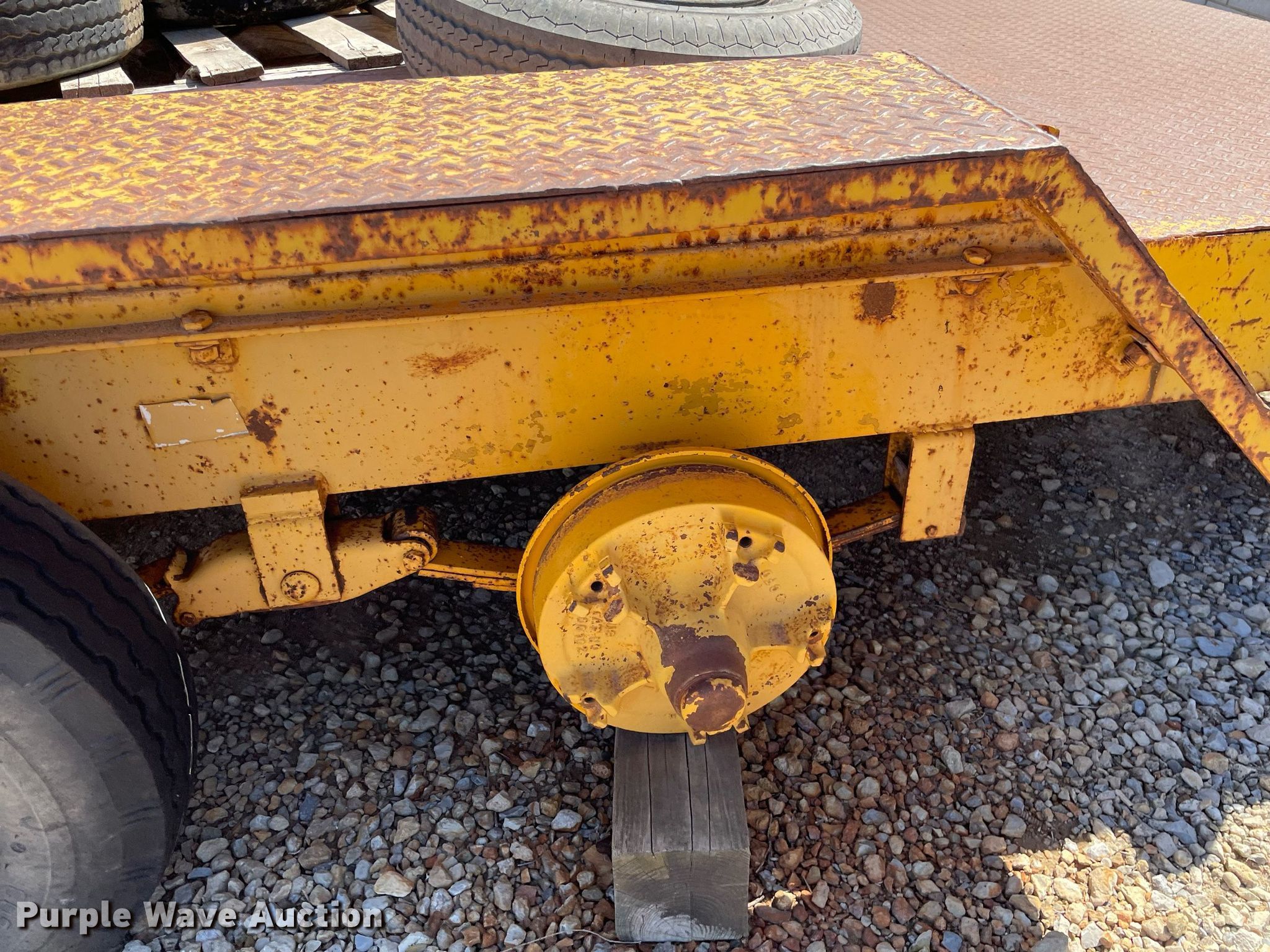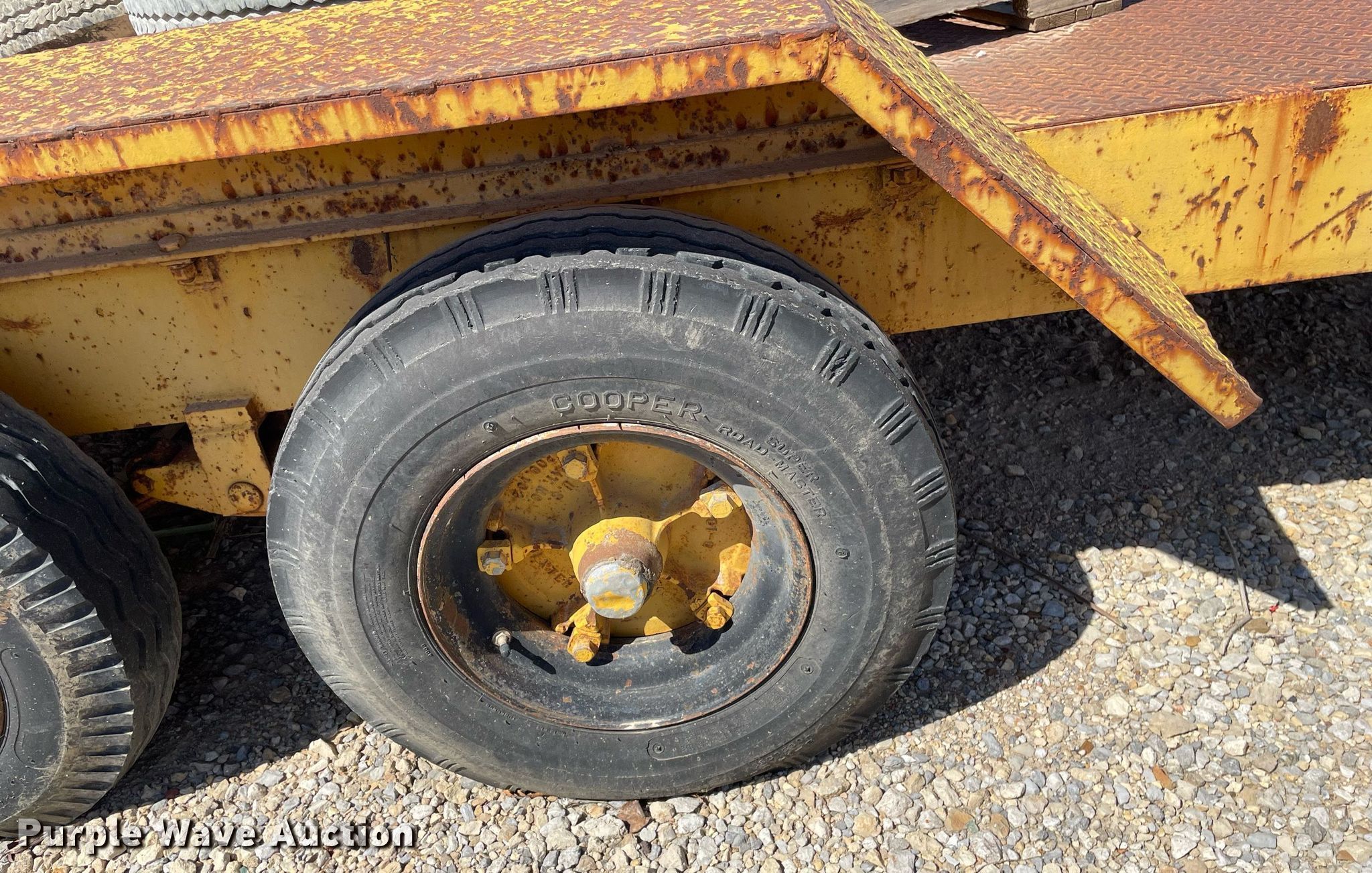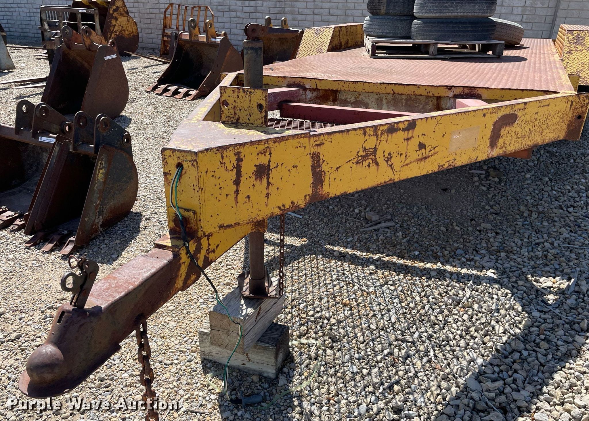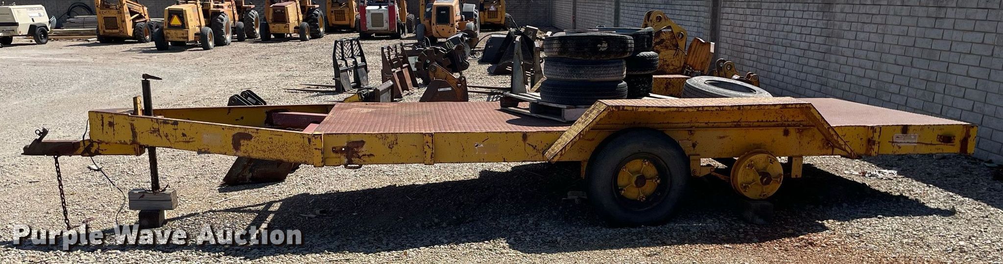 1972 Morgen equipment trailer. VIN: 2628. Dimensions Overall: 22' L x 96" W, Deck: 15' L x 72" W. Features Deck type: Steel. Chassis Ball hitch: 2 5/16", Suspension: Spring, Axles: Tandem. Tires Steel wheels, Size: 7-14.5. Notes No brakes, Wheel missing, (7) additional 8-14.5 tires and wheels. Kansas title. Title distribution may be delayed up to 14 days from verification of funds. Coonrod & Associates Construction Co. Retirement. 3550 South Hoover Road. Wichita, KS 67215