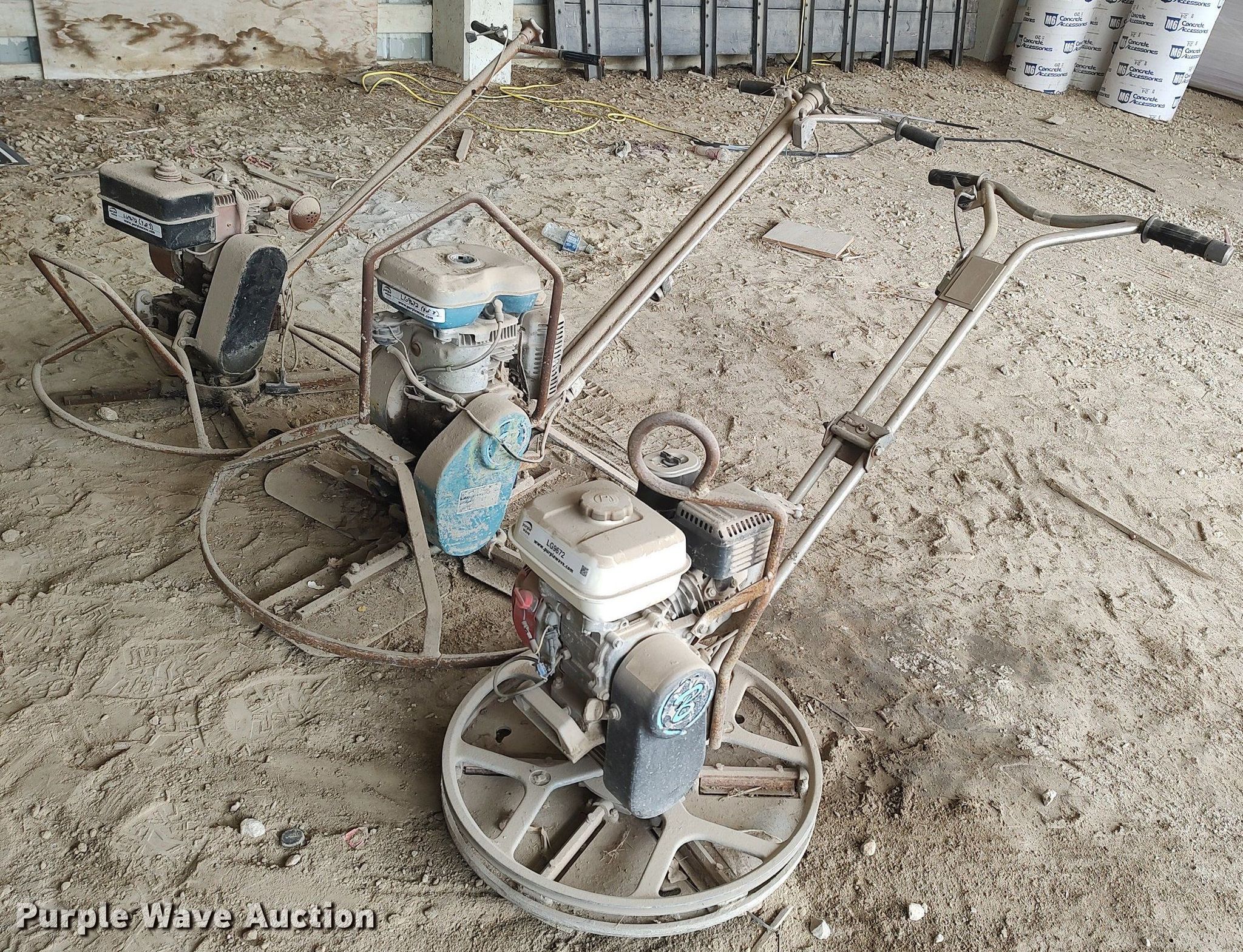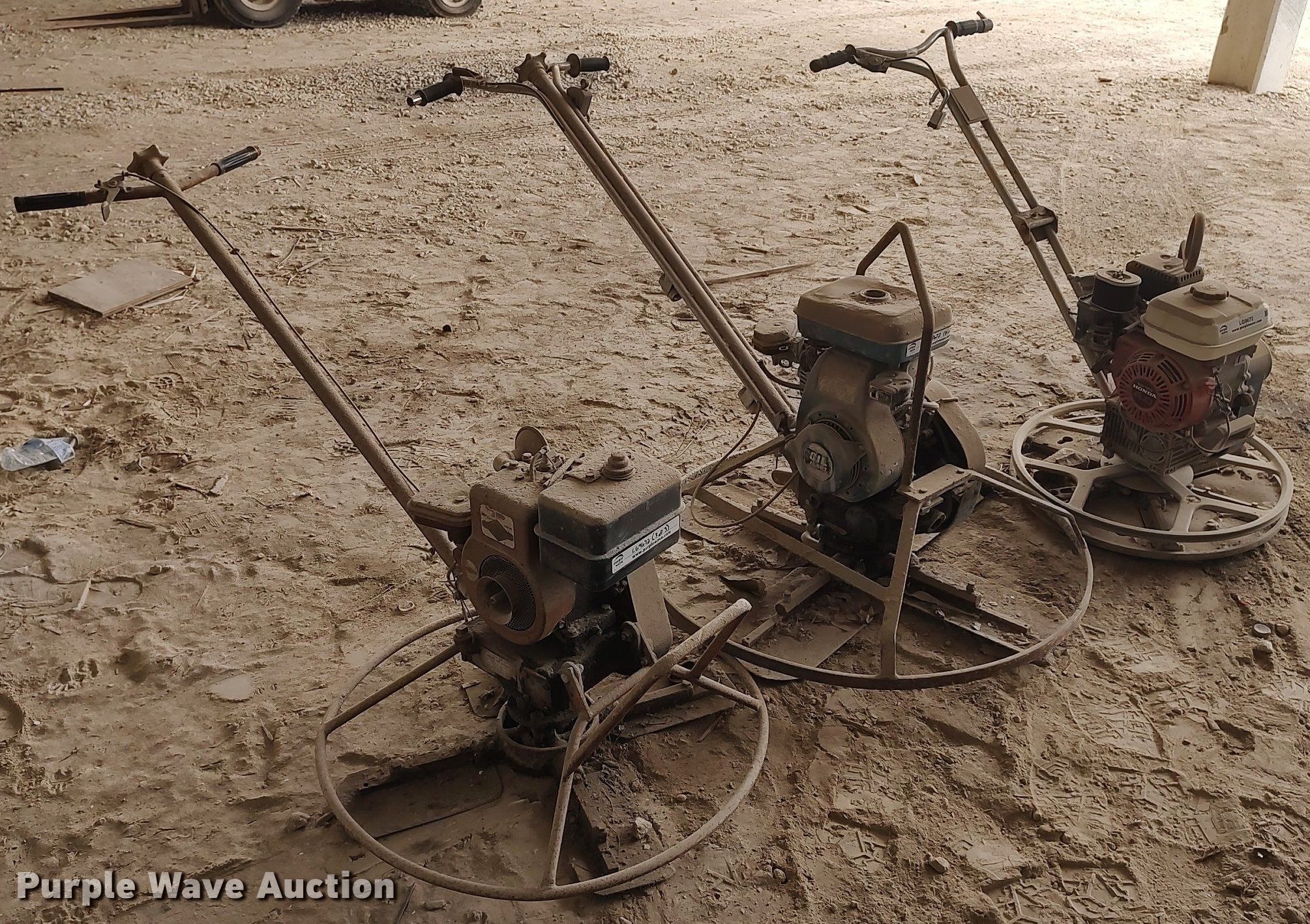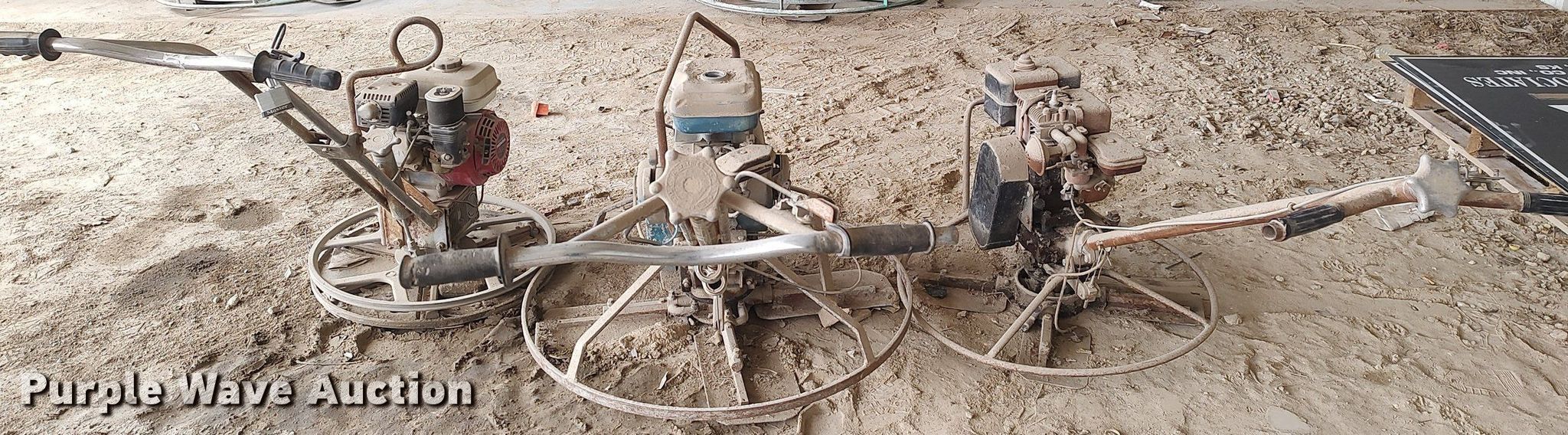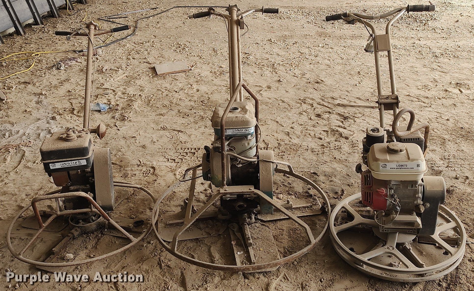 Purple Wave is selling a used Concrete Equip. or Acces. in Kansas. This item is a (3) power trowels with the following: Width: 36", Honda G230 5HP gas engine, Width: 28", Briggs & Stratton 3HP gas engine, Width: 24", Honda GX120 4HP gas engine