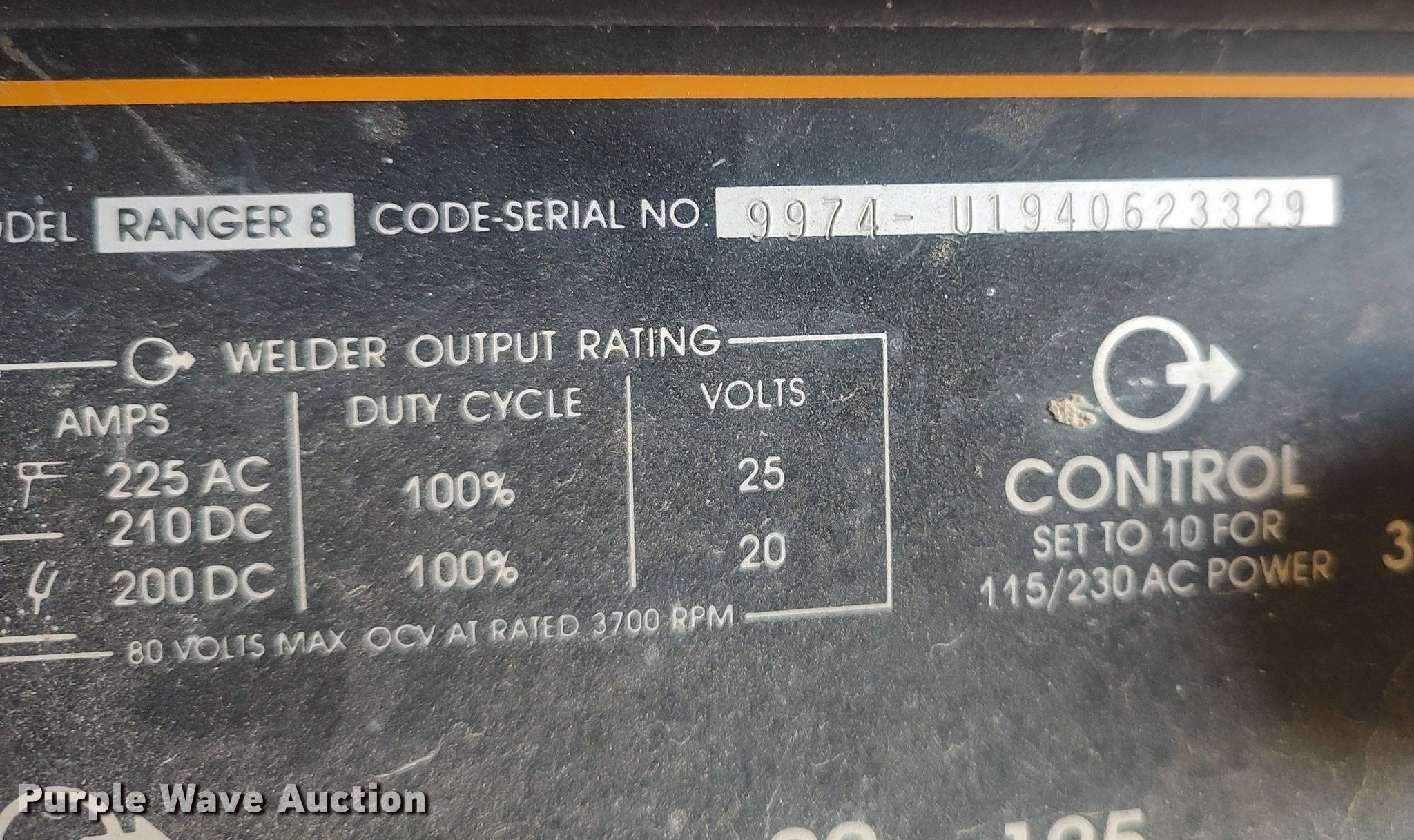 Purple Wave is selling a used Welder (Manual) in Kansas. This item is a Lincoln Ranger 8 welder/generator with the following: Serial: 9974-U1940623329