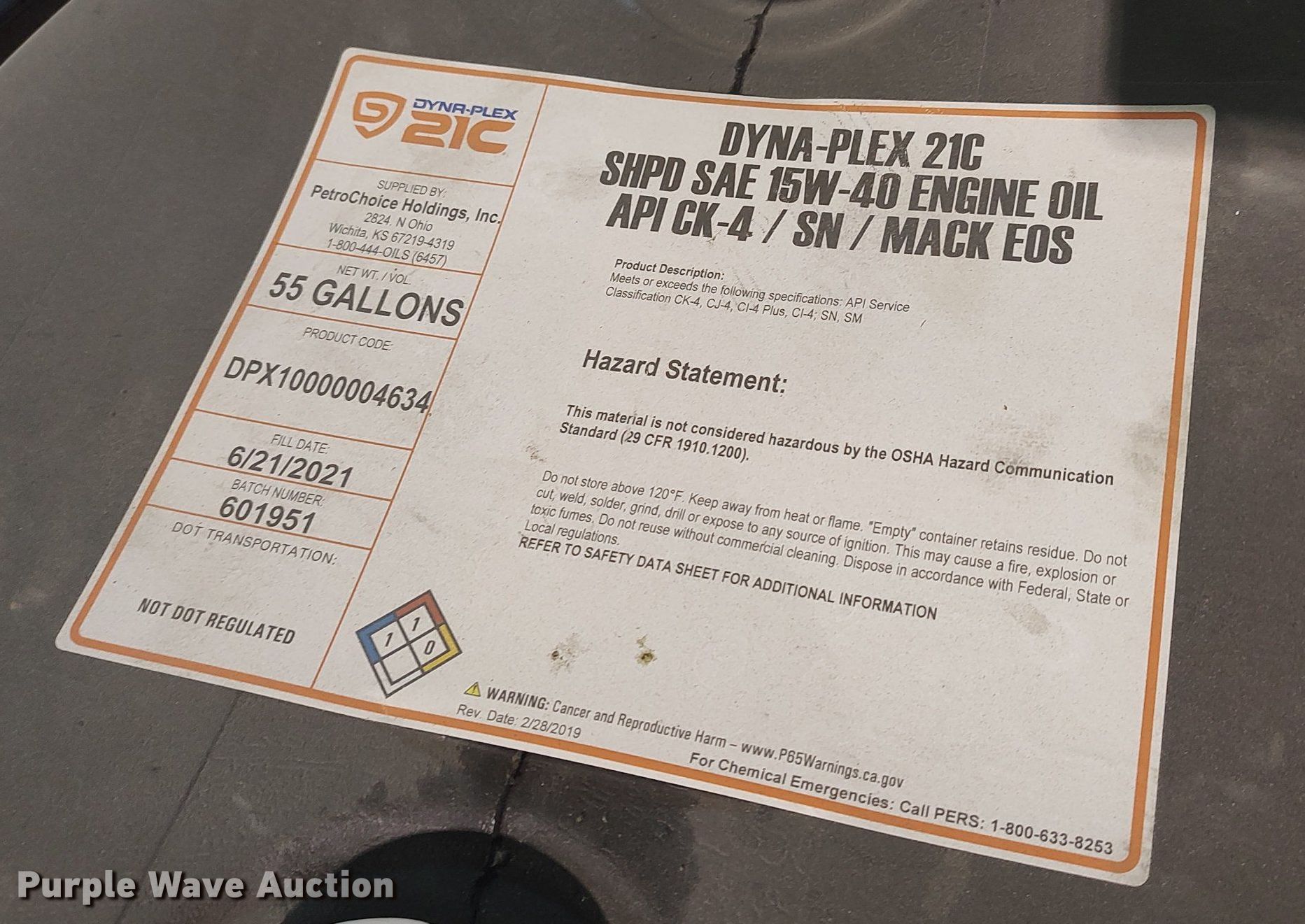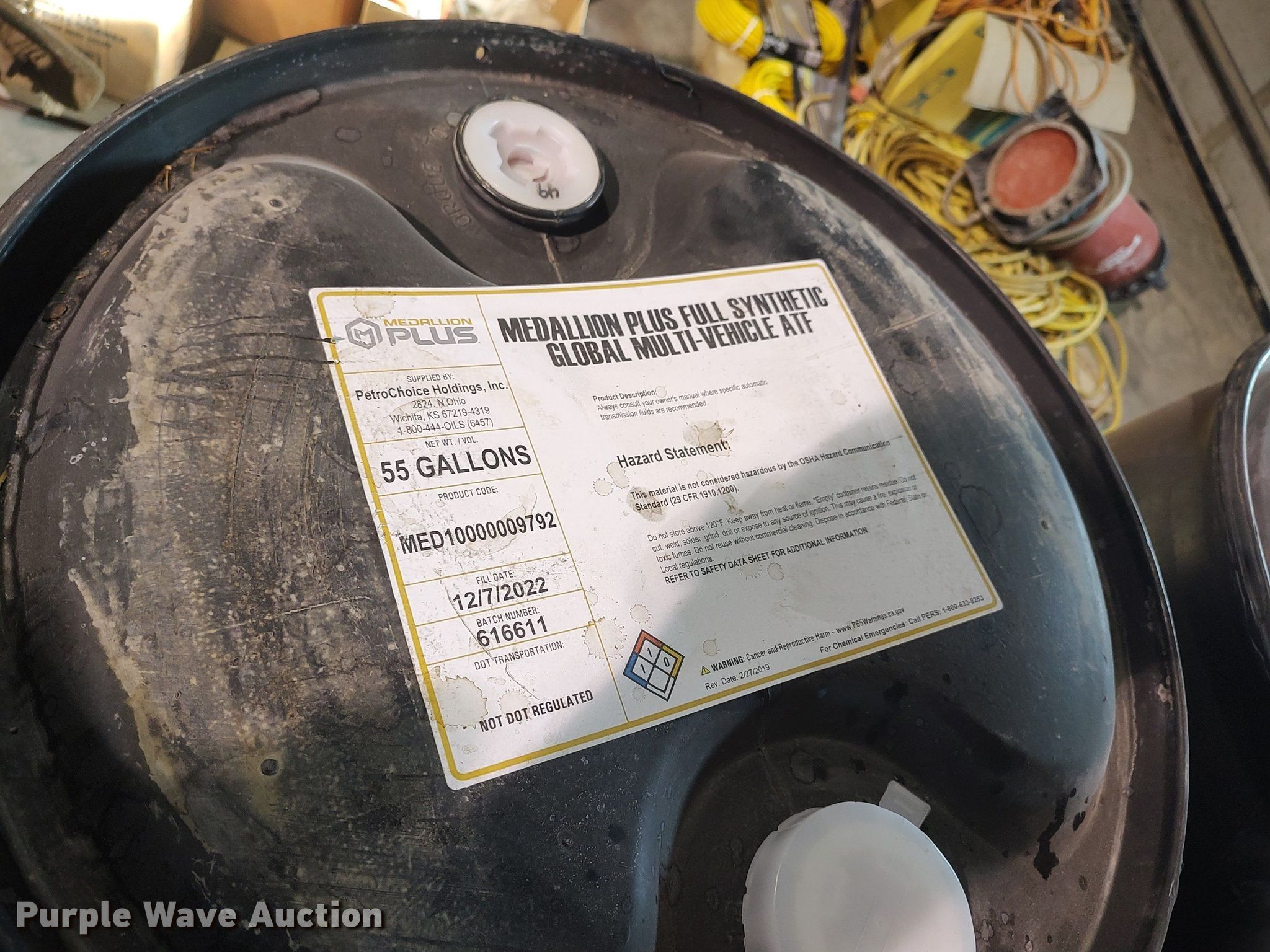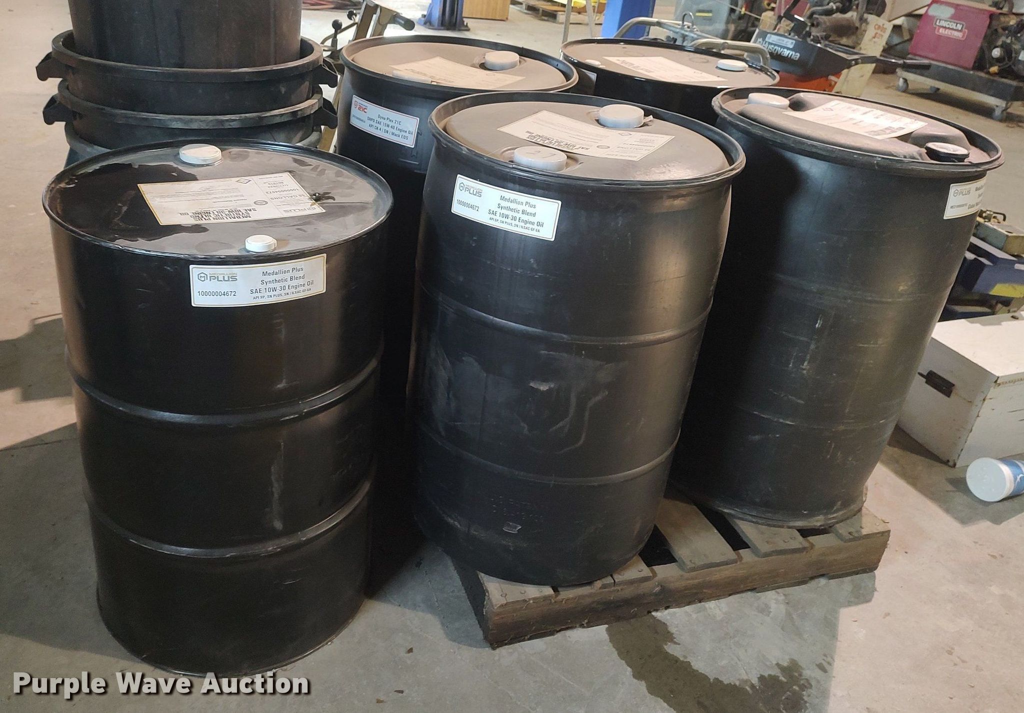 Purple Wave is selling a used Fuel and Lube in Kansas. This item is a (5) 55 gallon drums of lube with the following: (2) Dyna Plex 21C 15W-40 engine oil, Medallion Plus full synthetic automatic transmission fluid, (2) Medallion Plus 10W-30 engine oil