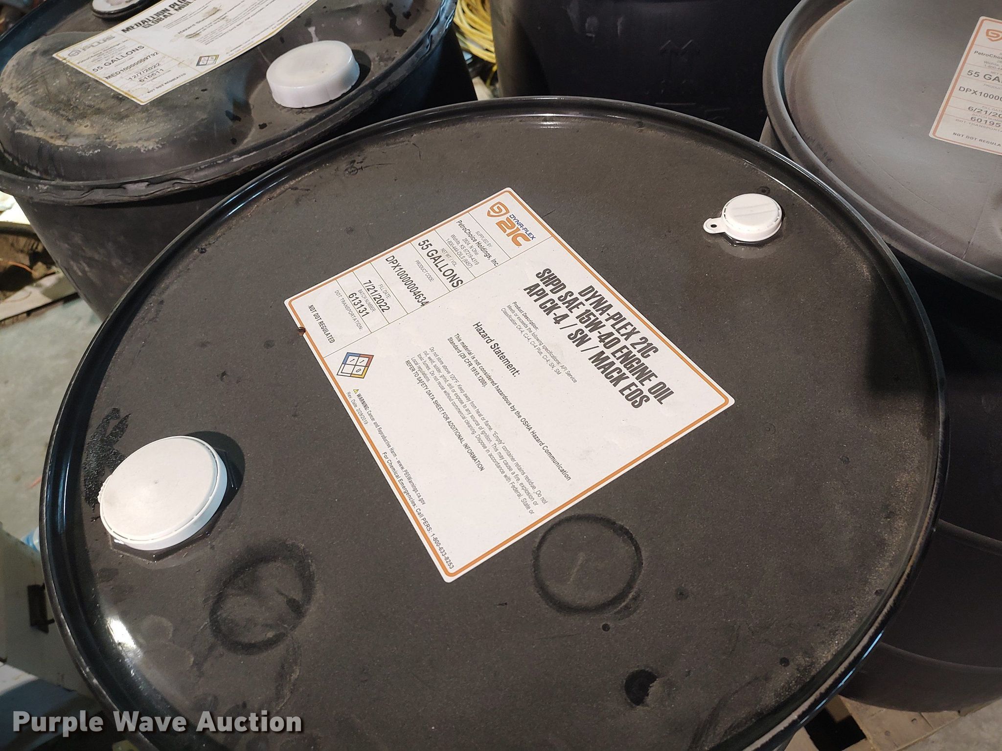 (5) 55 gallon drums of lube. (2) Dyna Plex 21C 15W-40 engine oil, Medallion Plus full synthetic automatic transmission fluid, (2) Medallion Plus 10W-30 engine oil. Coonrod & Associates Construction Co. Retirement. 3550 South Hoover Road. Wichita, KS 67215