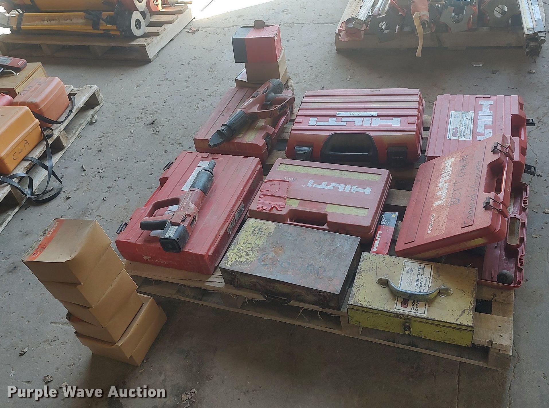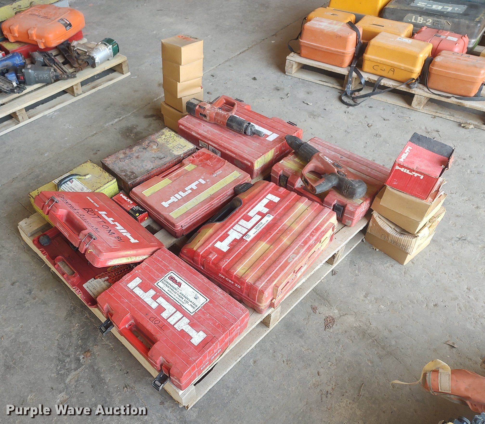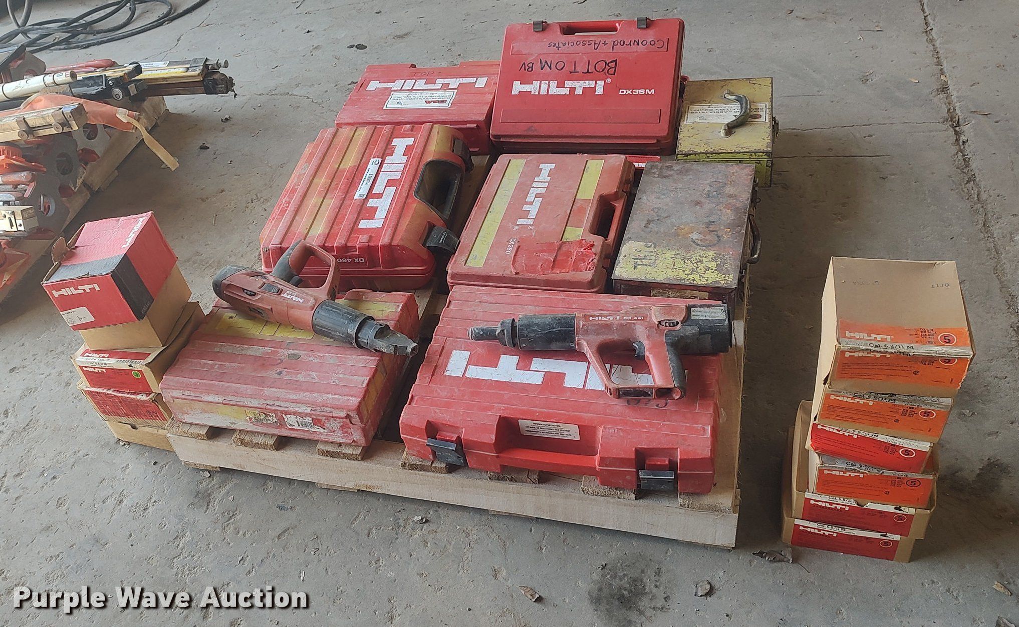 Purple Wave is selling a used Tools in Kansas. This item is a (9) Hilti powder nail guns with the following: (11) boxes of nail blanks