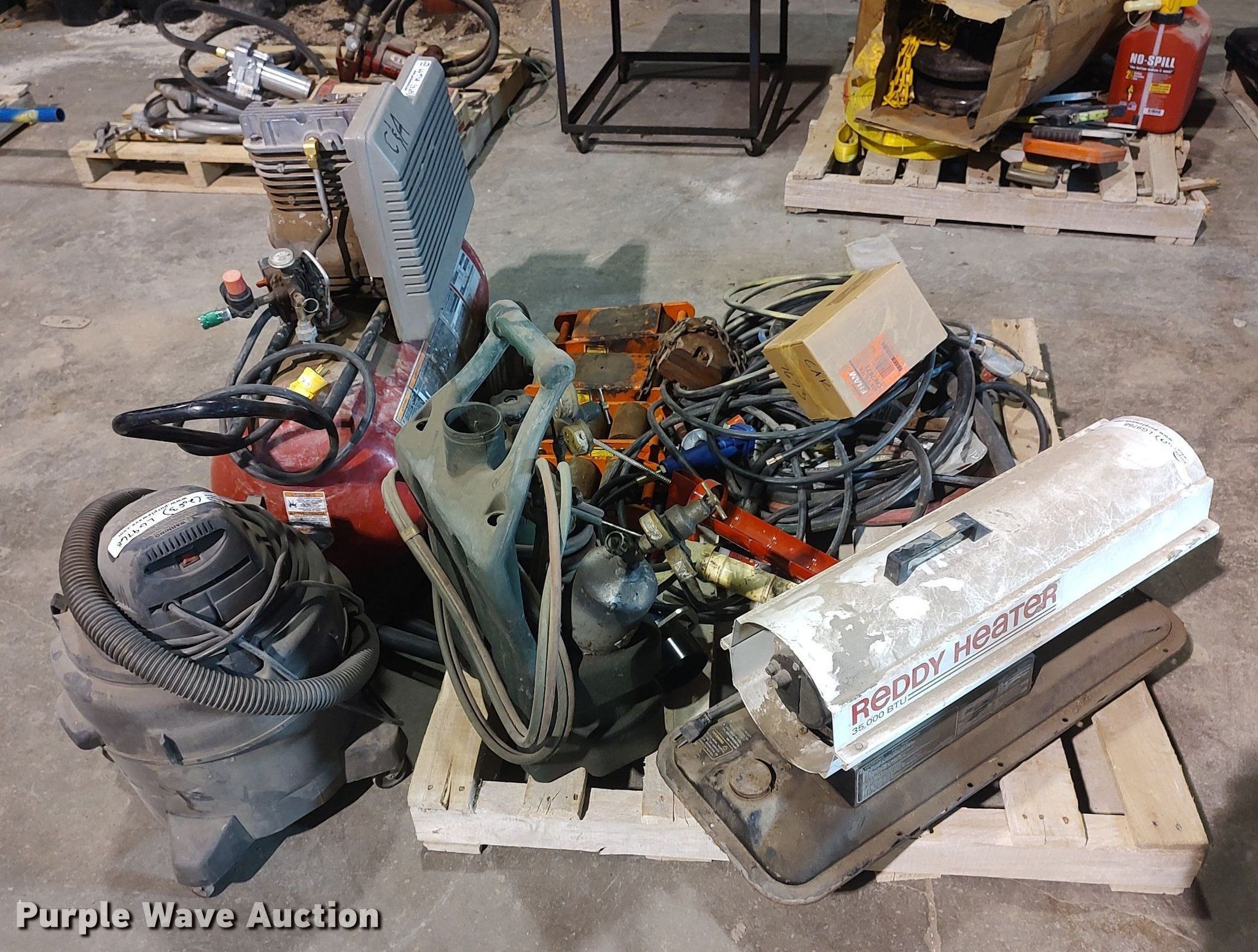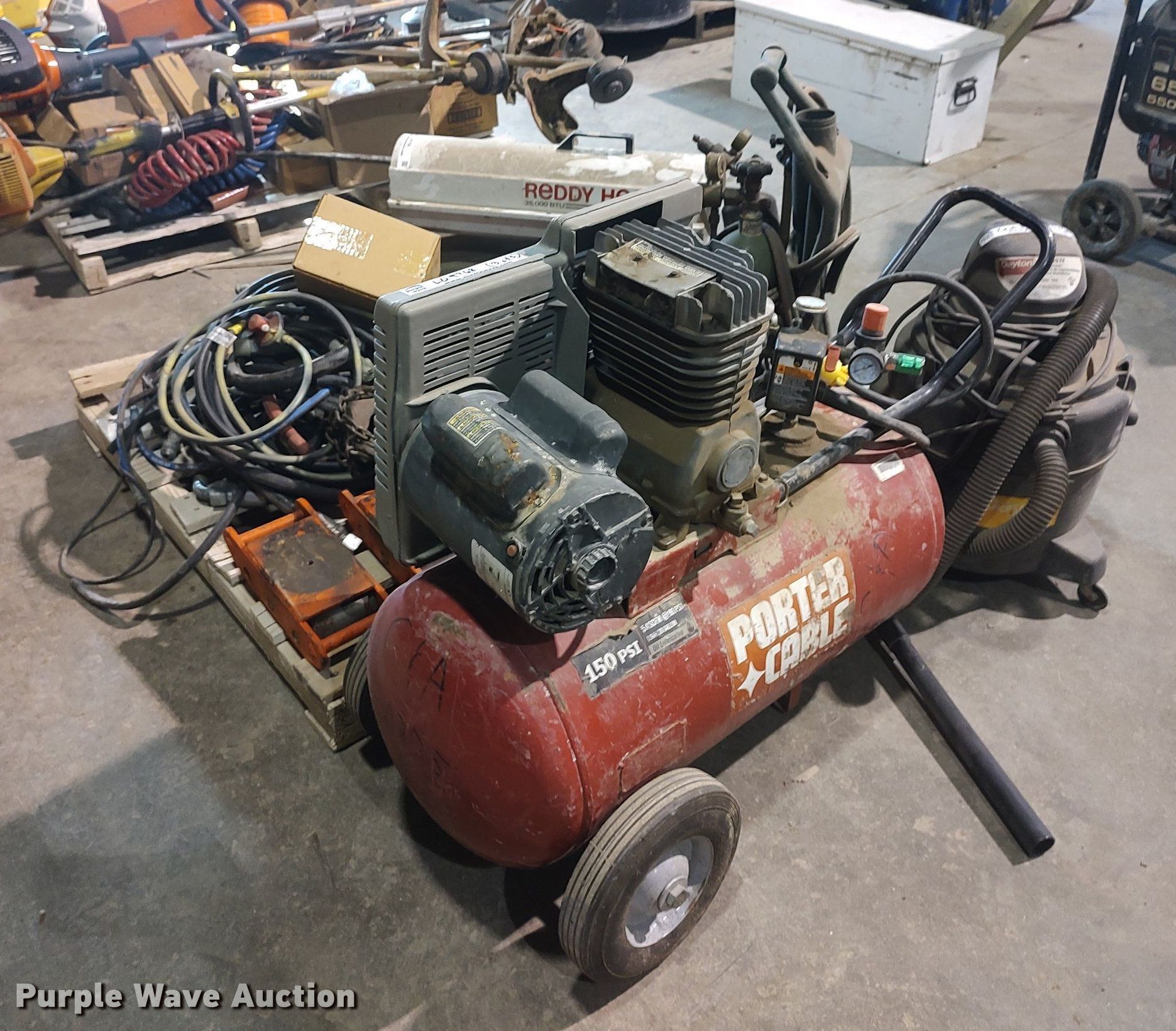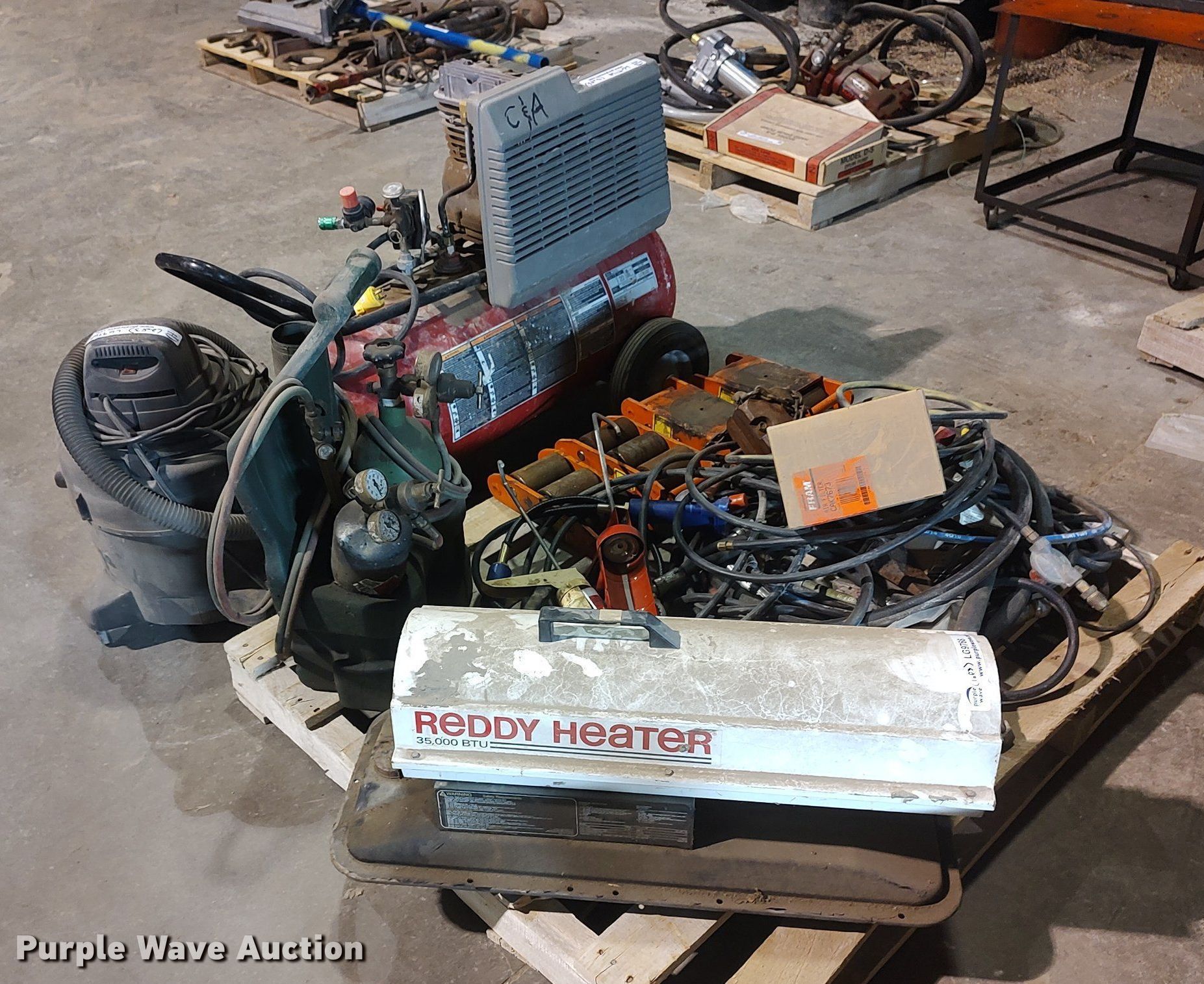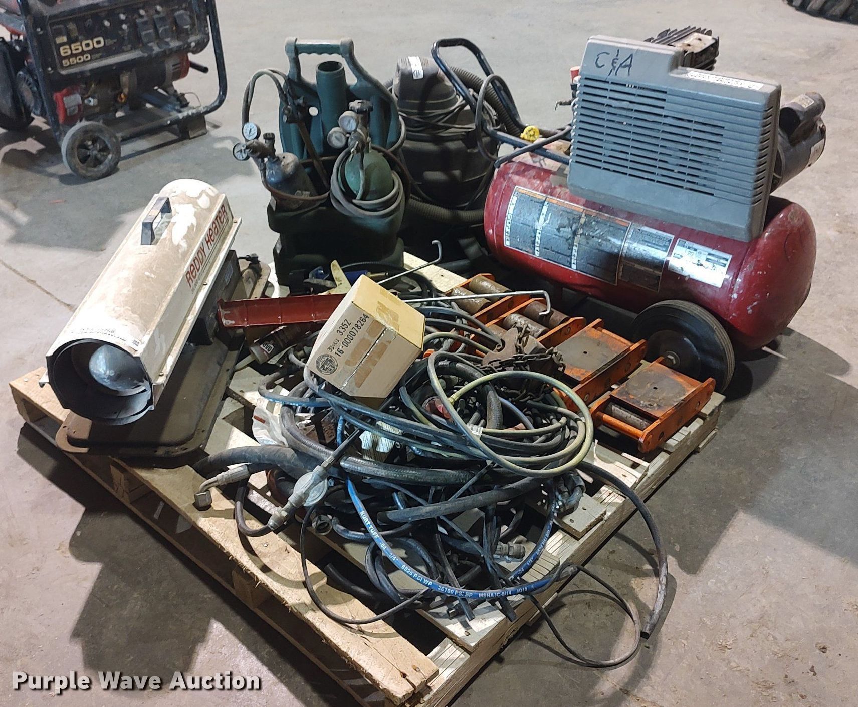 Purple Wave is selling a used Tools in Kansas. This item is a Tools with the following: Porter-Cable air compressor, Reddi 35000 heater, Acetylene bottle, Torch hoses, Dayton wet/dry vacuum, Caulking guns, Material rollers