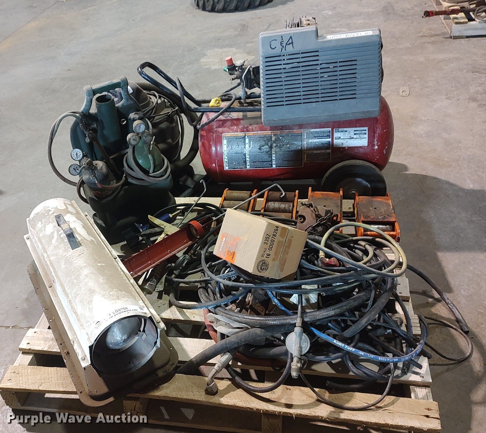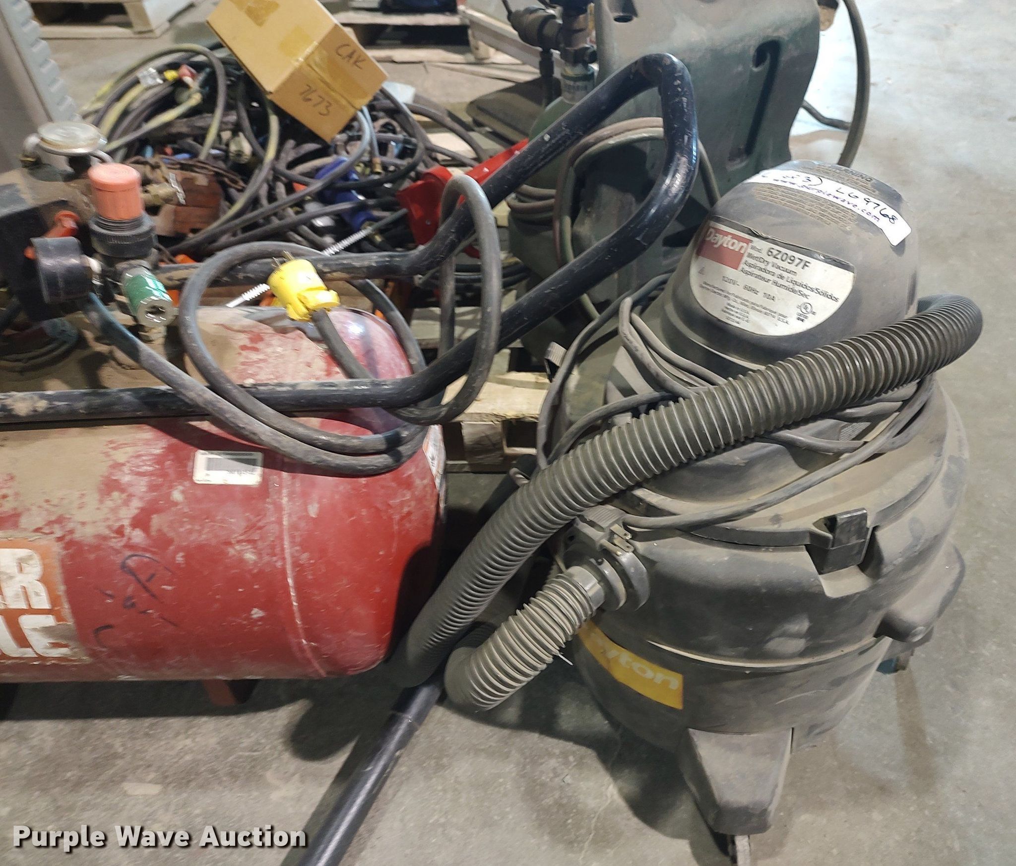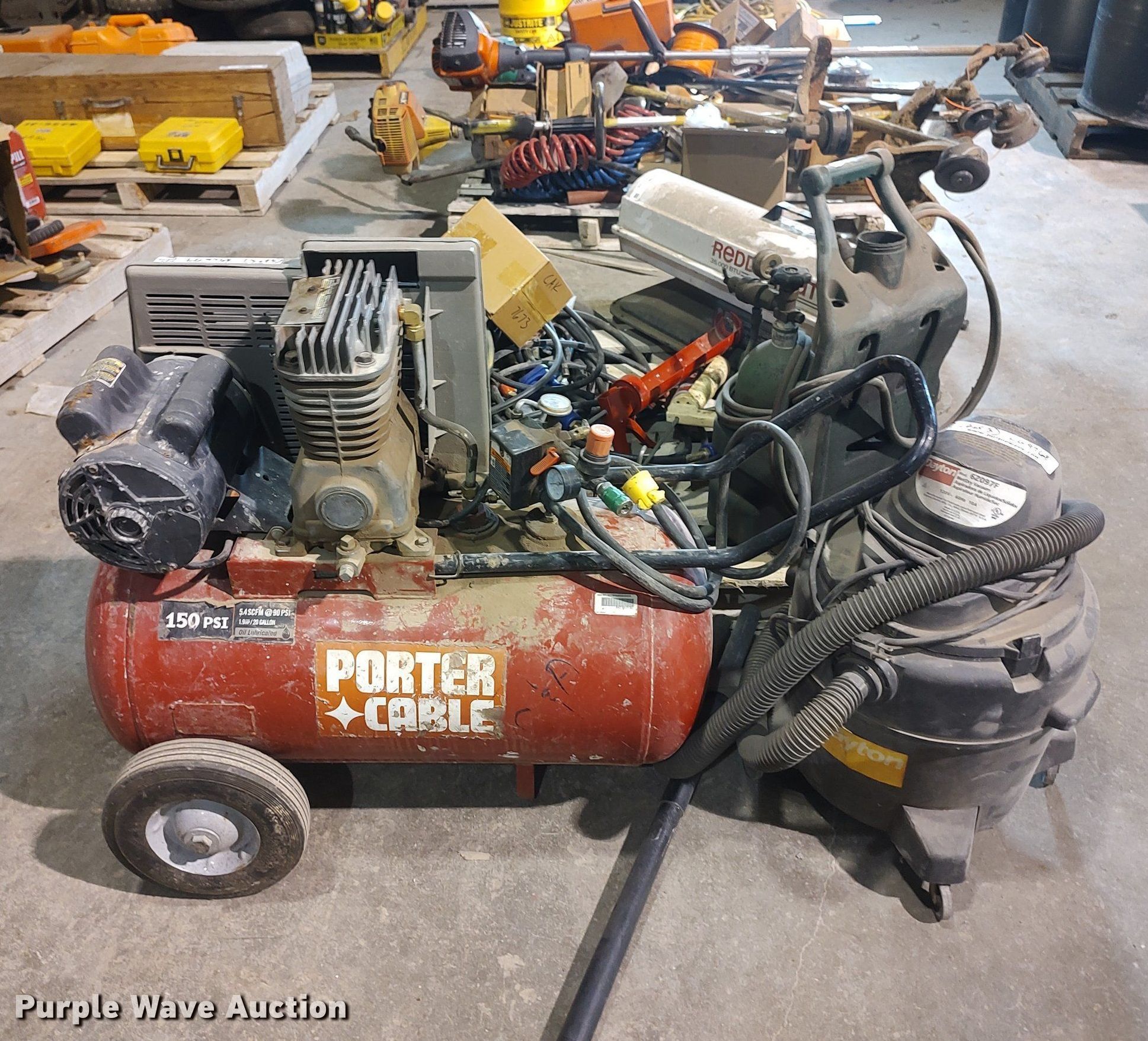 Purple Wave is selling a used Tools in Kansas. This item is a Tools with the following: Porter-Cable air compressor, Reddi 35000 heater, Acetylene bottle, Torch hoses, Dayton wet/dry vacuum, Caulking guns, Material rollers