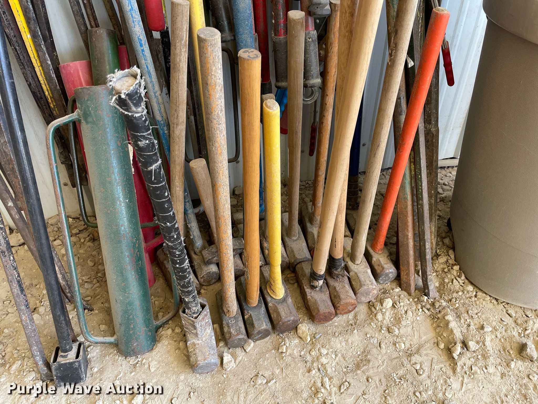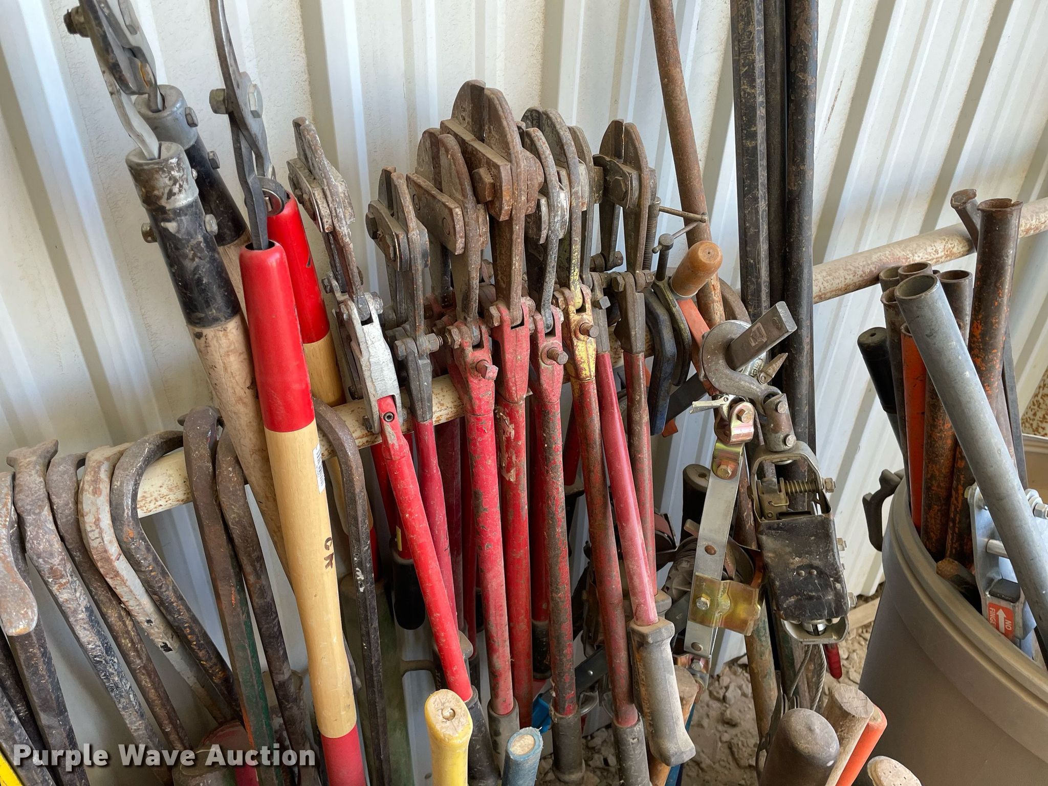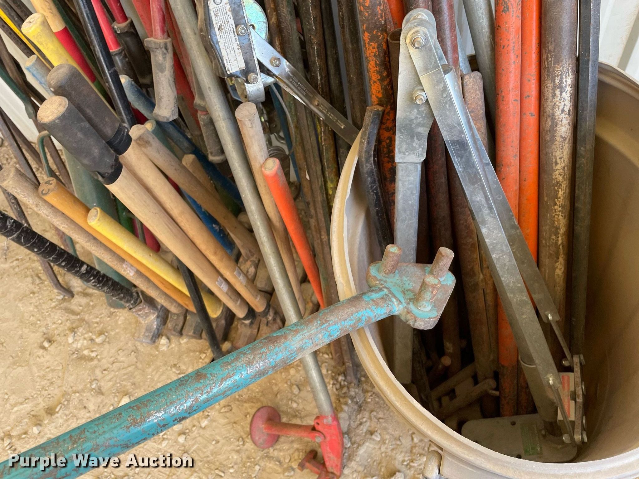 Purple Wave is selling a used Tools in Kansas. This item is a Tools with the following: Approx. 25 crowbars, Approx.18 sledge hammers, (8) bolt cutters, (6) t-post drivers, (2) hedge clippers, Stake pullers, Barrel, Ratchets and more